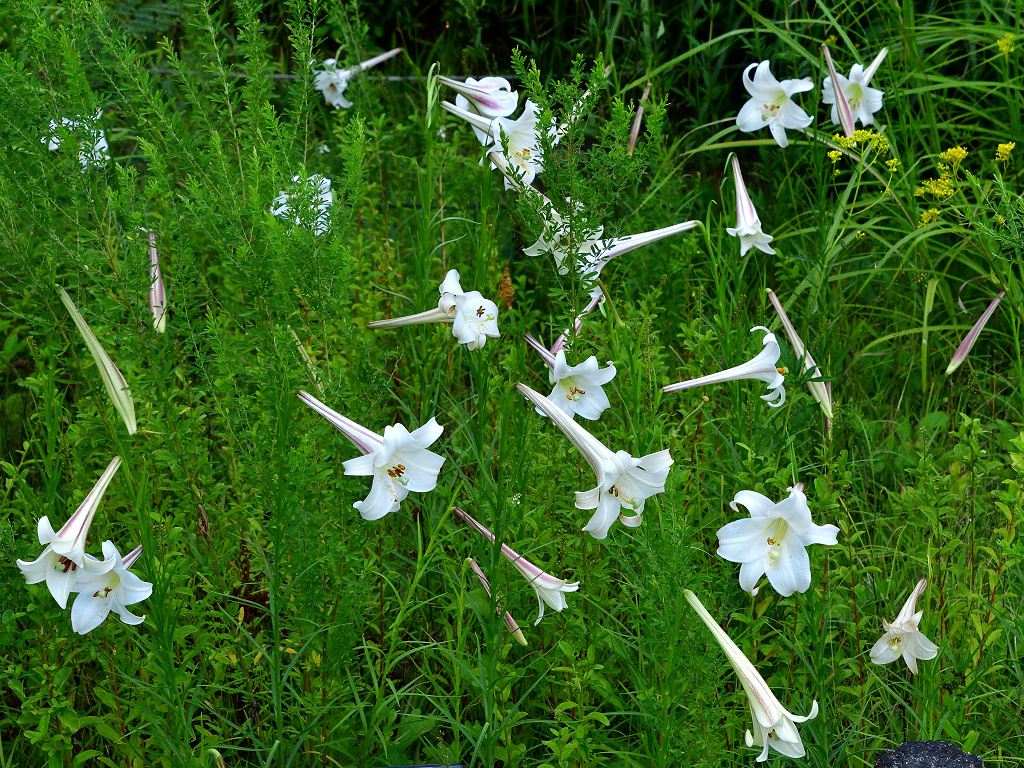 台湾に自生していたユリが大正時代に日本に入り、各地に野生化したもの テッポウユリに似ているが、本種は花弁に淡紫の斑が入る