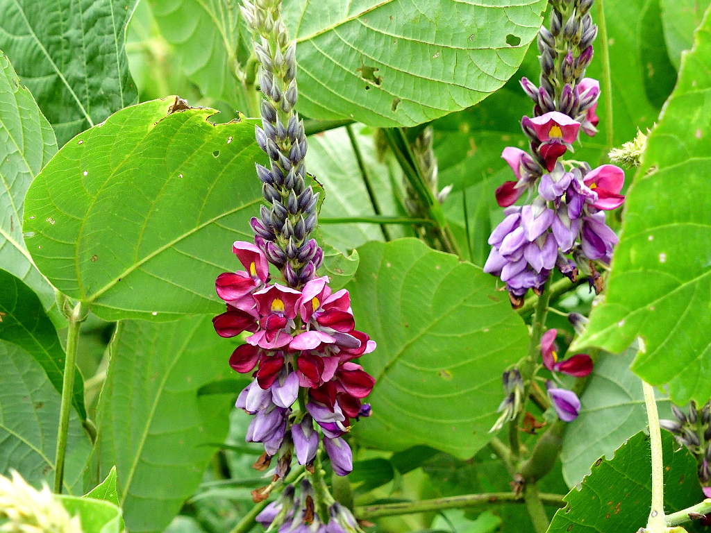 葉の脇から伸びた花柄に沢山の花を付ける 上の花弁の基部に黄斑があり、翼弁2枚下側に2枚の花弁がある