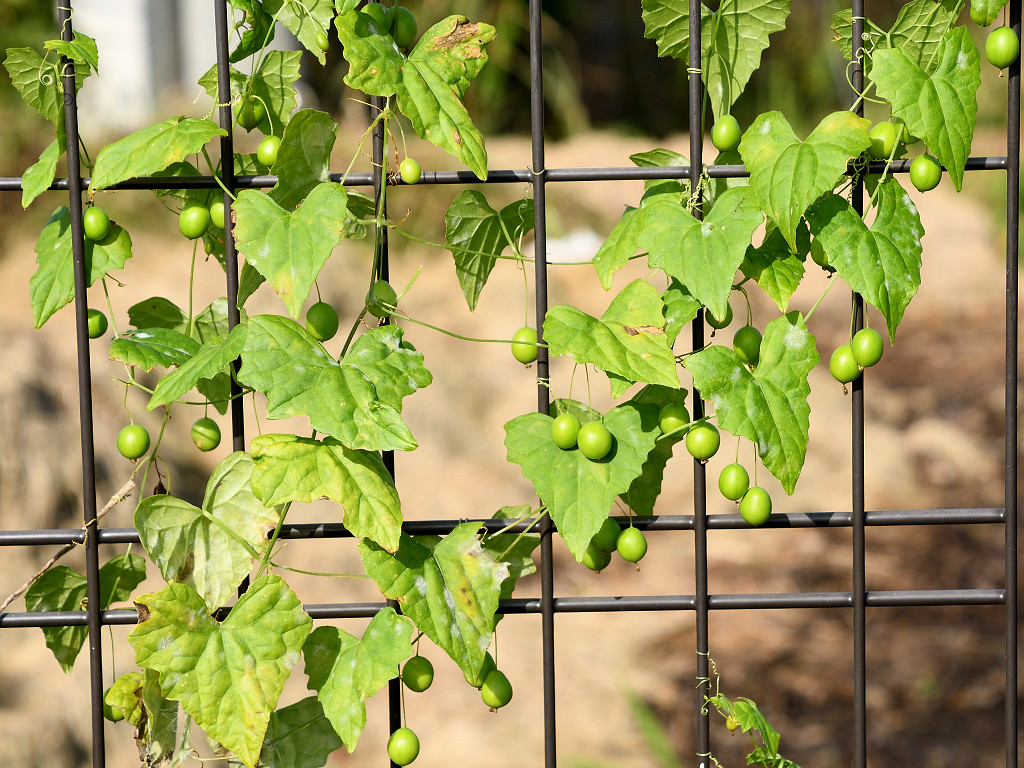 「カラスウリ」に比べて、著しく小さいので「スズメウリ」