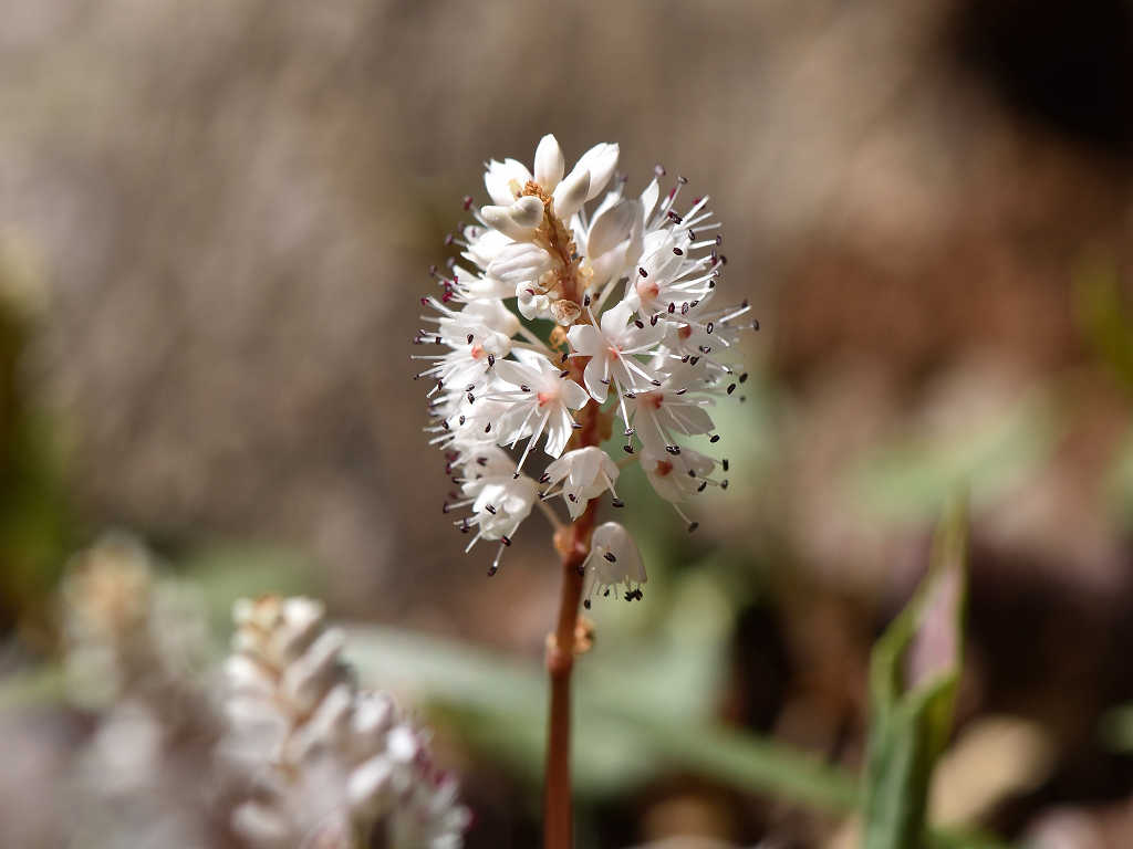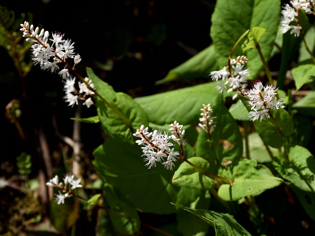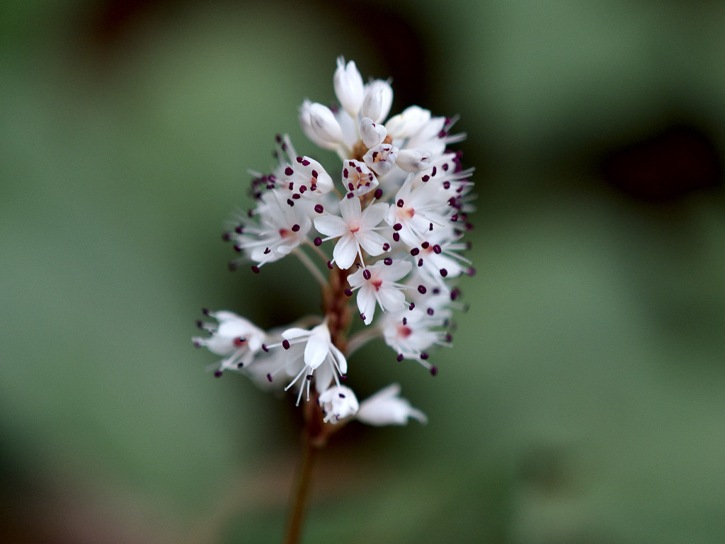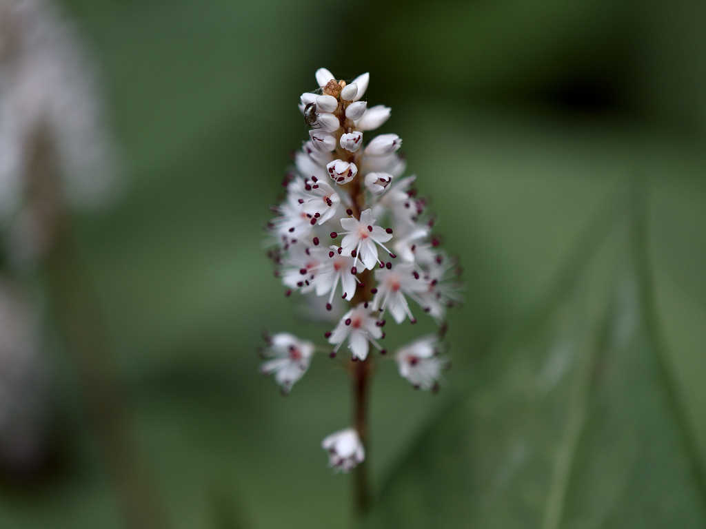 花は穂状花序で、花柄が長いのでややまばらにつくように見え、白色で5深裂する