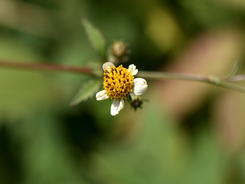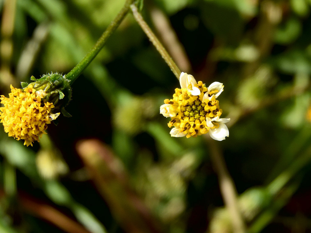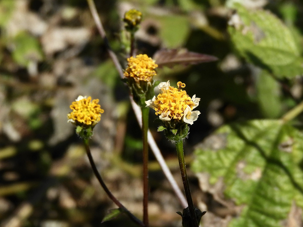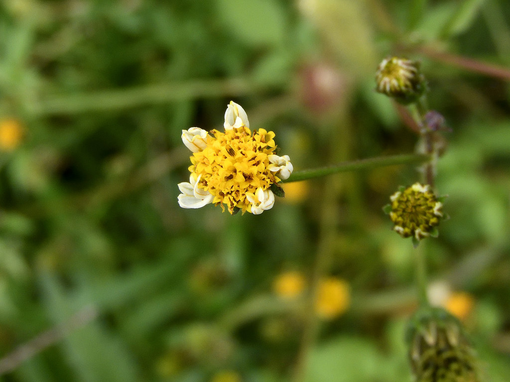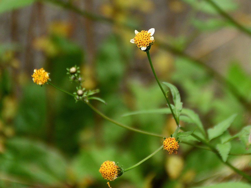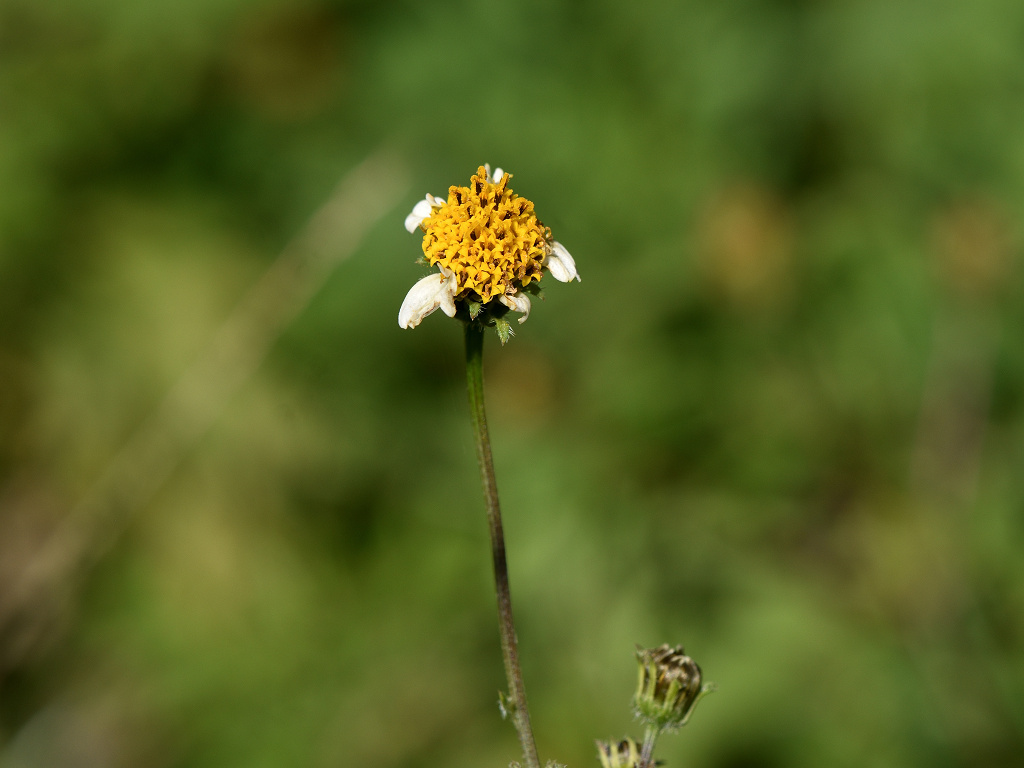 枝先に長い花柄を出し 直径約1aの両性の黄色い筒状花を1個つけ 外周の数個の筒状花が白色になる