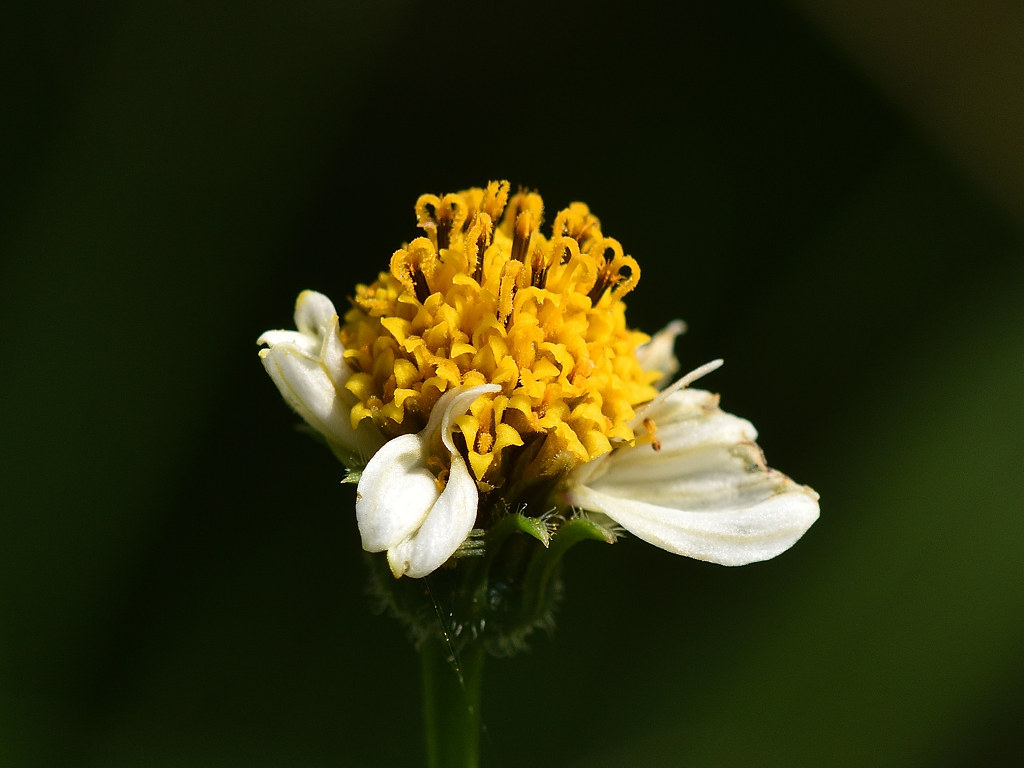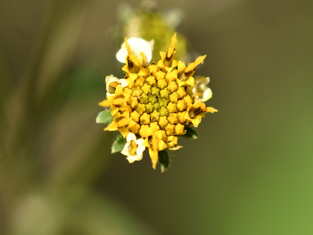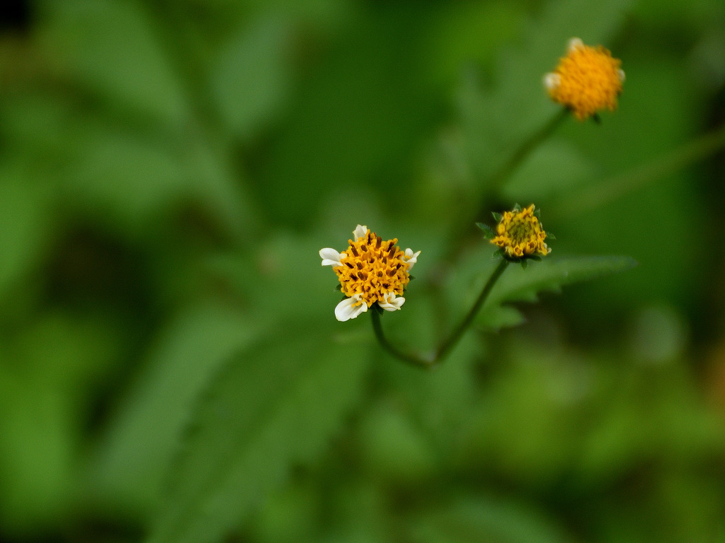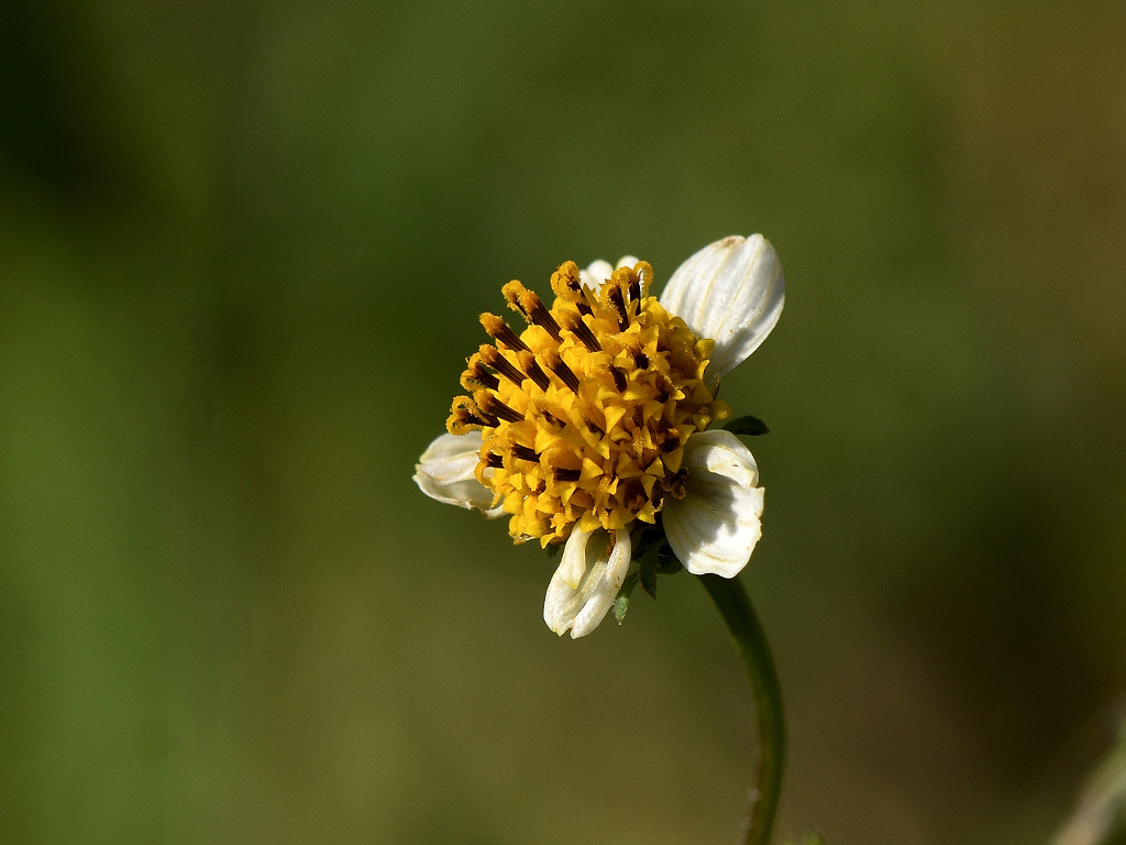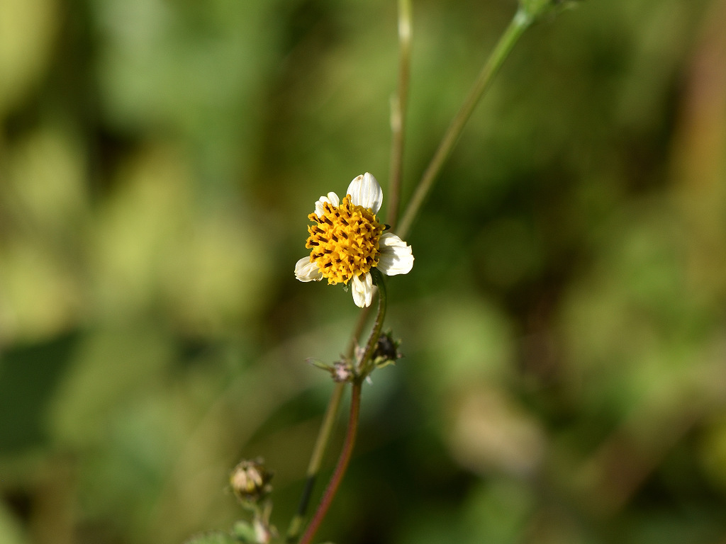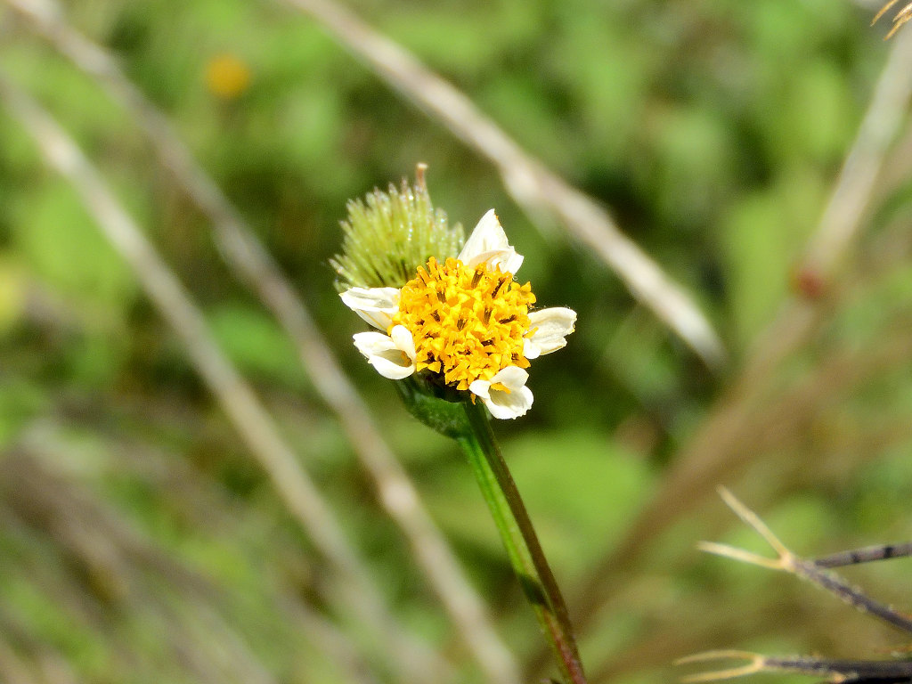 枝先に長い花柄を出し 直径約1aの両性の黄色い筒状花を1個つけ 外周の数個の筒状花が白色になる