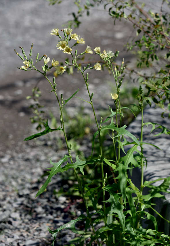 茎は分枝せず、直立し、茎を切ると白い乳液が出る。葉は互生し、茎の上部の葉は全縁で小さく、下部の葉は長さ10〜30p、羽状深裂し、裂片の先が尖る 草丈 90-200センチ