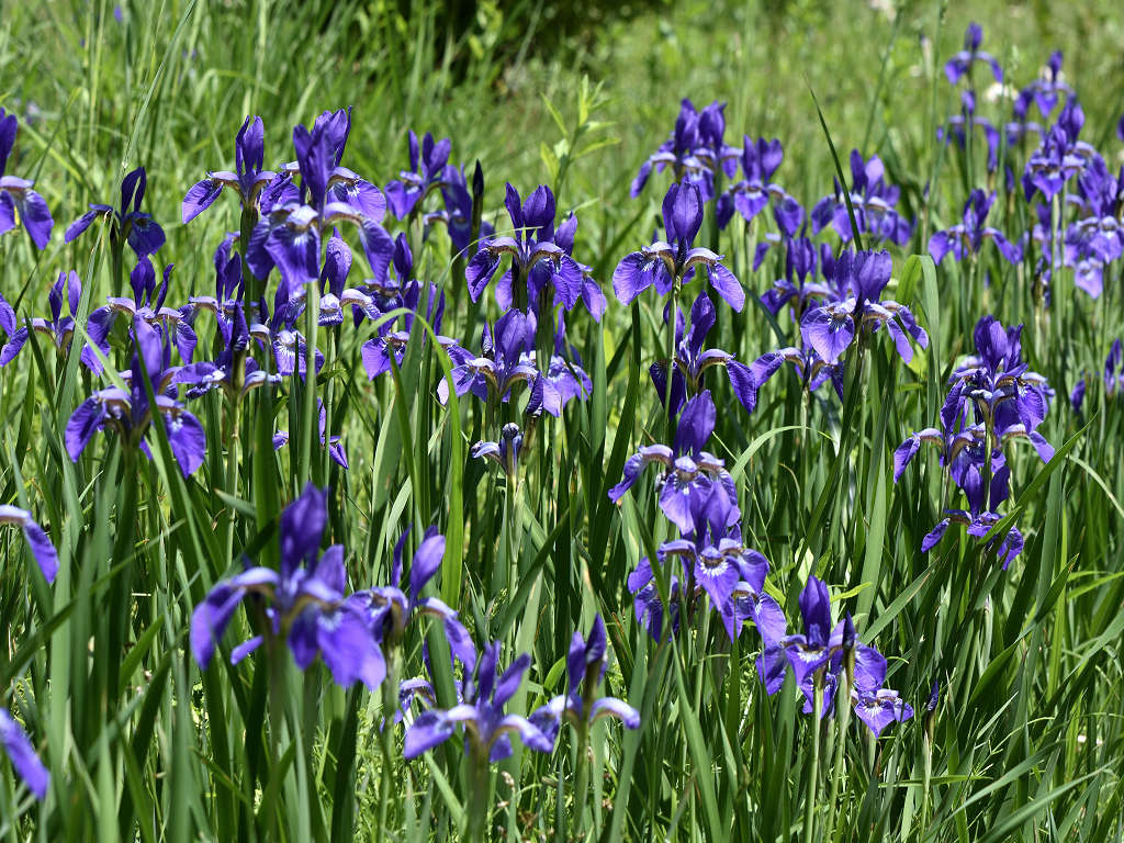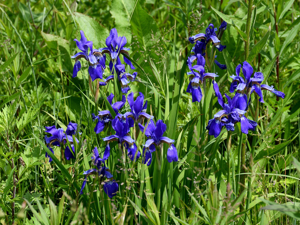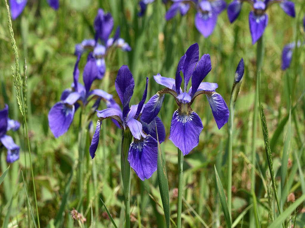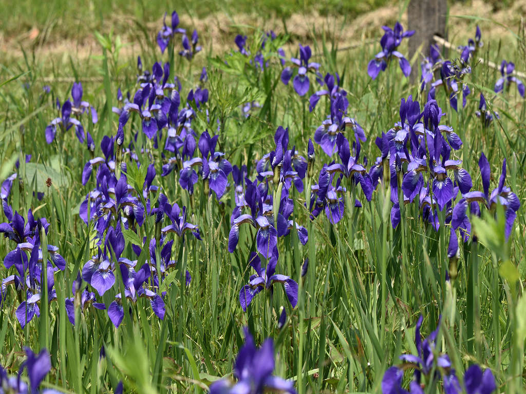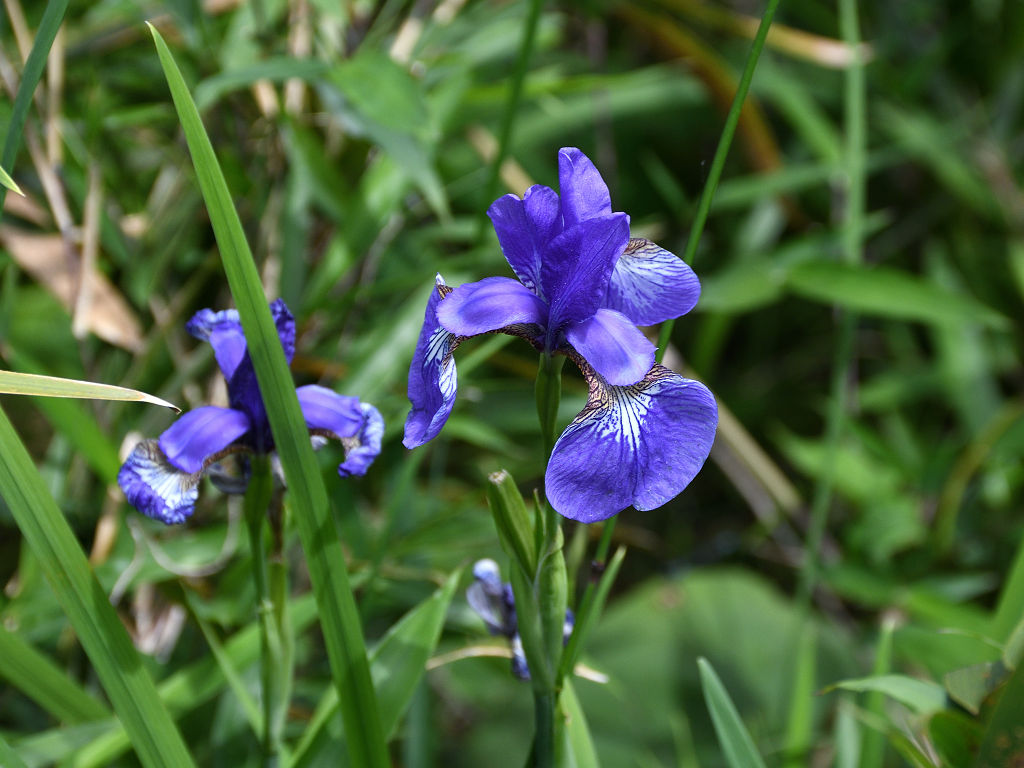 | 花の特徴 | 茎先に花径5〜8センチくらいの青紫色の花を1〜3輪くらいつける。内花被片と外花被片が3枚ずつある。外側に3枚の大きな花びら(外花被片)が垂れ下がる 葉は剣状で直立 「カキツバタ」は花弁の元に白い目型の模様がある 「アヤメ」は網目 「ハナショウブ」は黄色の模様で違いがわかる |