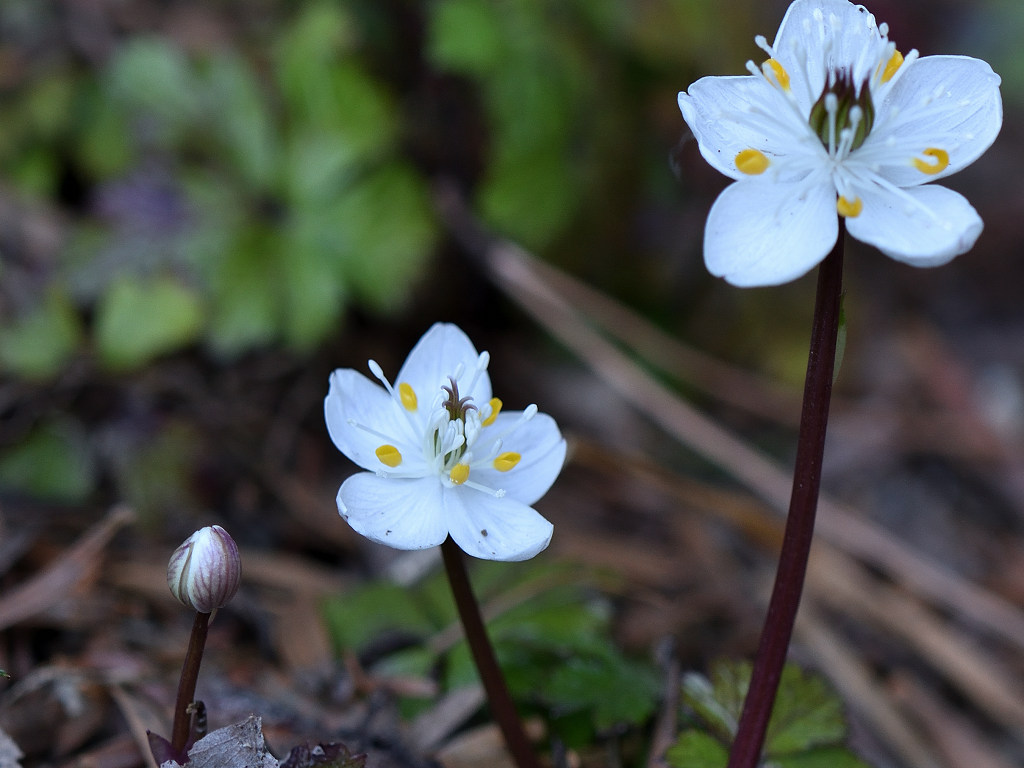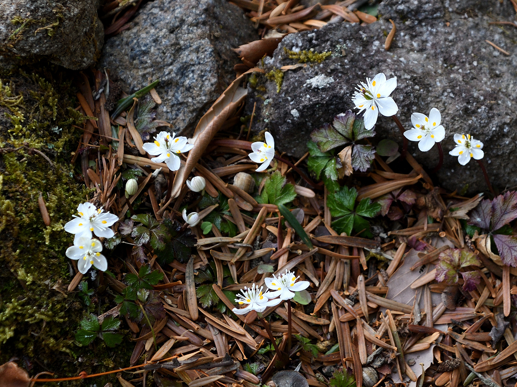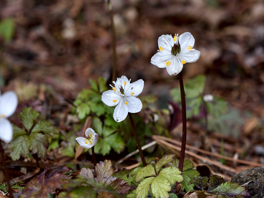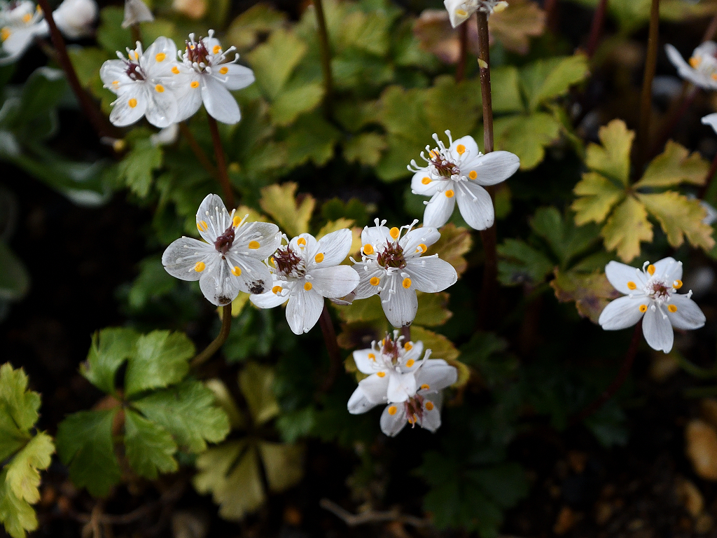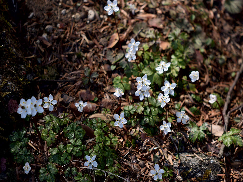 花びらは白 梅に似た花が咲く 「オウレン」の仲間なのでバイカオウレン