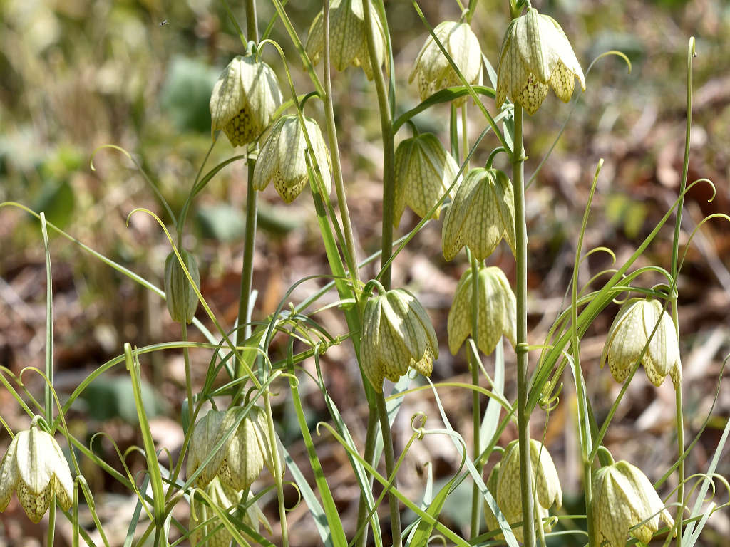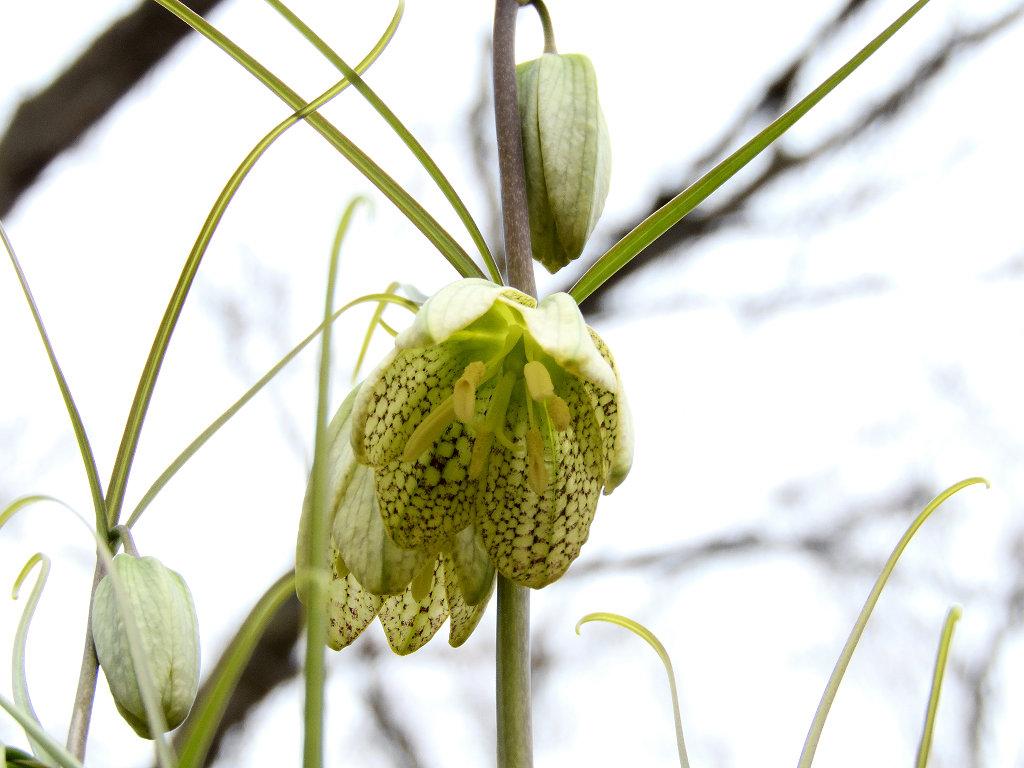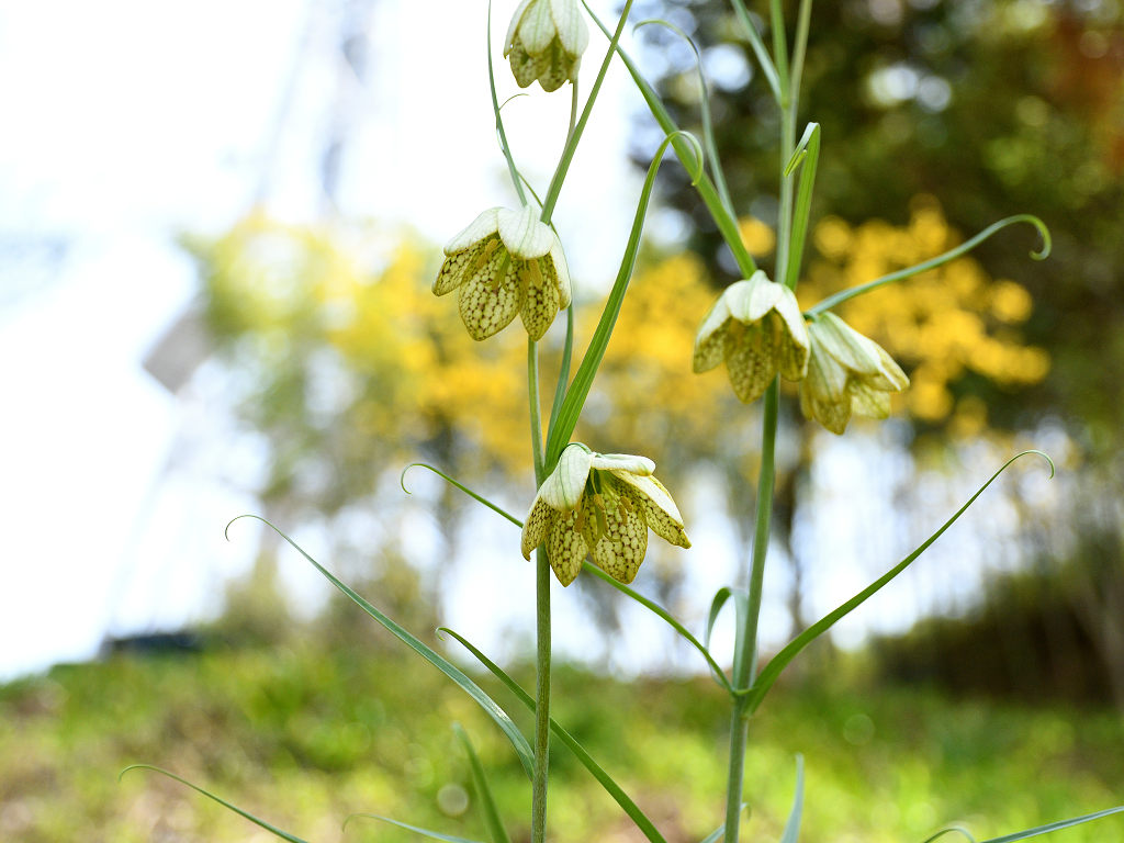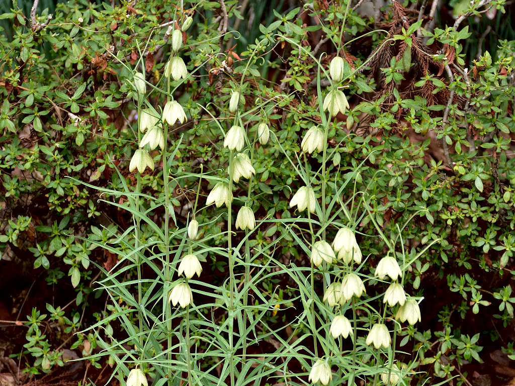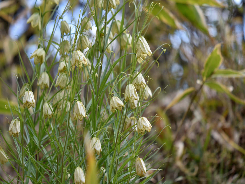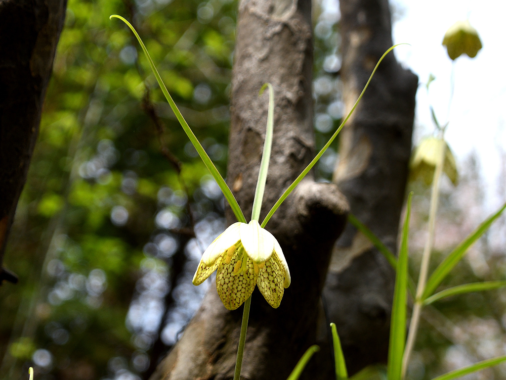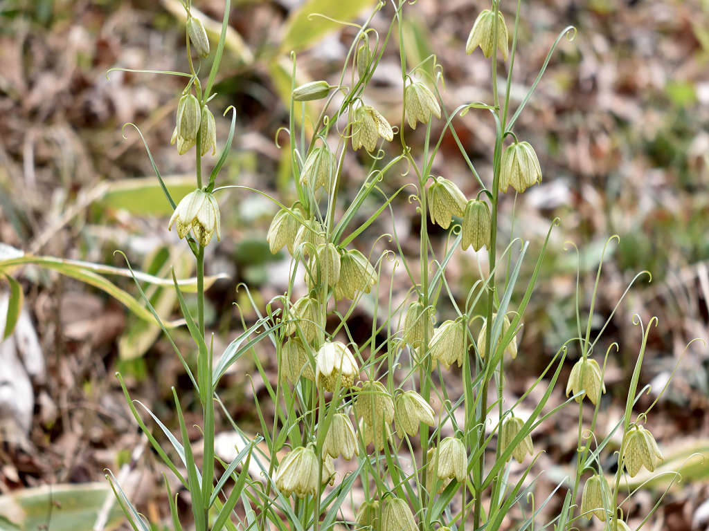釣り鐘型の花を下向きに咲かせ、細い葉の先端が巻く