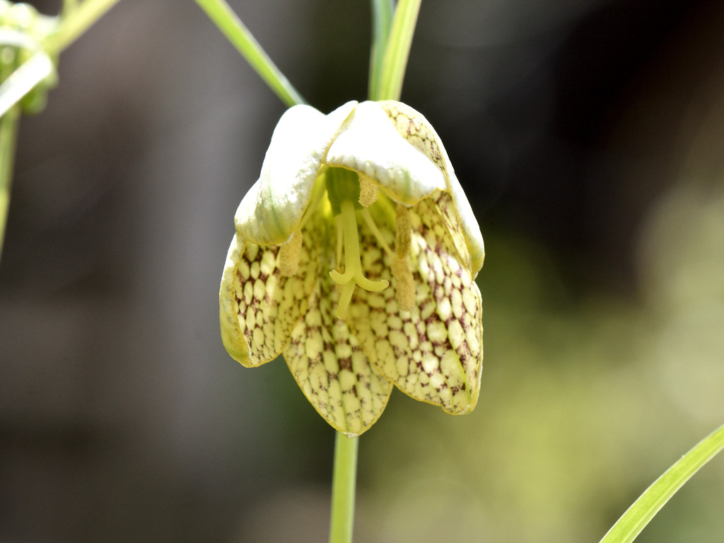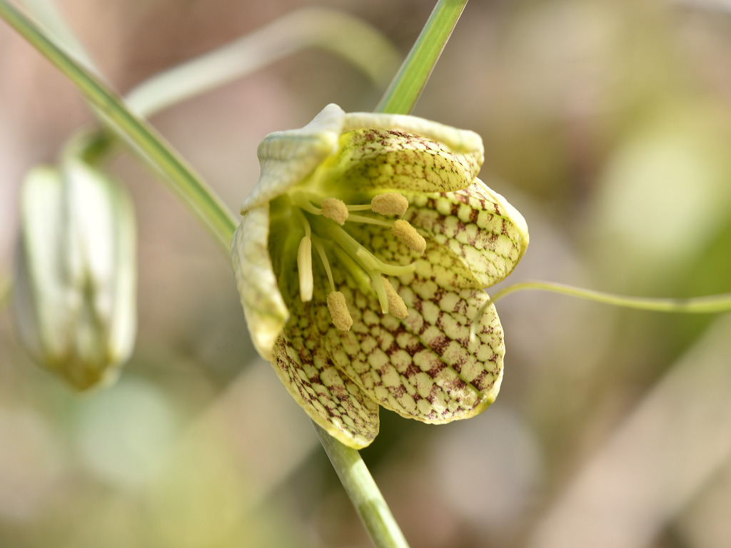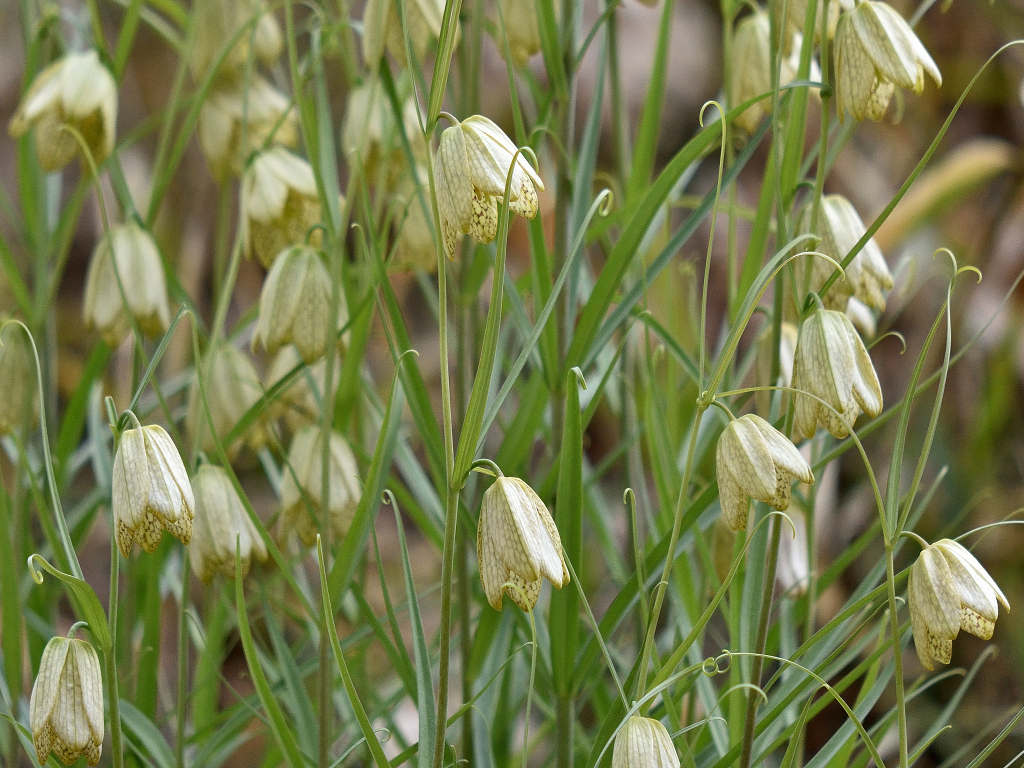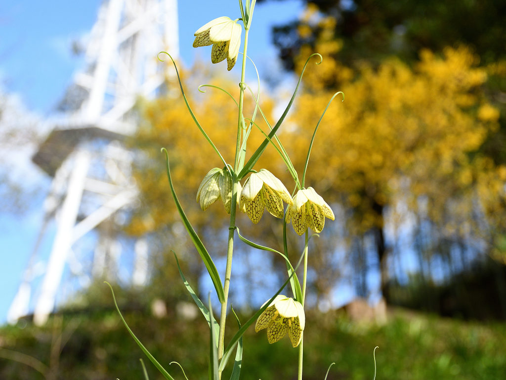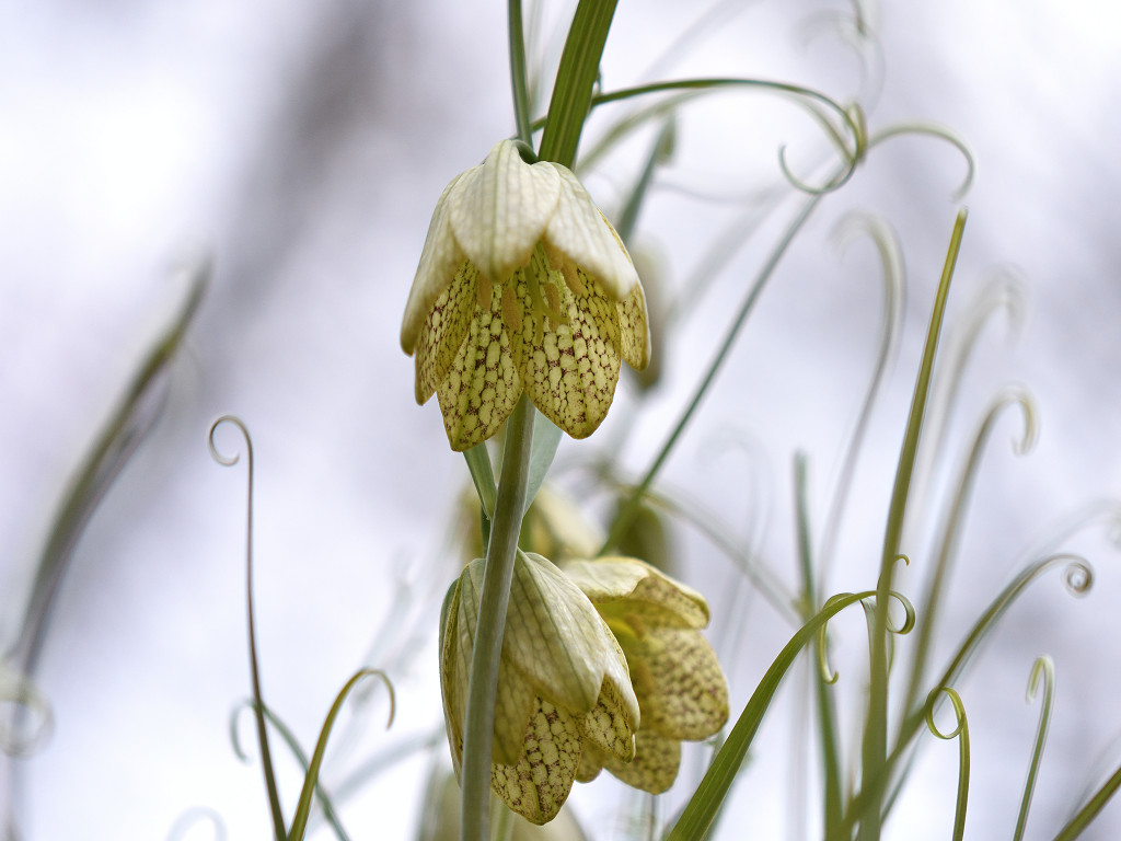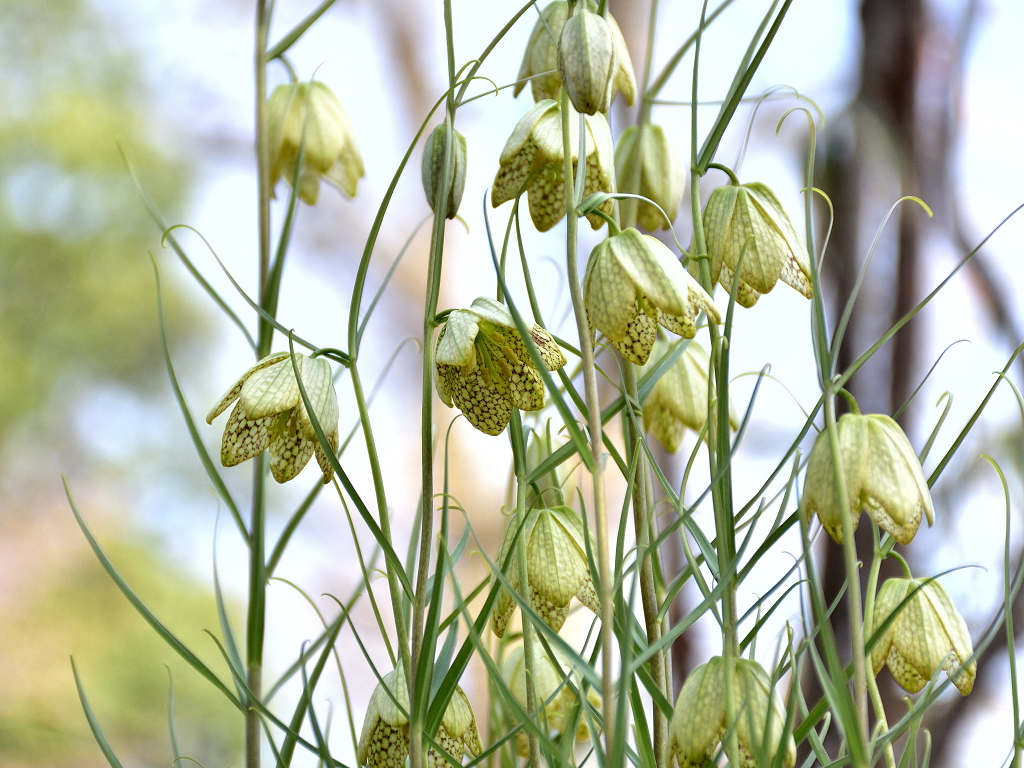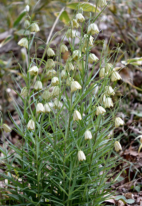 釣り鐘型の花を下向きに咲かせ、細い葉の先端が巻く