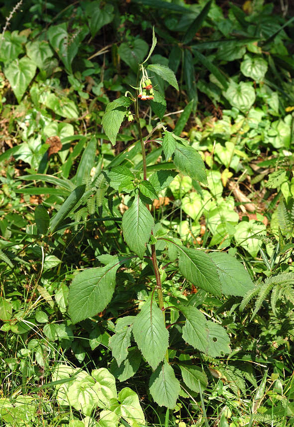 筒状花の集合した紅色の花 草丈40-70センチ 上部で枝分かれしその先に花を付ける