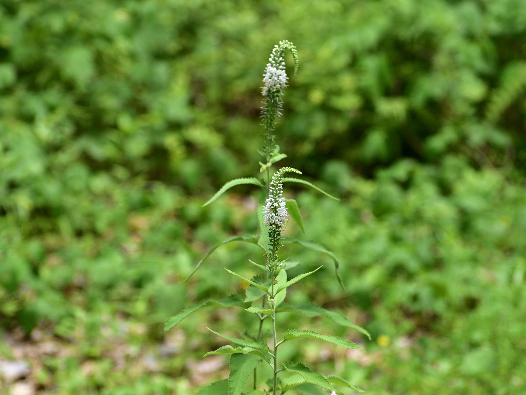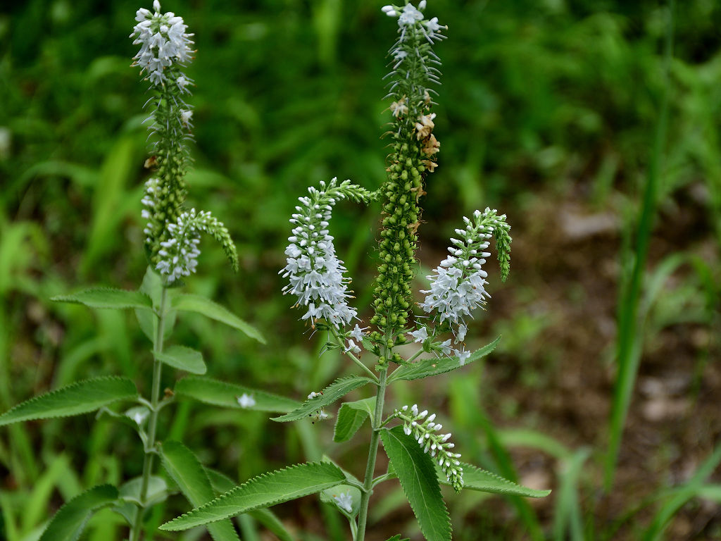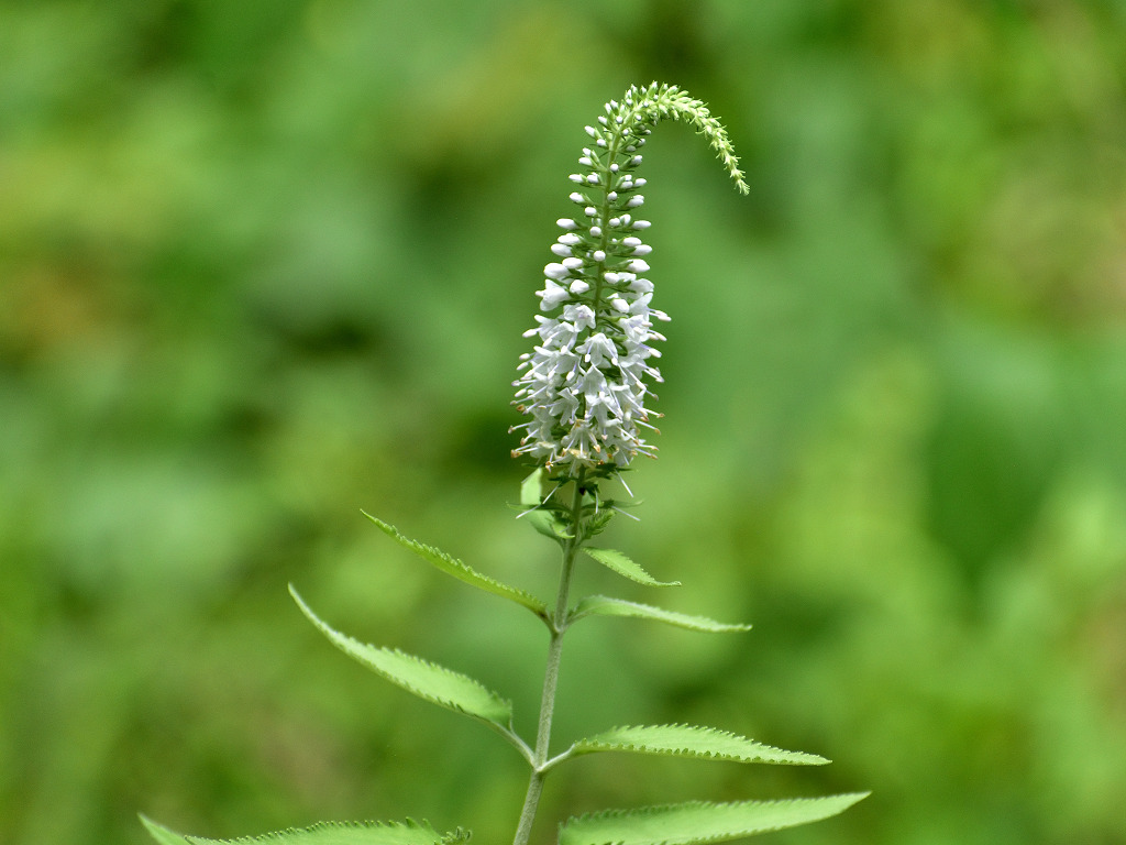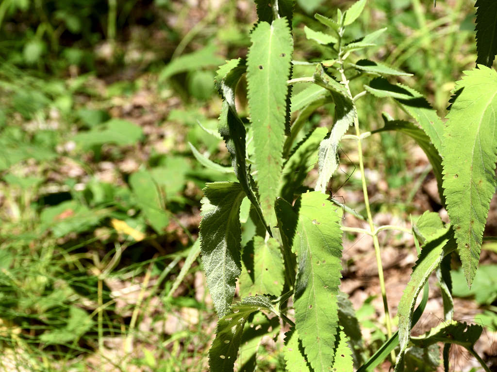 茎は直立し上部で枝分かれする 葉の両面に白い軟毛が生える 葉は対生し鋭い鋸歯がある 花はトラノオと同じ