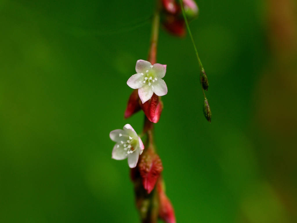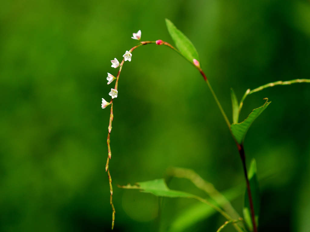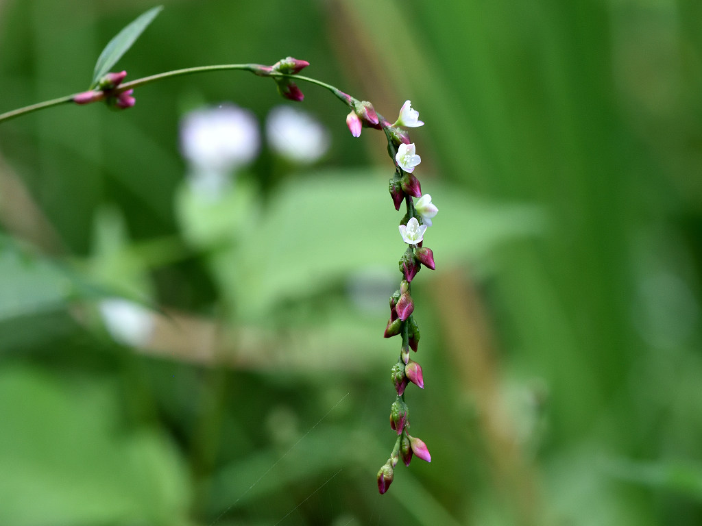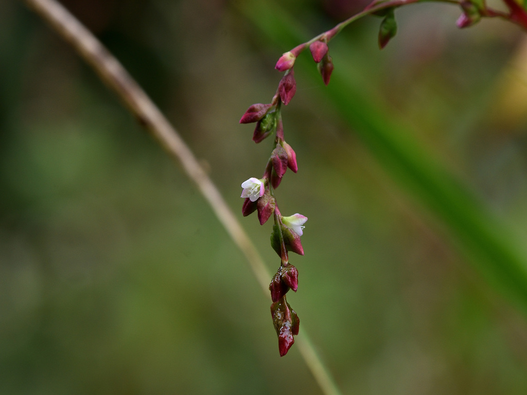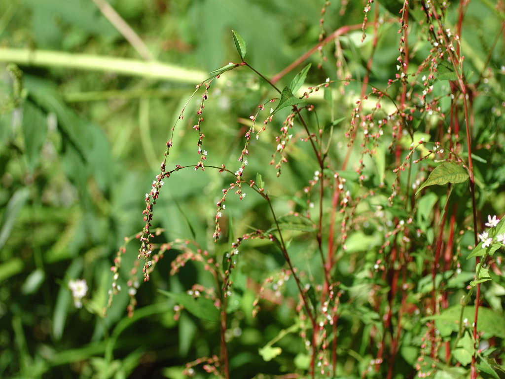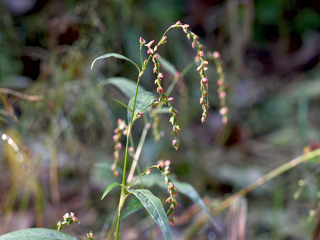 花序は紐状、先が垂れ下がり、淡紅色の小さな花をまばらにつける 草丈70-100センチ