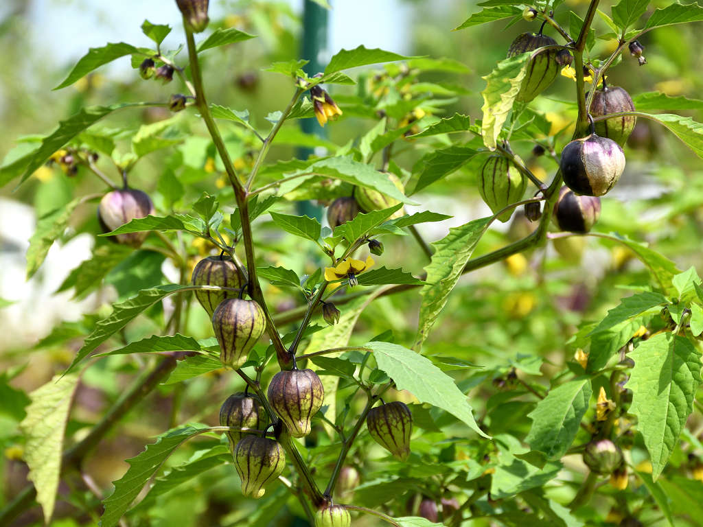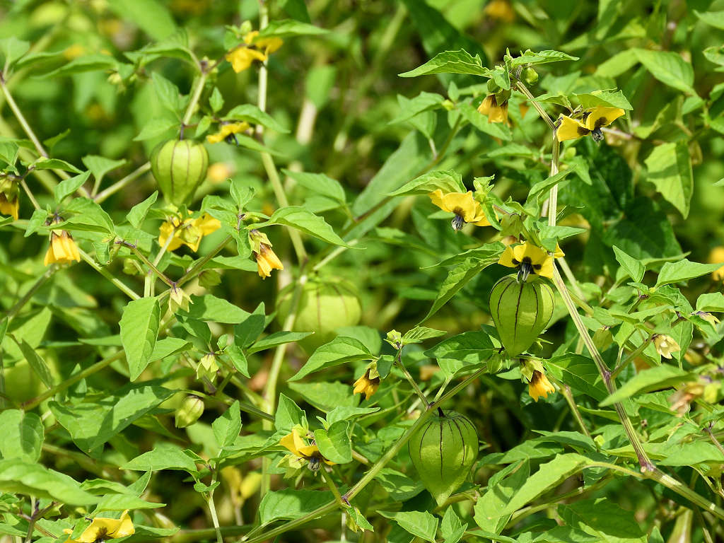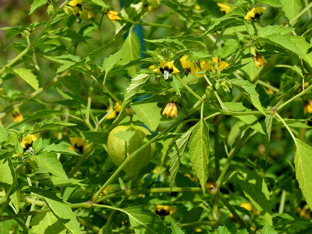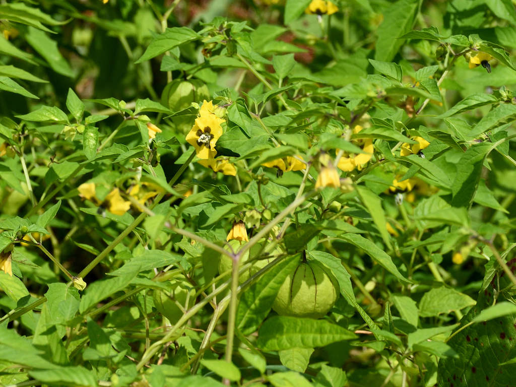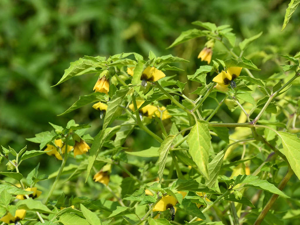 黄花の盃状花で、花冠は5裂 花低に濃紫褐色の模様が入る 花後萼が肥大化しホオズキのような形状になる