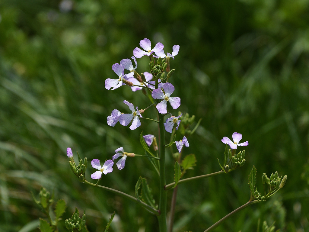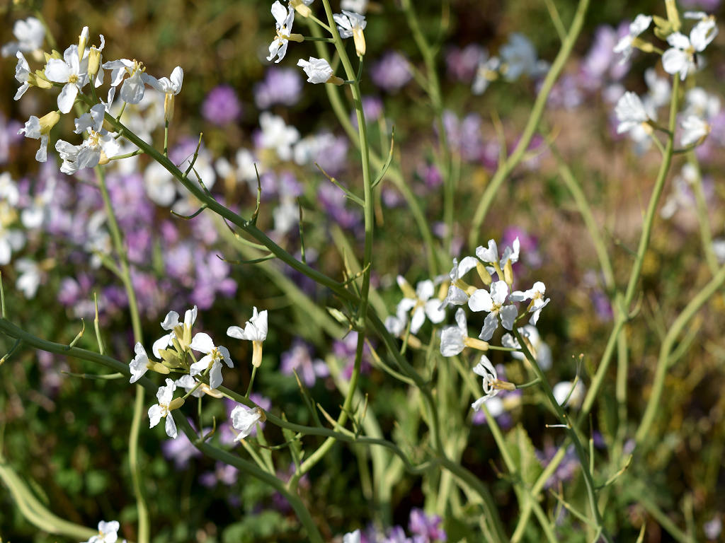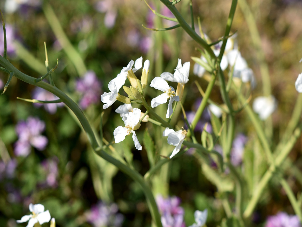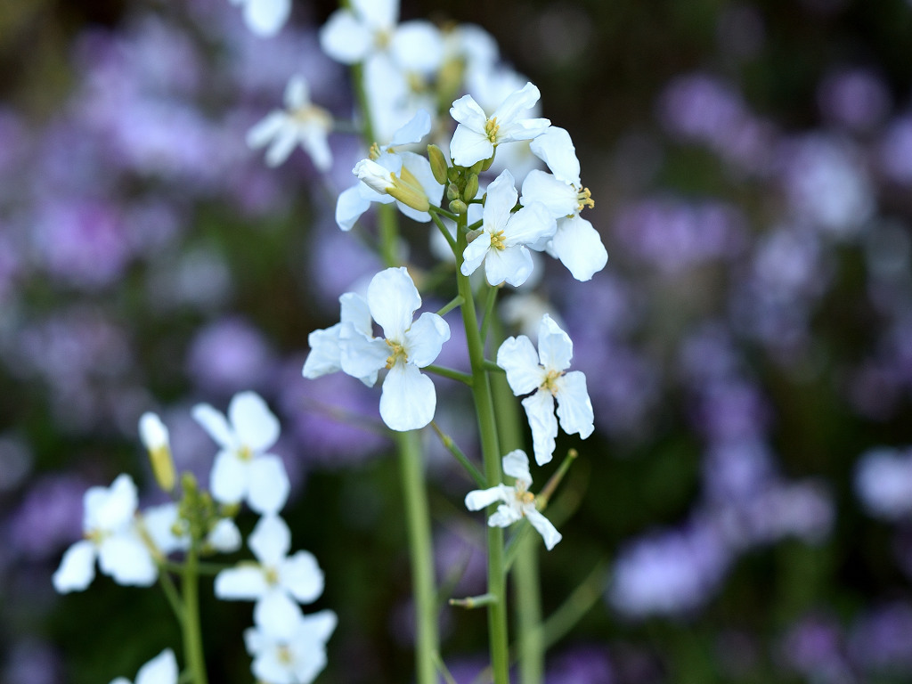 白または淡い紫色をした十字形の4弁花をたくさんつける 春の七草の一つ清白(スズシロ)は大根(ダイコン)のこと