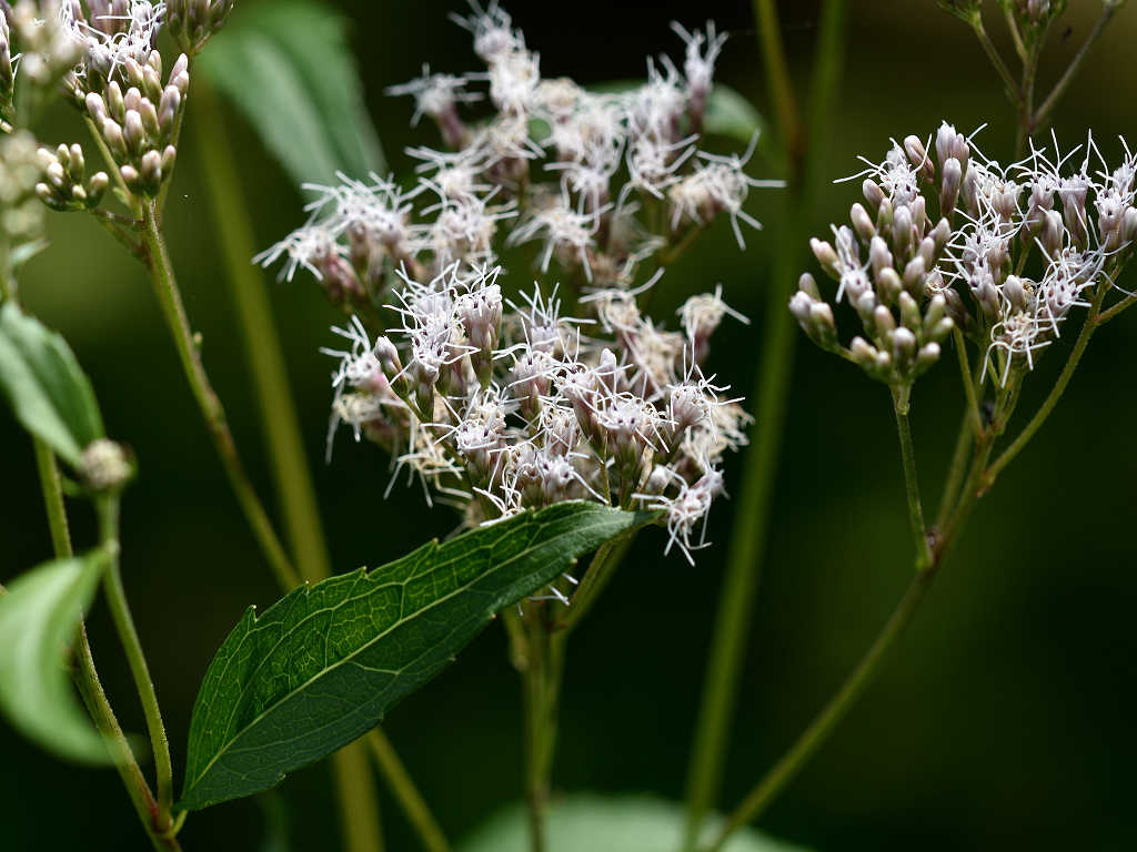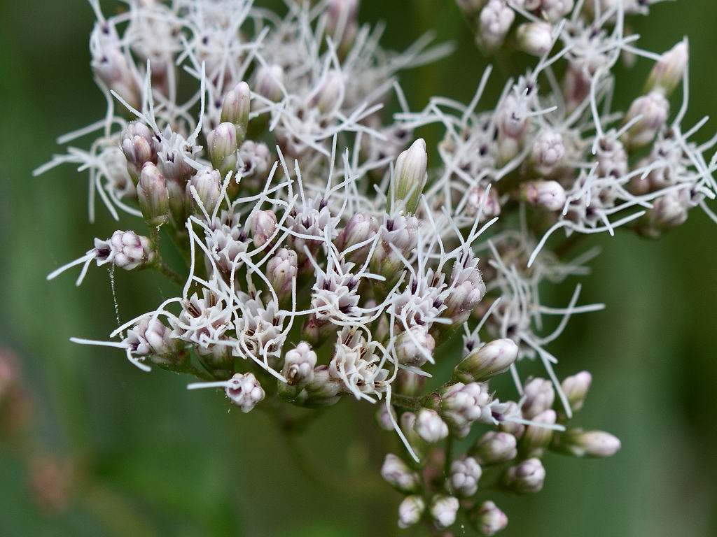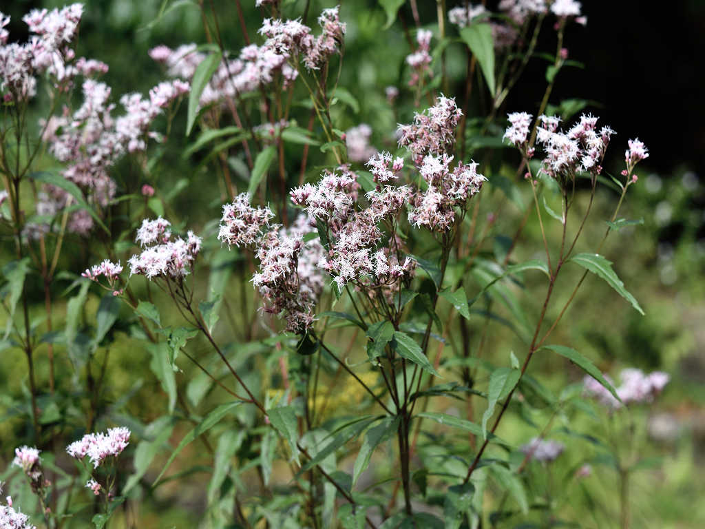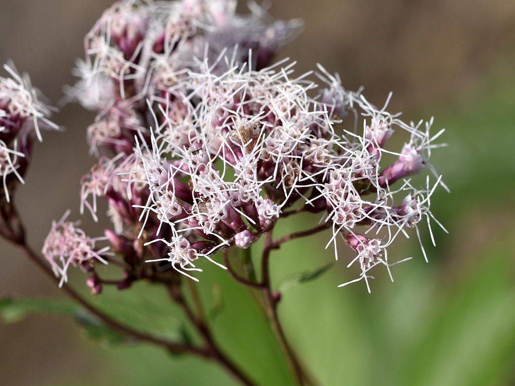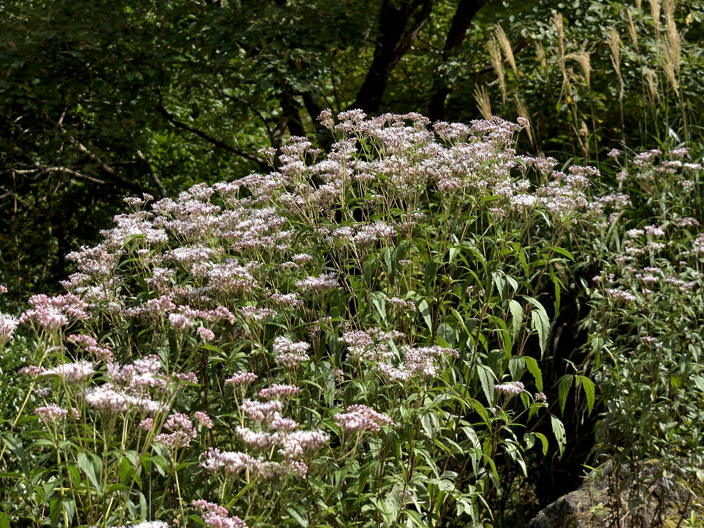 草丈100-150センチ い紅紫色をした筒状花だけの小さな頭花を散房状(柄のある花がたくさんつき、下部の花ほど柄が長いので花序の上部がほぼ平らになる)にたくさんつける。