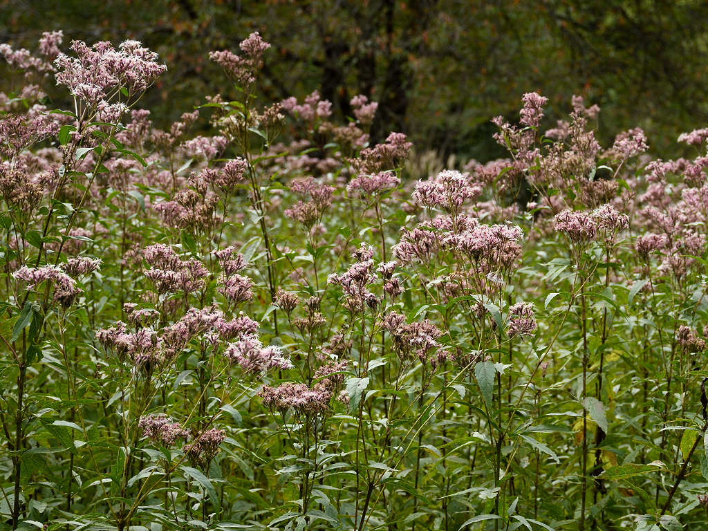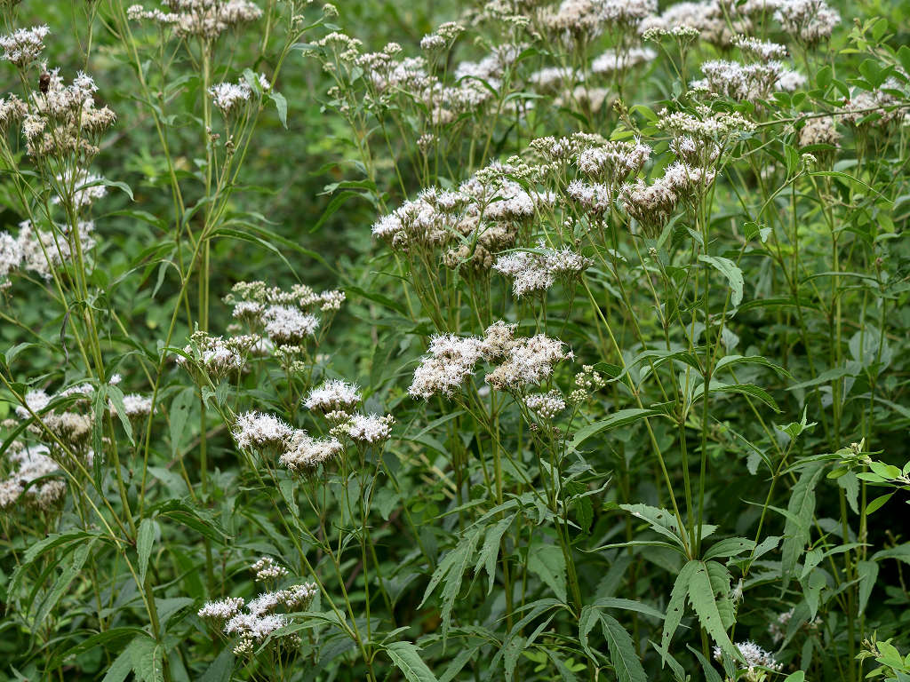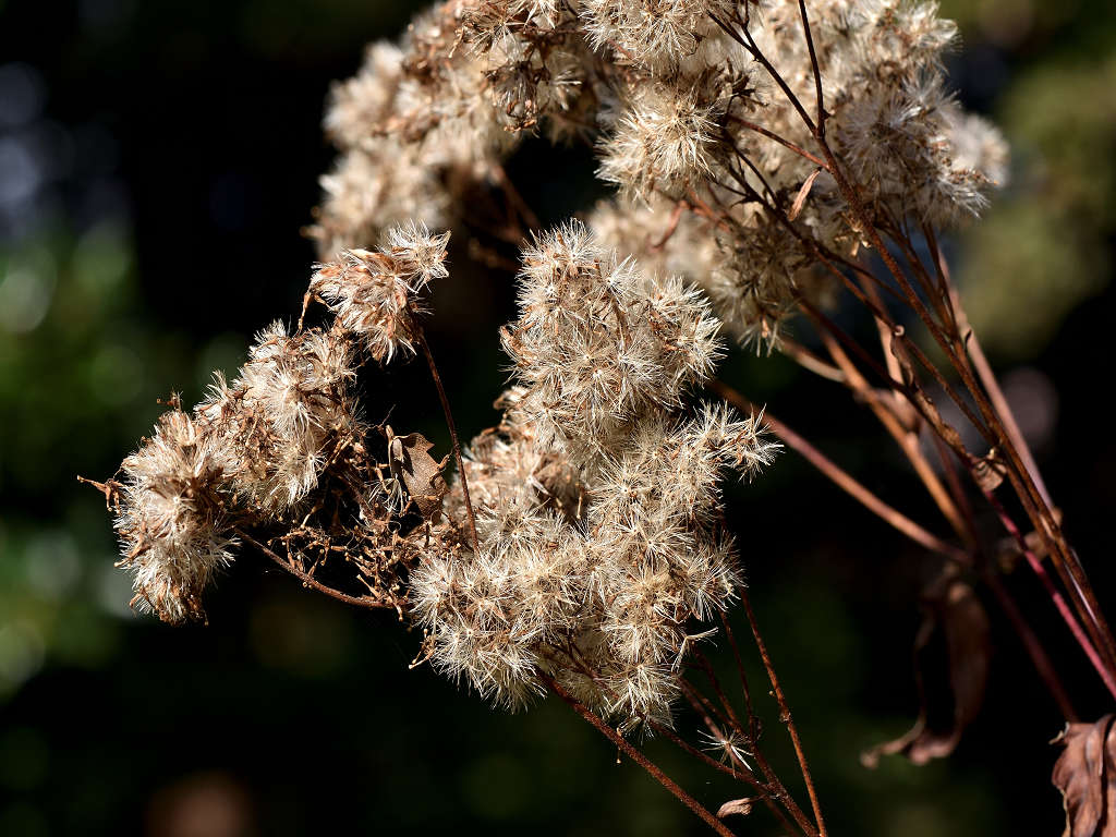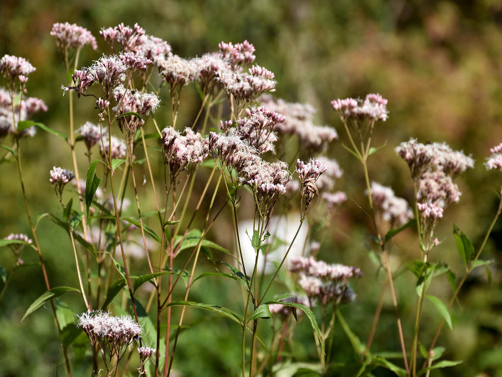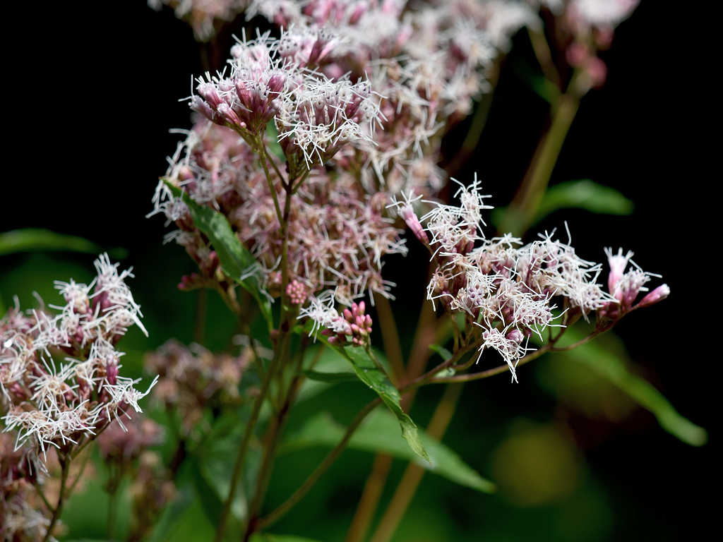 草丈100-150センチ い紅紫色をした筒状花だけの小さな頭花を散房状(柄のある花がたくさんつき、下部の花ほど柄が長いので花序の上部がほぼ平らになる)にたくさんつける。
