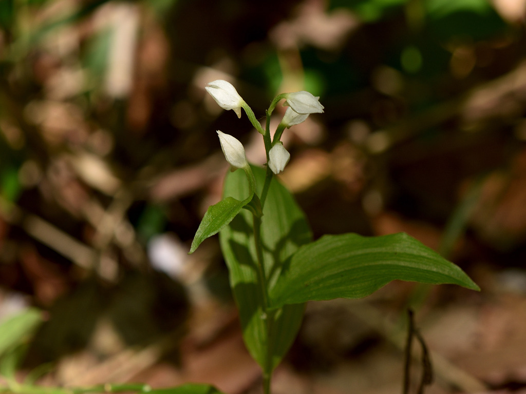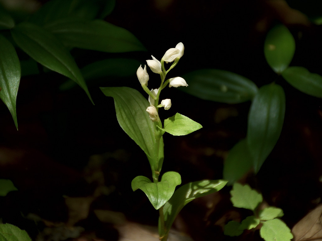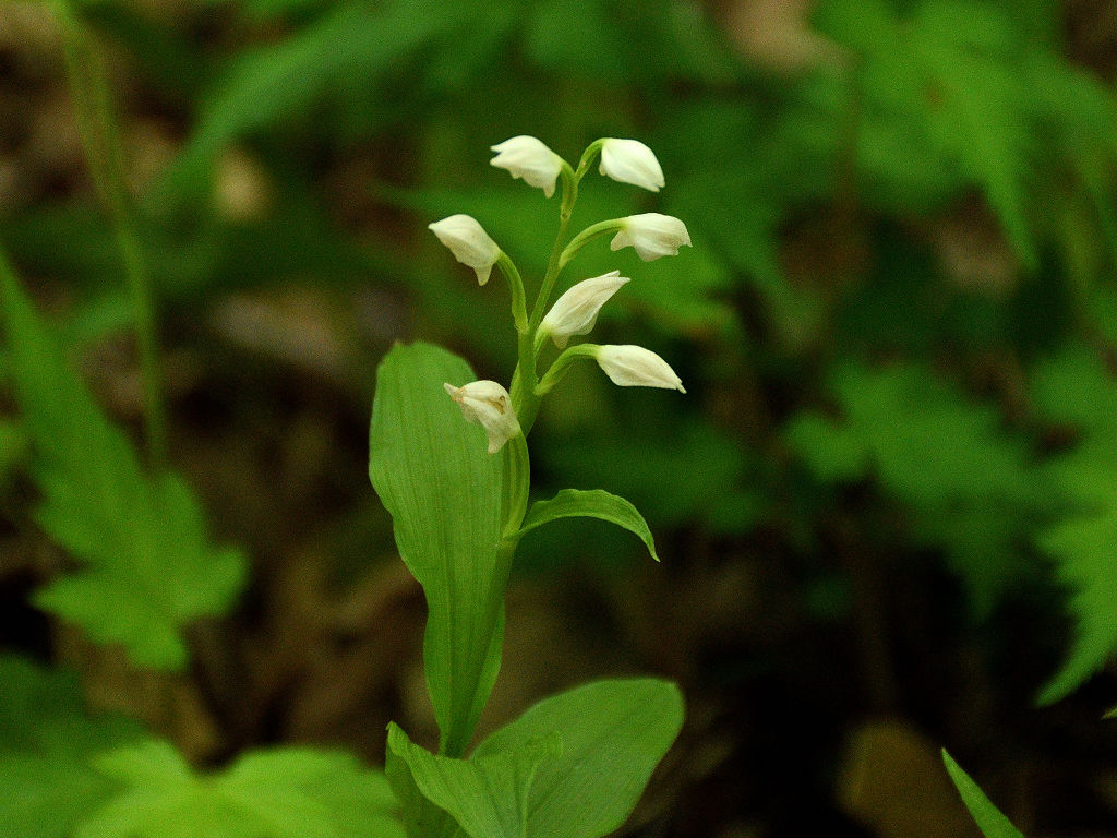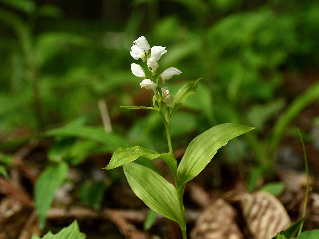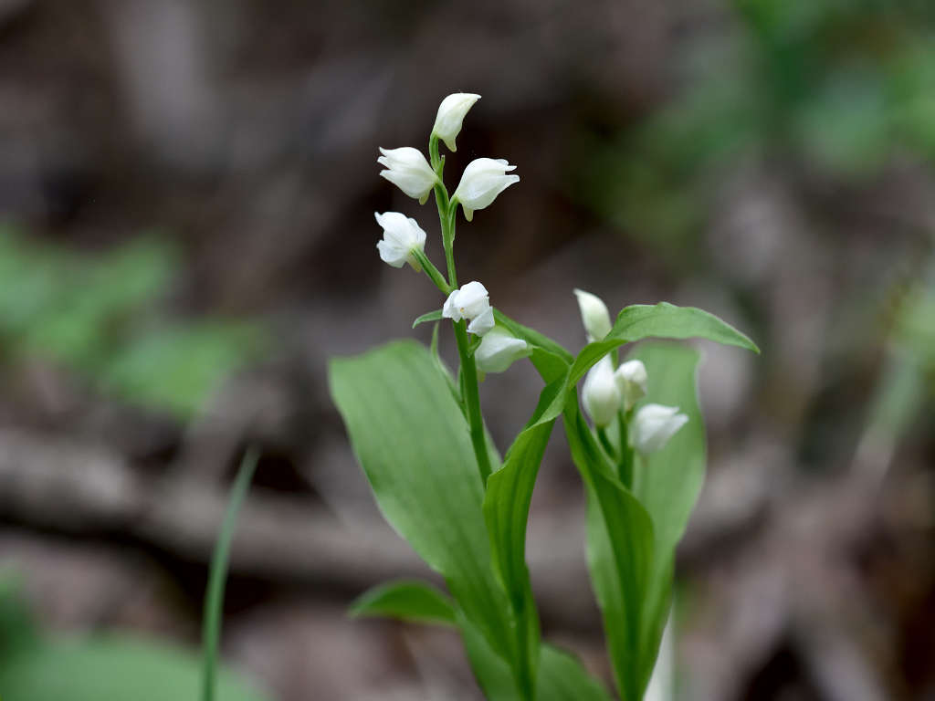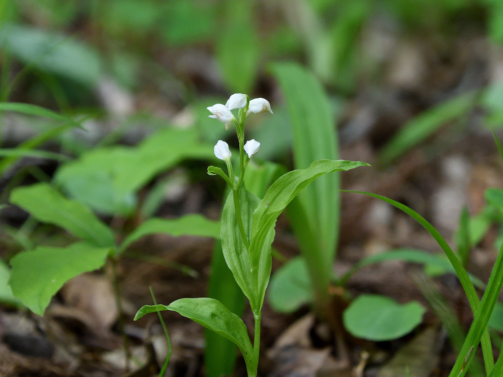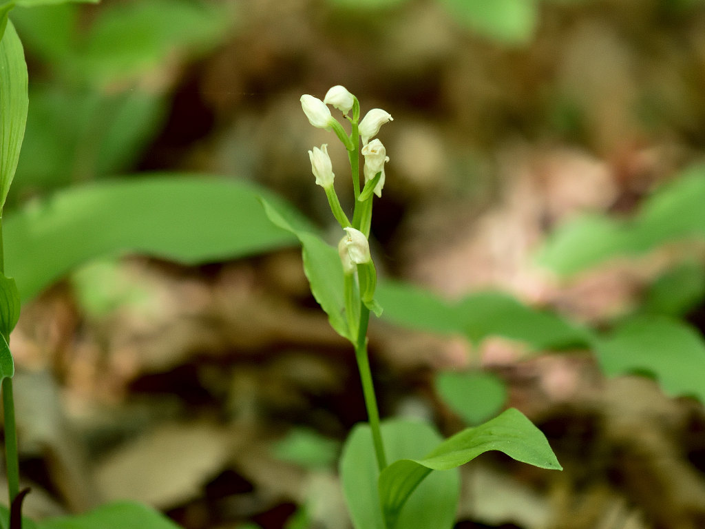 茎を直立させて茎頂に数個の白色の、ランの形の小さな花をつける 葉は茎に、5枚前後で互生、長さ5cmほどの広披針形で基部は茎を抱きます