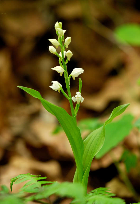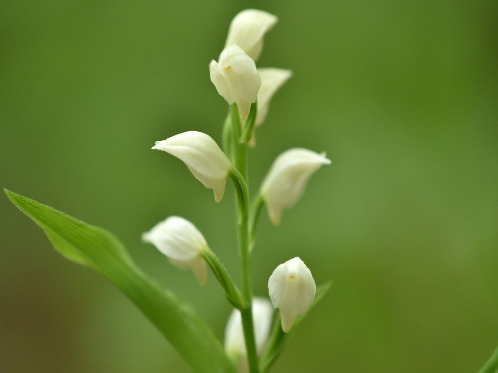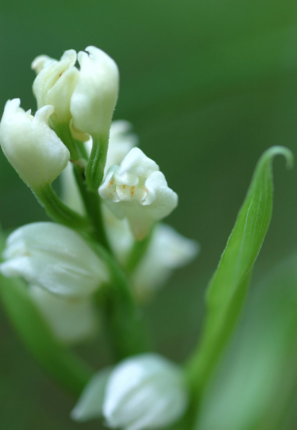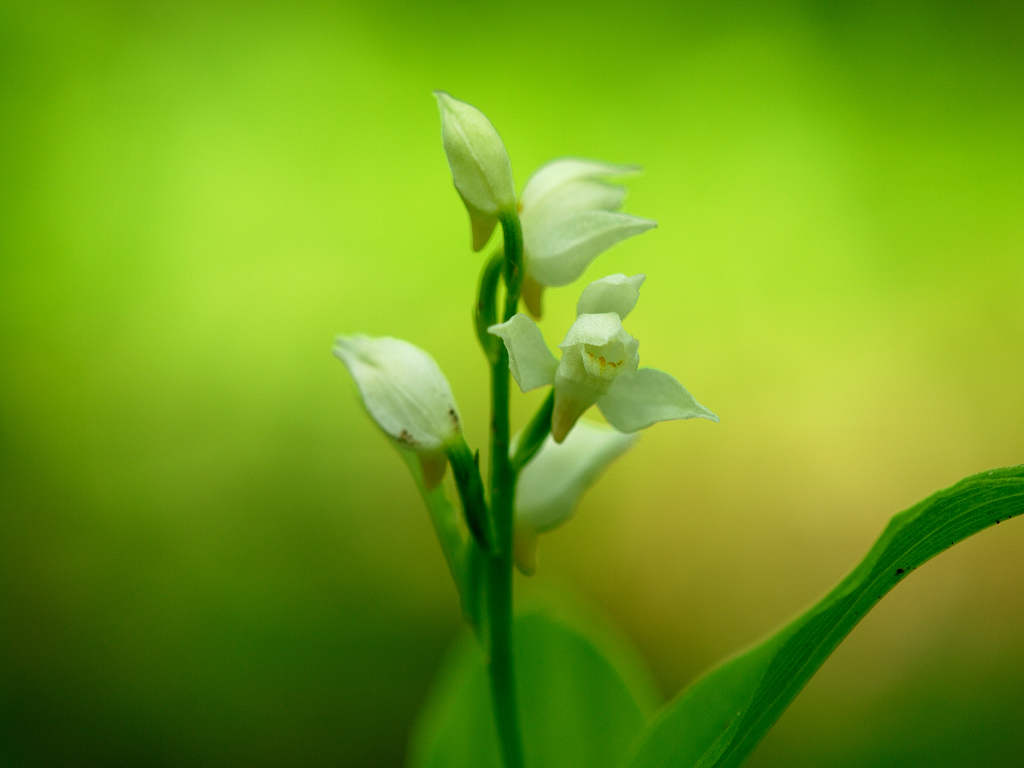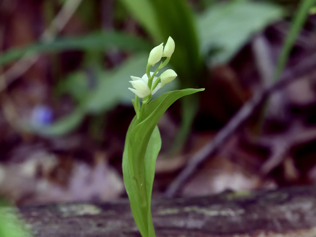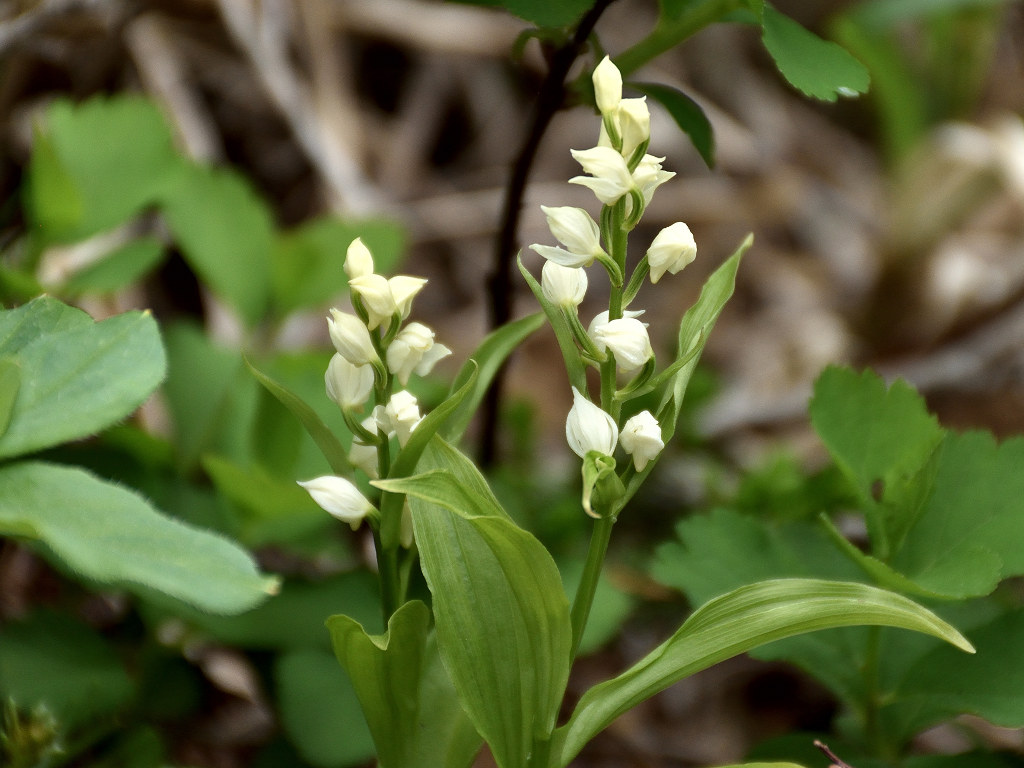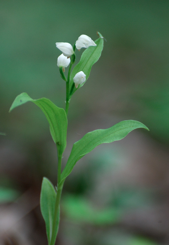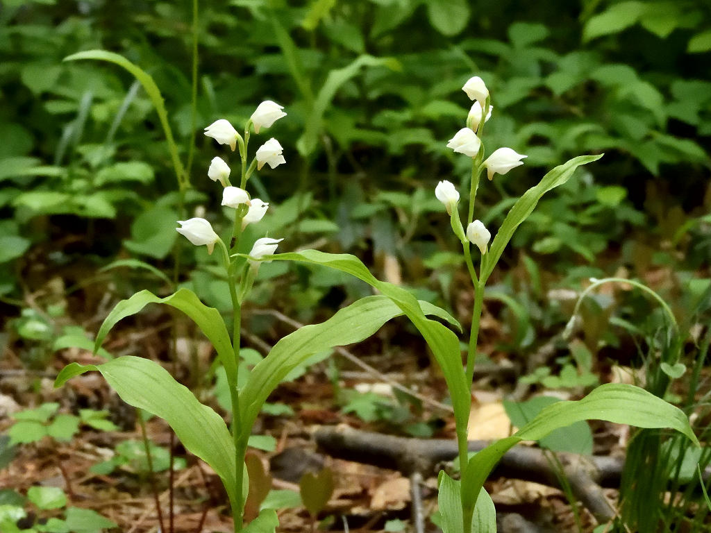 茎を直立させて茎頂に数個の白色の、ランの形の小さな花をつける 葉は茎に、5枚前後で互生、長さ5cmほどの広披針形で基部は茎を抱きます
