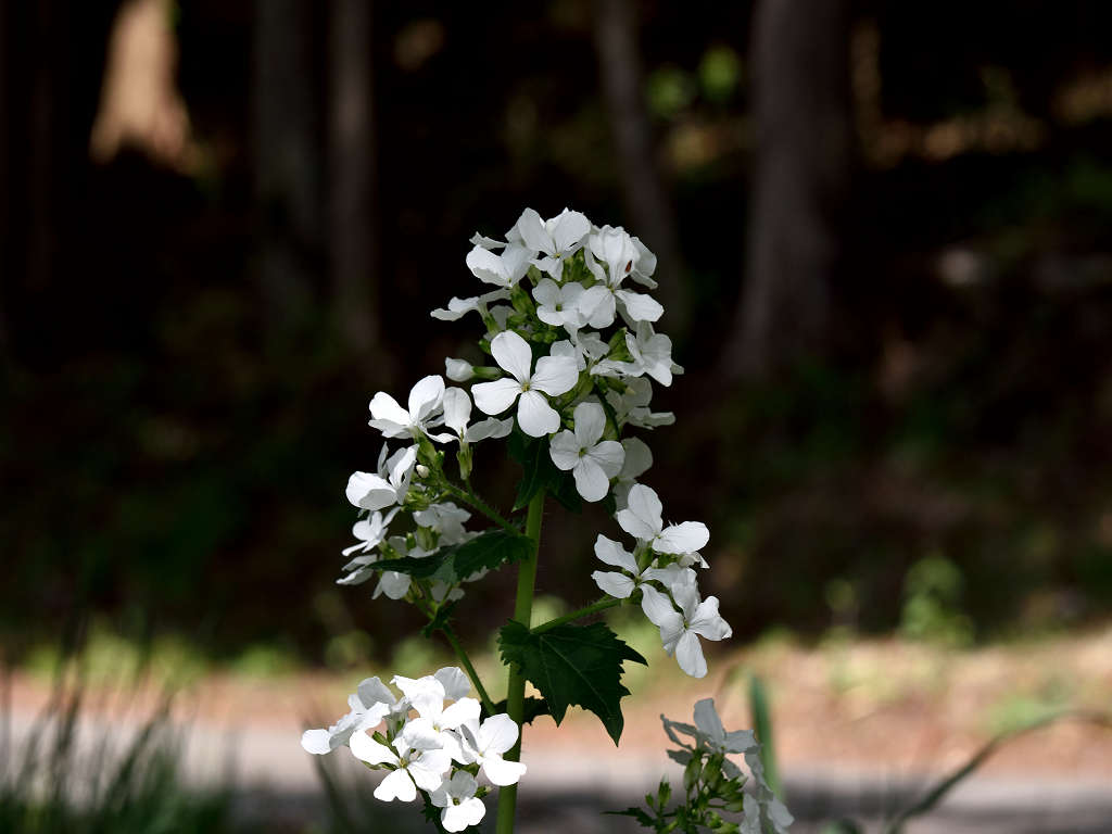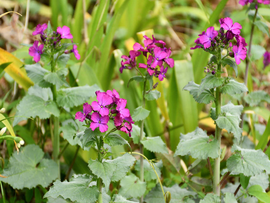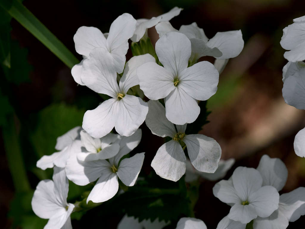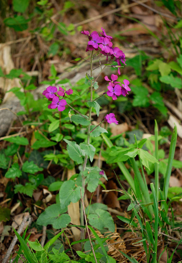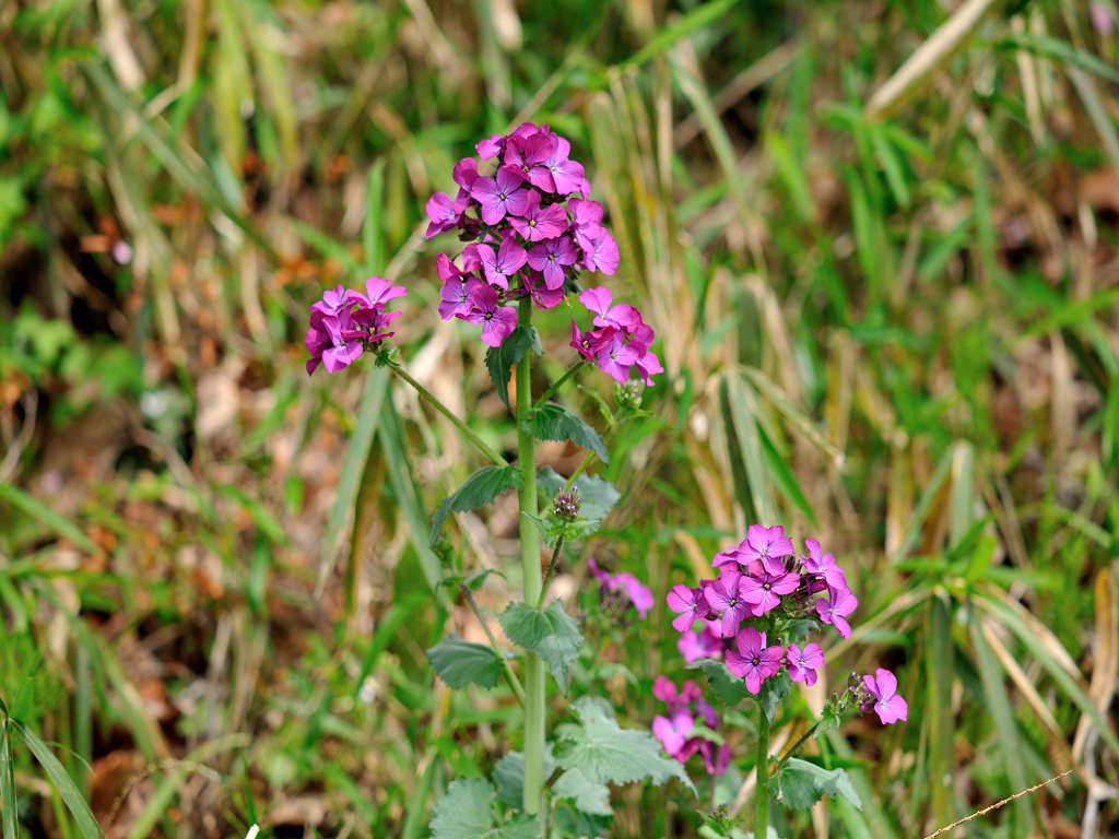 茎先に(柄のある花が花茎に均等につく)を出し、花径2センチくらいの紫色ないし白の4弁花をつける。 アブラナ科特有の十字型の花びらで、雄しべは6本ある