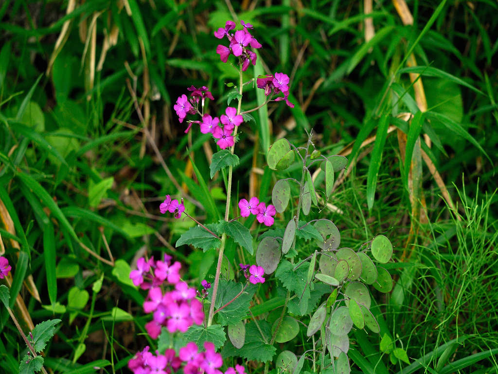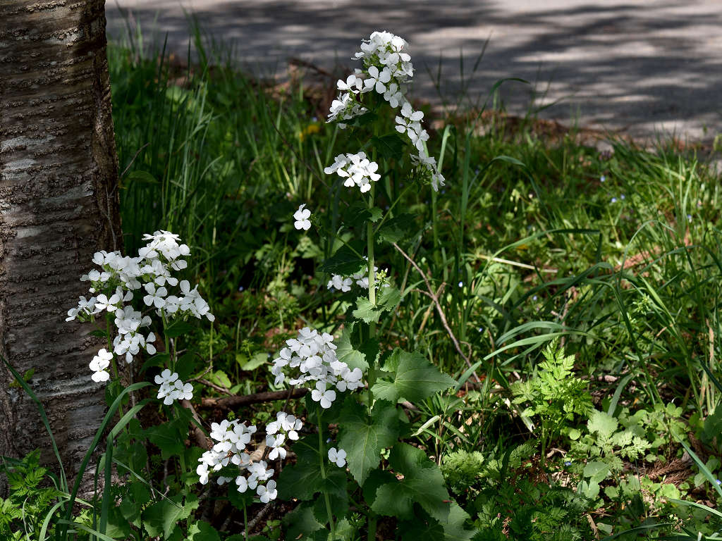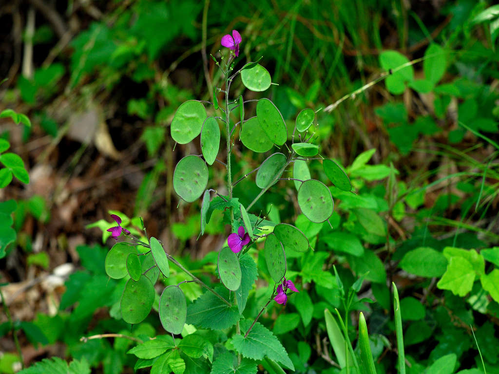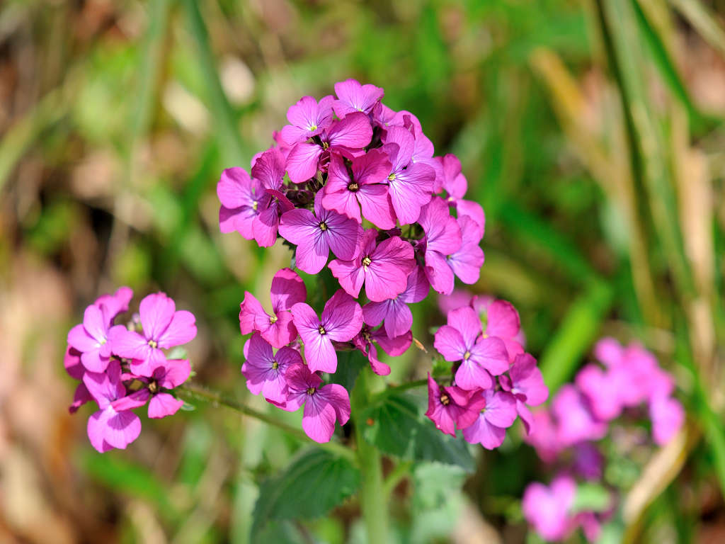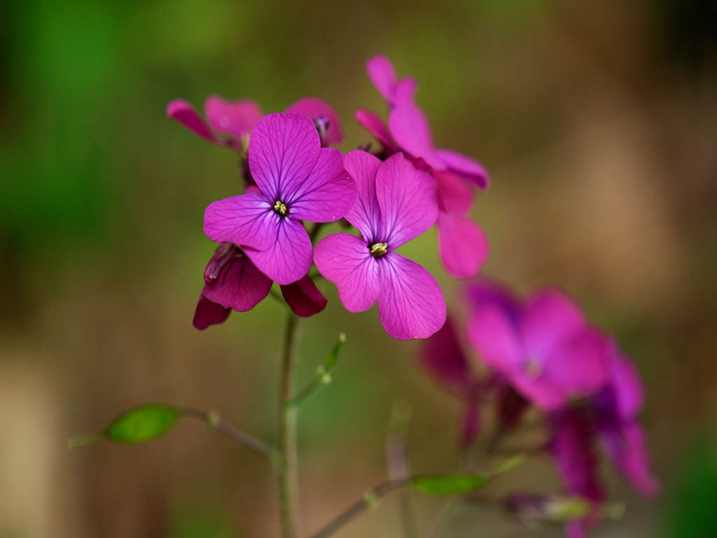茎先に(柄のある花が花茎に均等につく)を出し、花径2センチくらいの紫色ないし白の4弁花をつける。 アブラナ科特有の十字型の花びらで、雄しべは6本ある