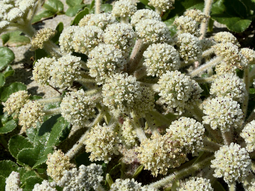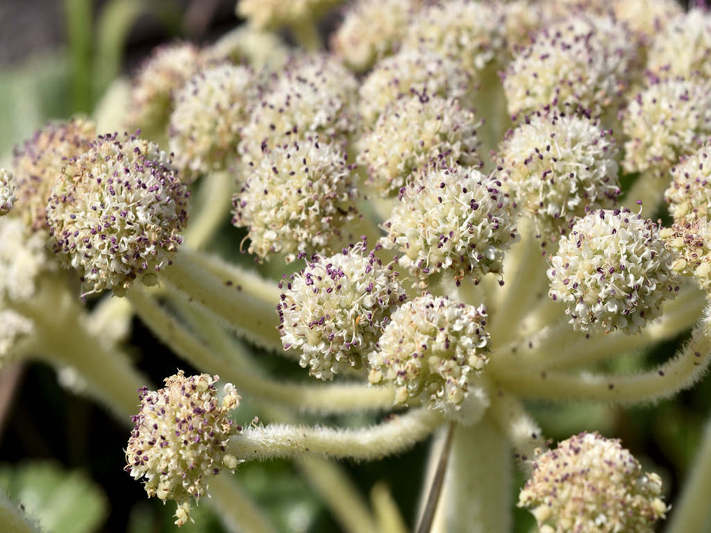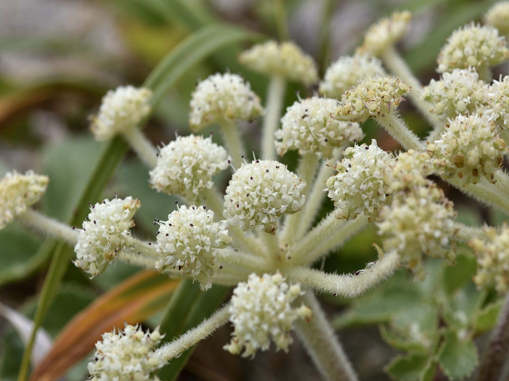 白色の小さな花が集合し半球形に咲く 葉はロゼット状にになる
