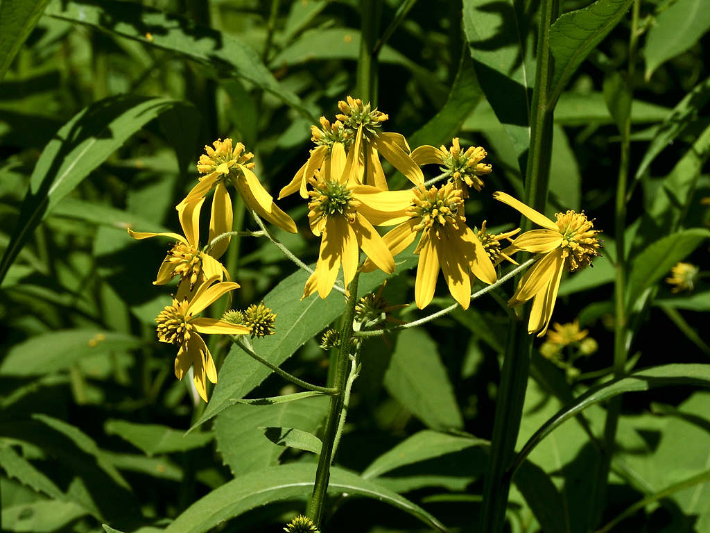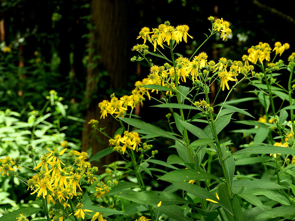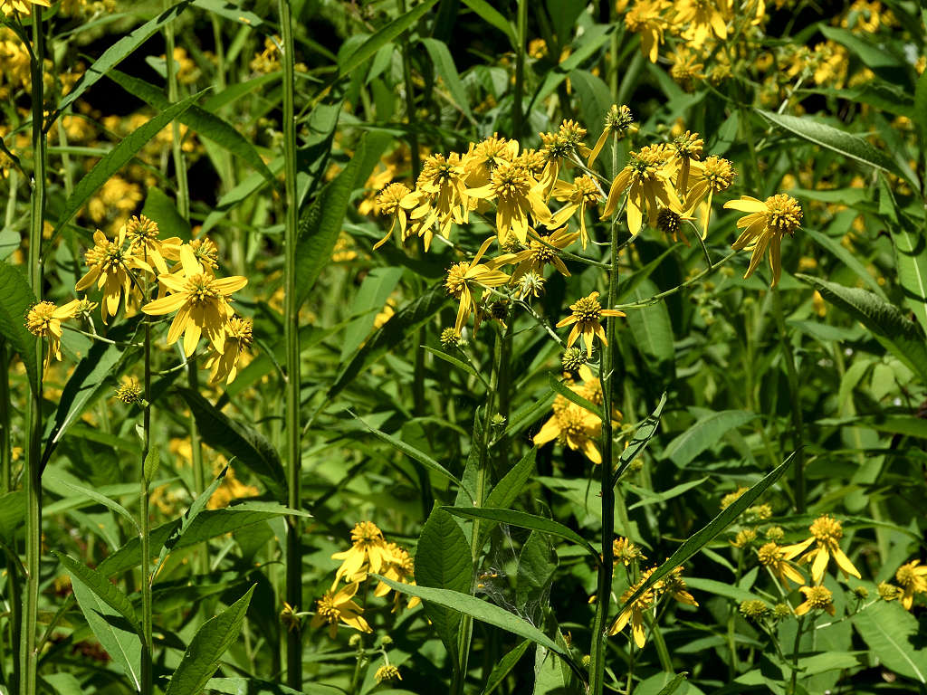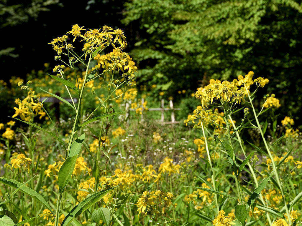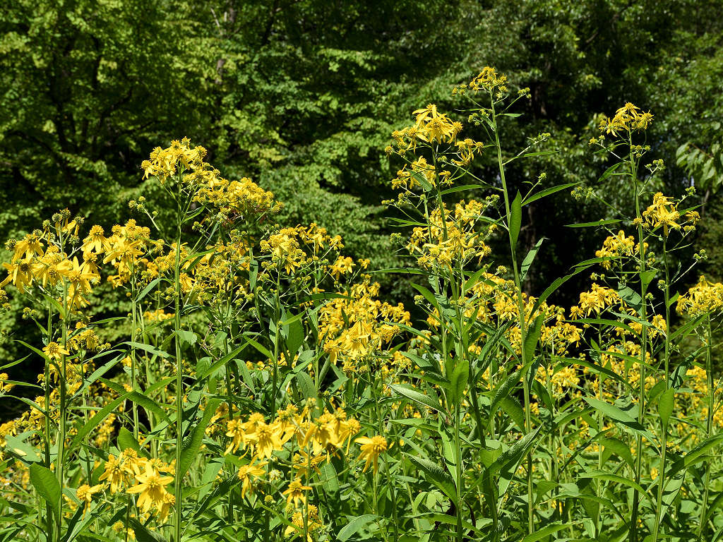 茎の上部に黄色い頭状花序を咲かせる 花弁は反り返り、茎に著しい翼がある 遠目「オオハンゴンソウ」のように見える