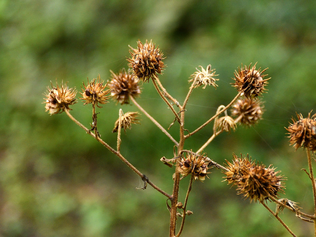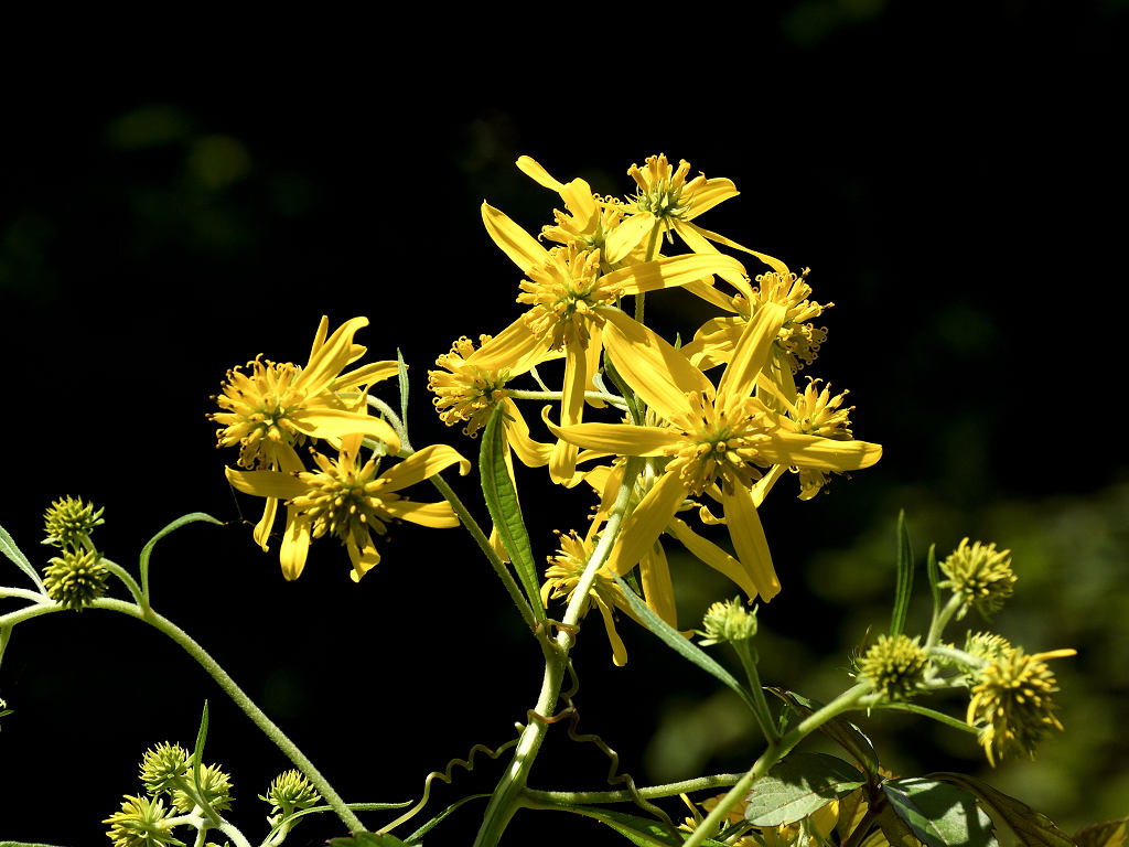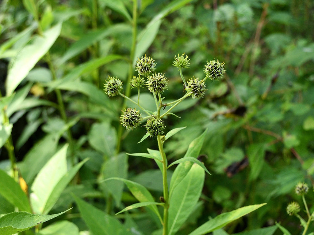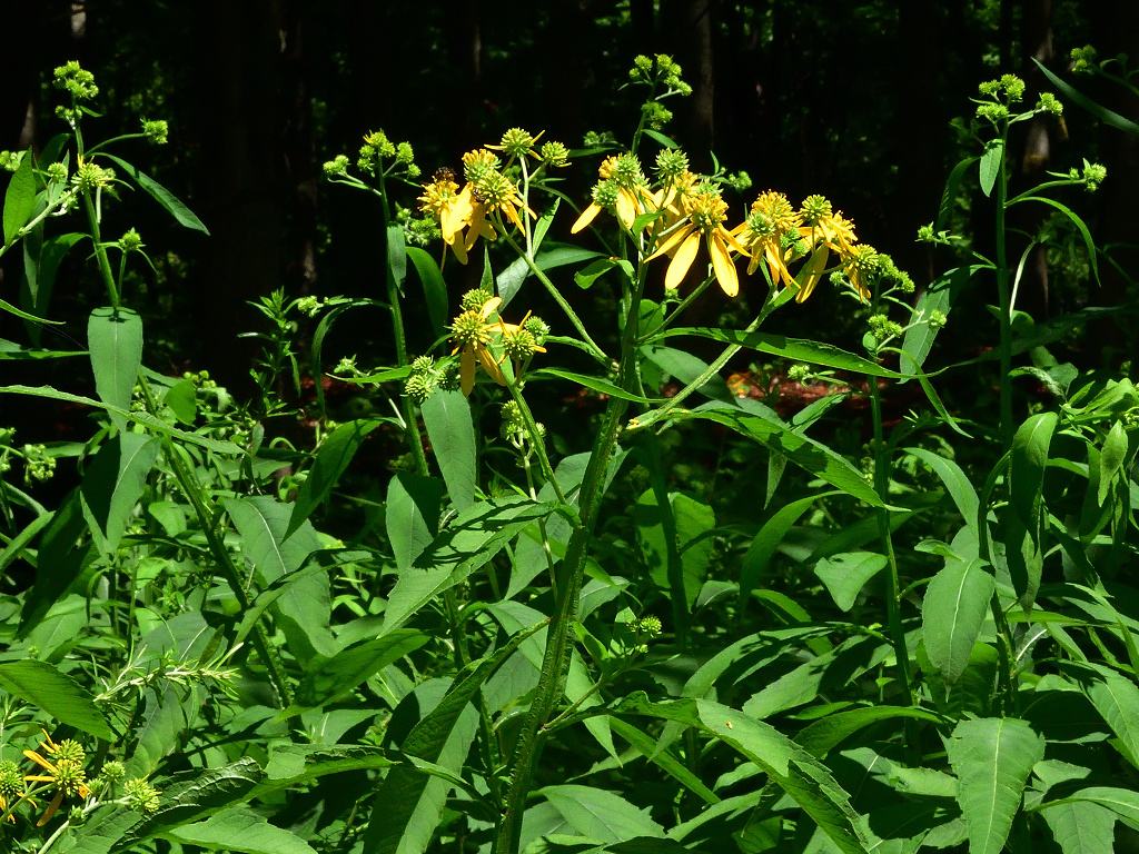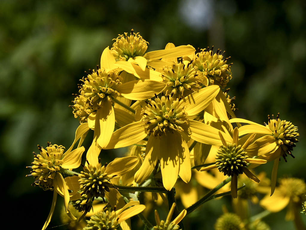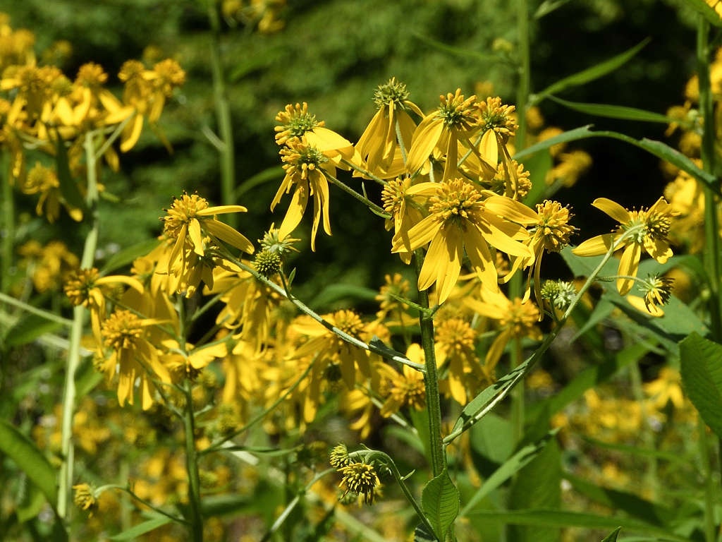 茎の上部に黄色い頭状花序を咲かせる 花弁は反り返り、茎に著しい翼がある 遠目「オオハンゴンソウ」のように見える