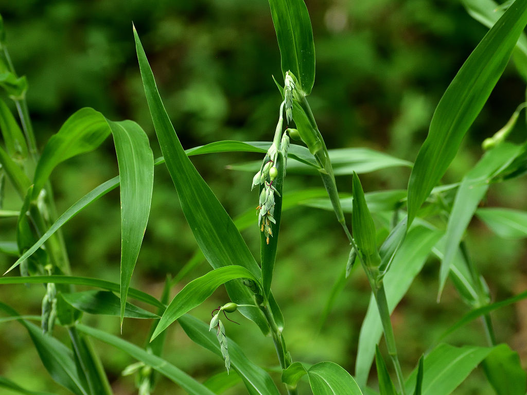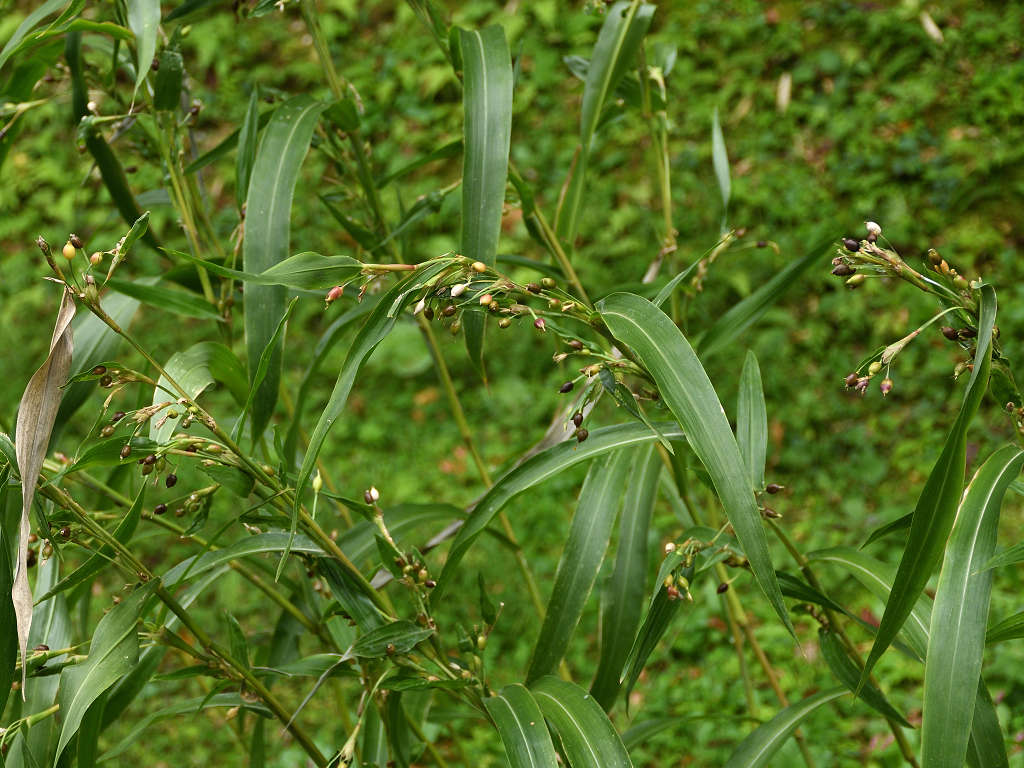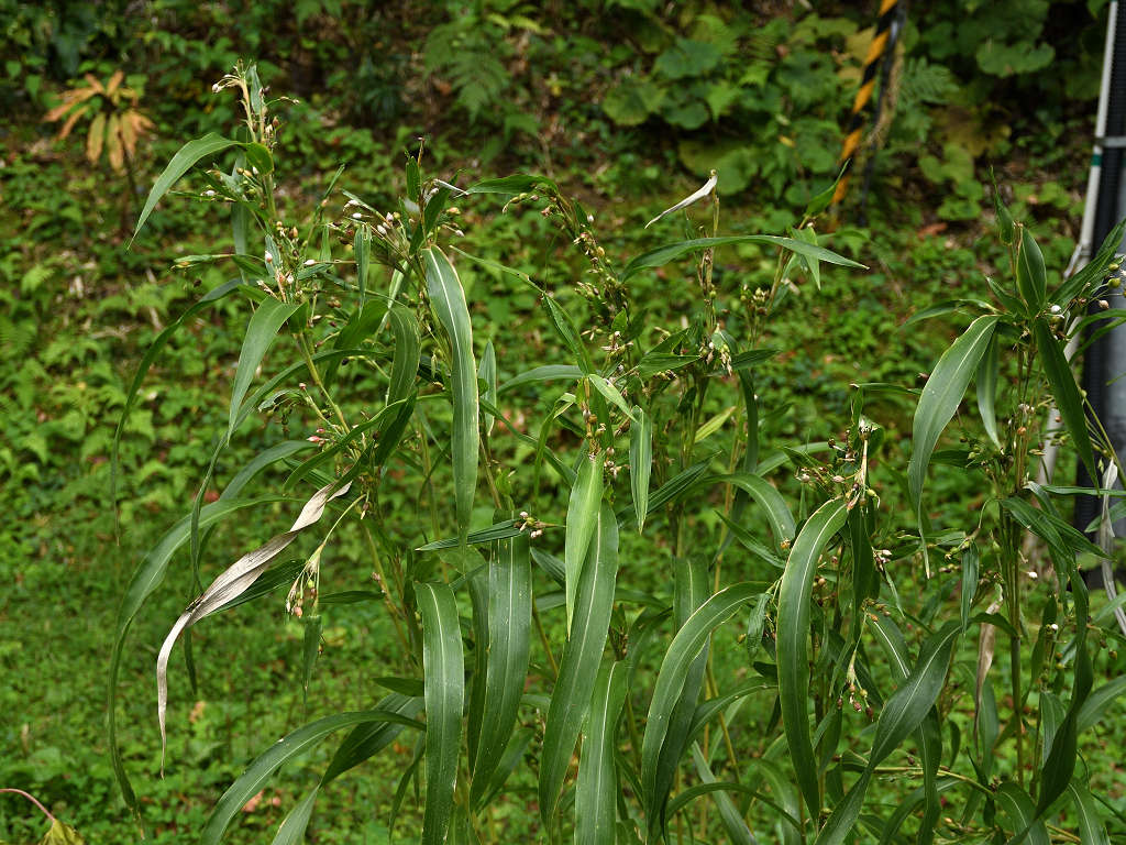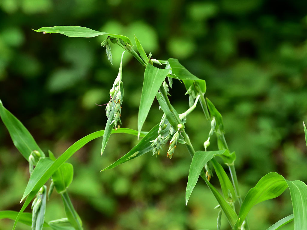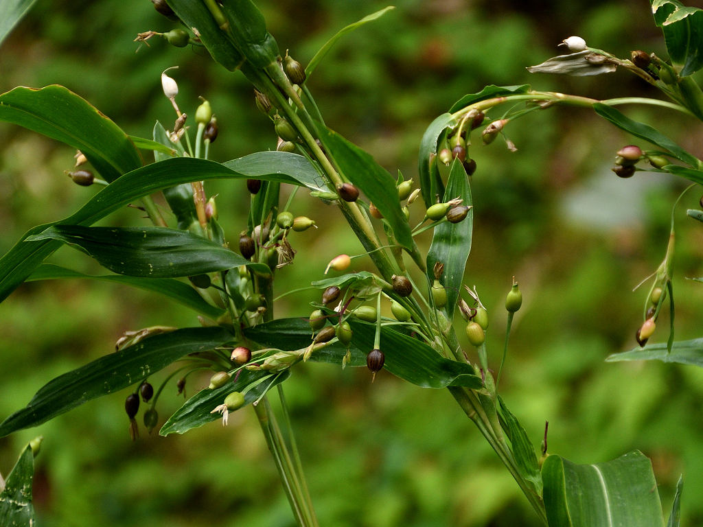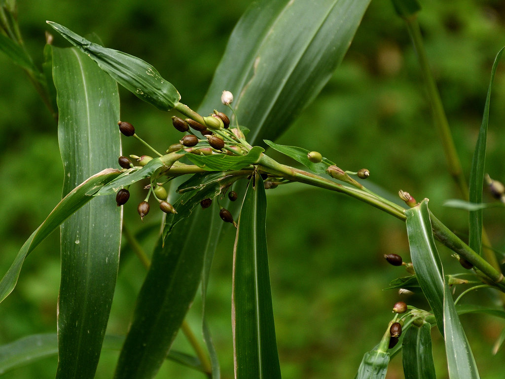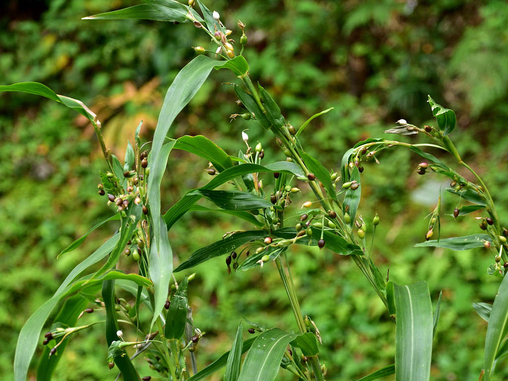 ジュズダマと同じような花 実はジュズダマに比し細長く、こげ茶色(ジュズダマは丸みがあり、黒っぽい)