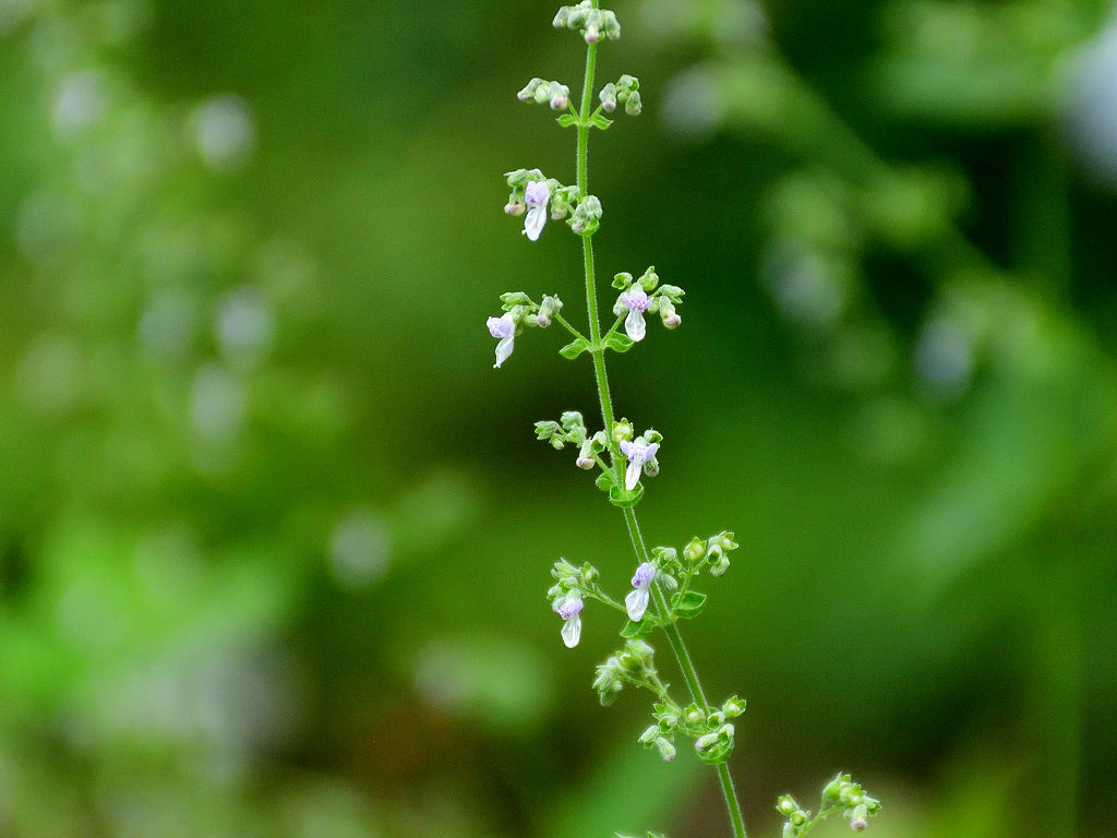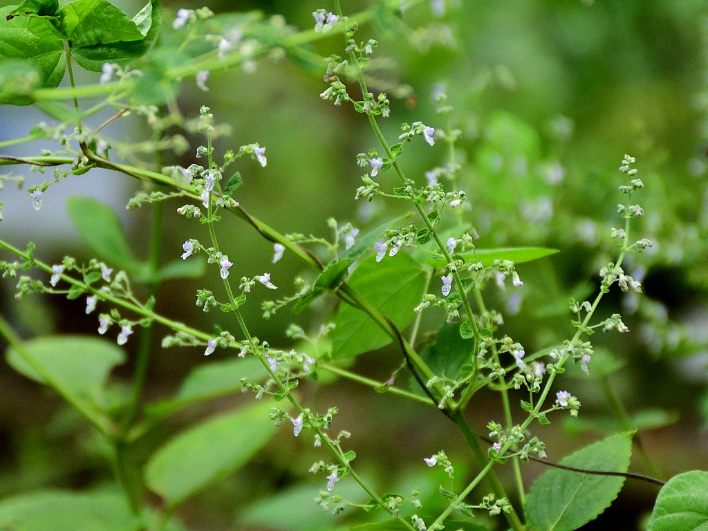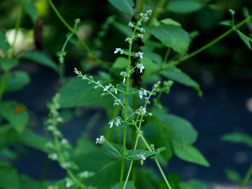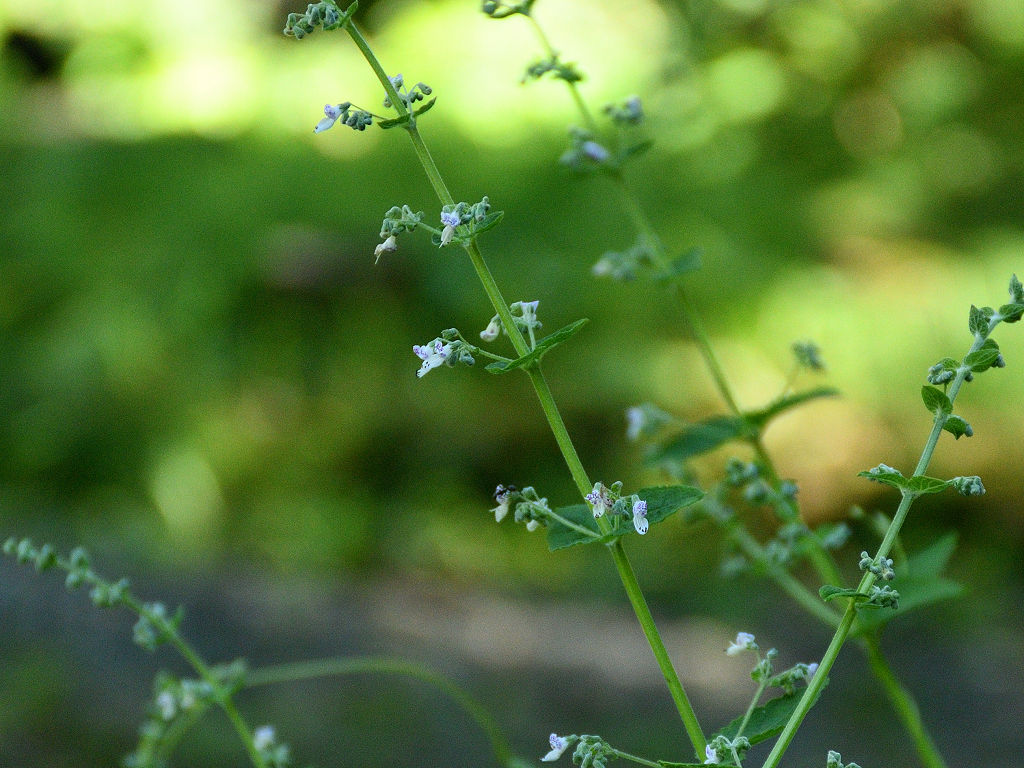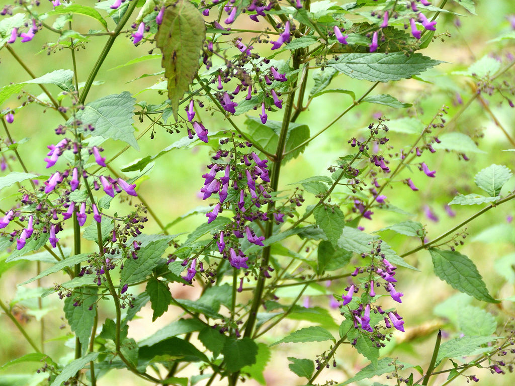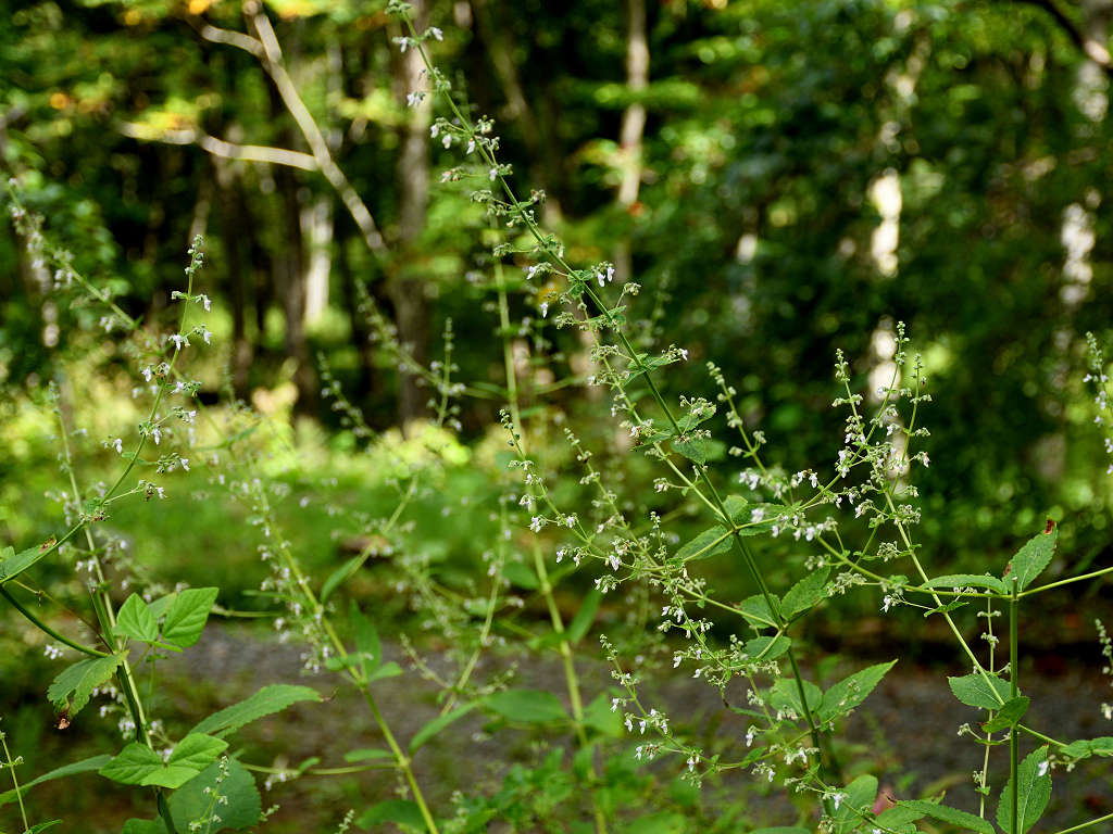 茎の上部に葉腋から集散花序を出し、それらが集まって円錐状の花序になり、多数の花を付ける