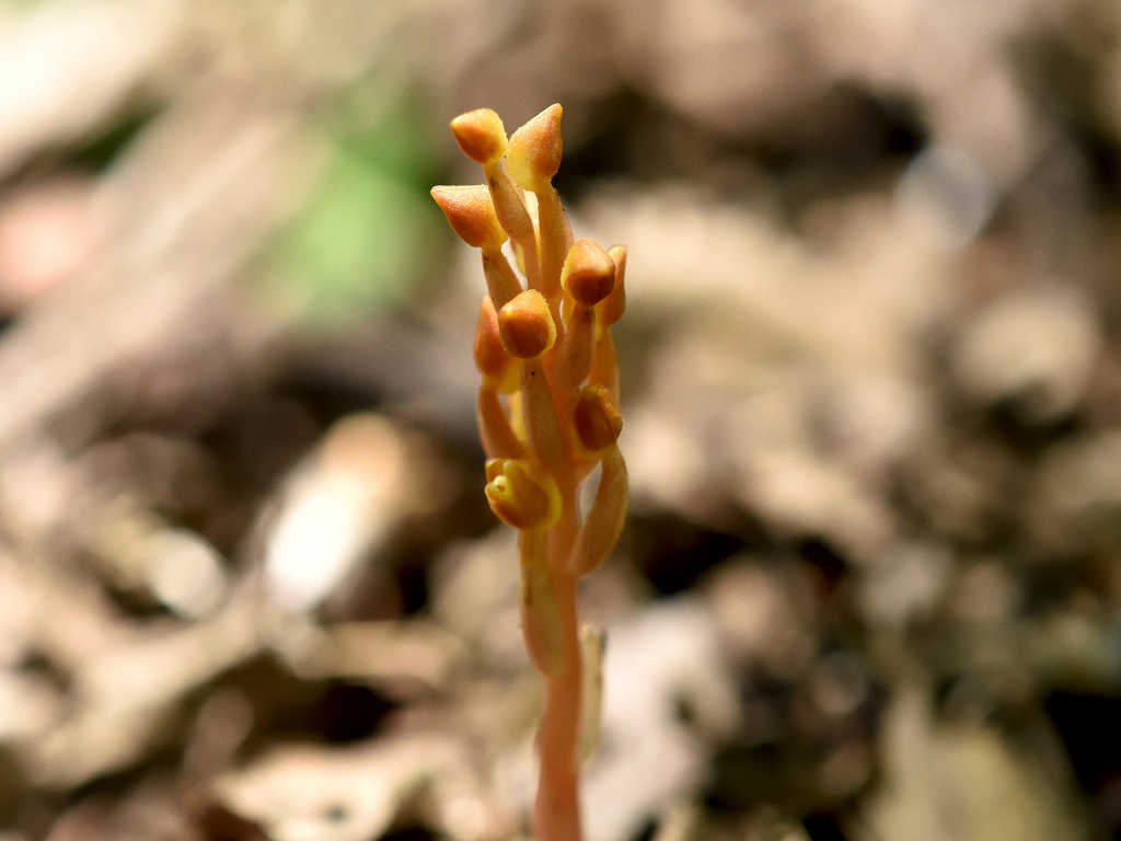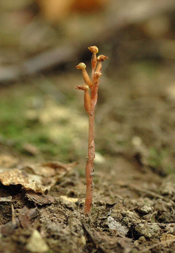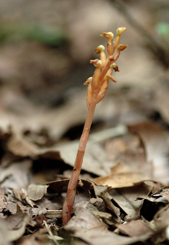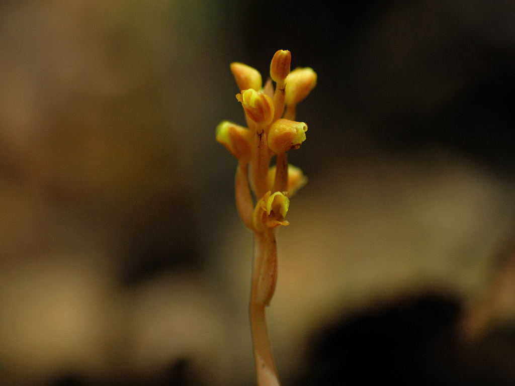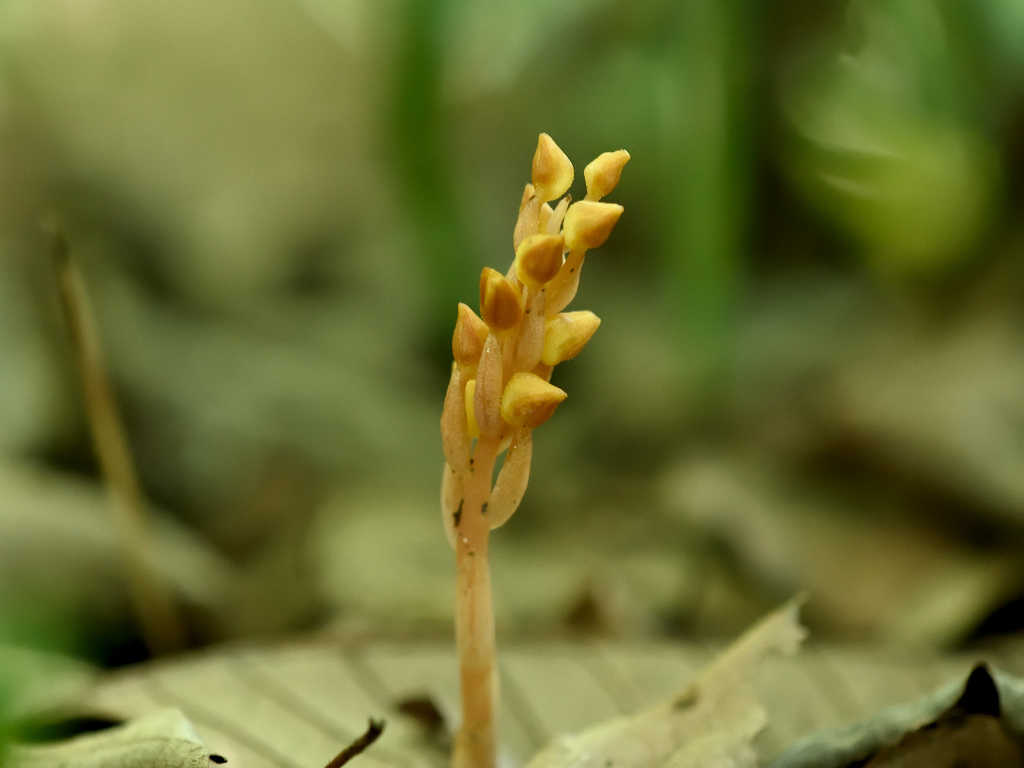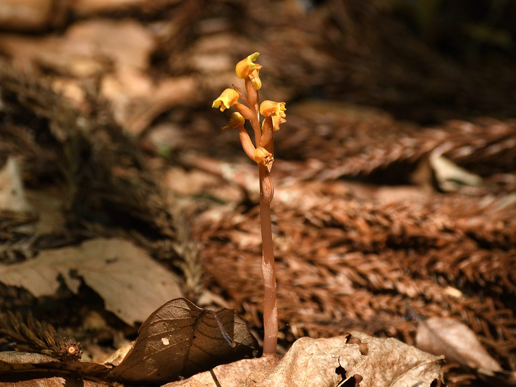 草丈5-15センチ 葉緑素を持たない腐生ラン 赤みを帯びた茶色の茎の上部に5〜10個ほどの黄褐色の花を総状につけます。花はあまり開かず、また、唇弁は上部に位置しているのが特徴