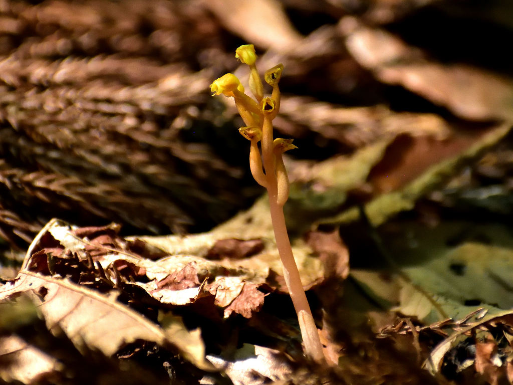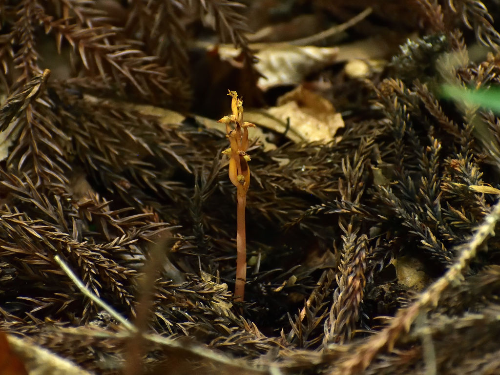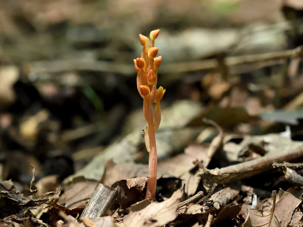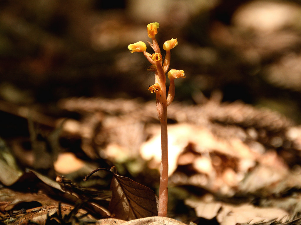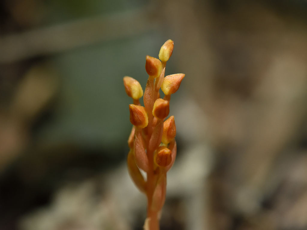 草丈5-15センチ 葉緑素を持たない腐生ラン 赤みを帯びた茶色の茎の上部に5〜10個ほどの黄褐色の花を総状につけます。花はあまり開かず、また、唇弁は上部に位置しているのが特徴
