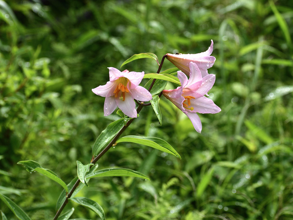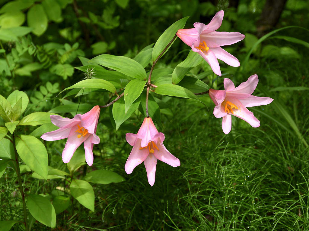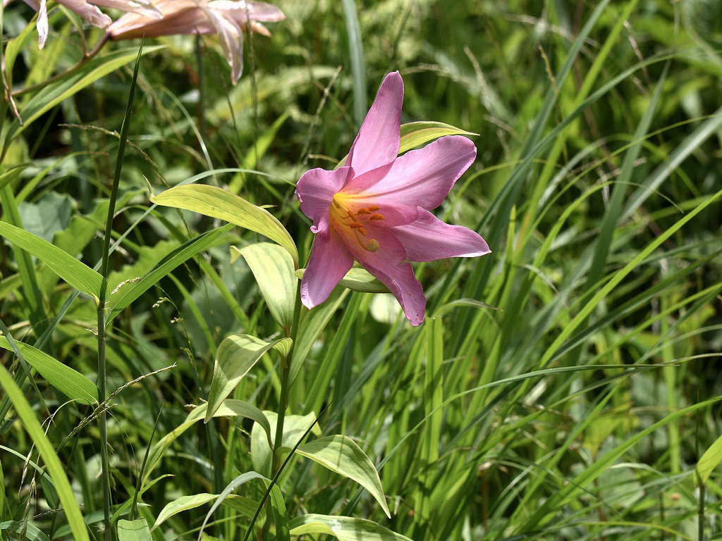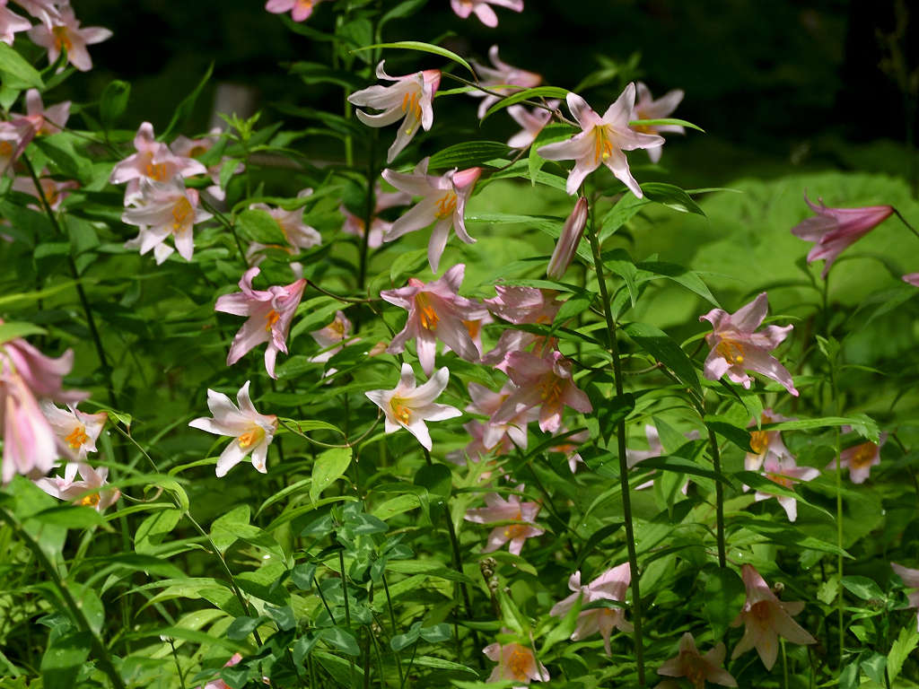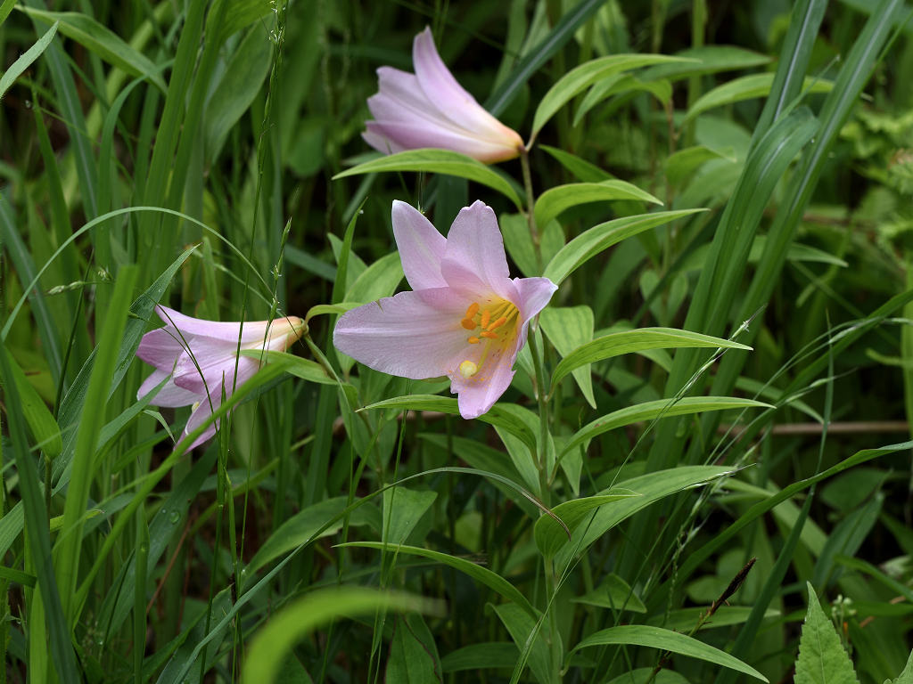 うすピンク色で 横向きに咲き、香りのよい花 ササユリに似ているが、見分けは「葯」の色 ササユリは茶色