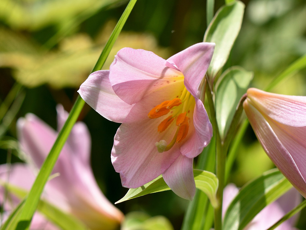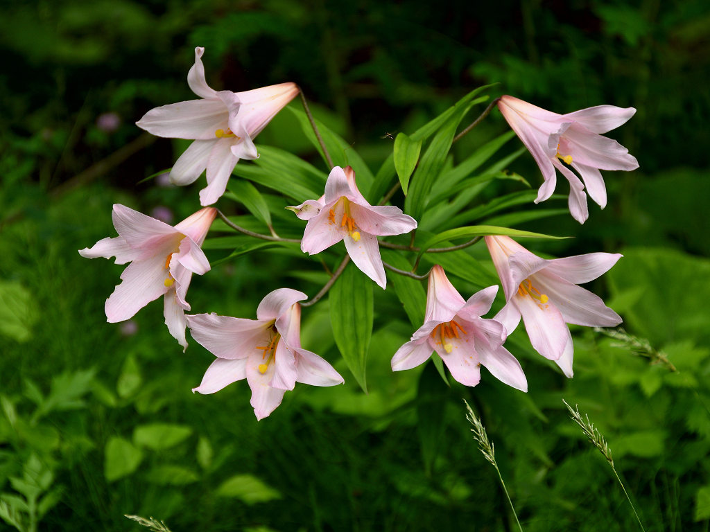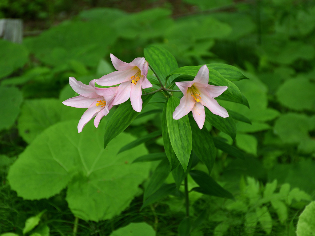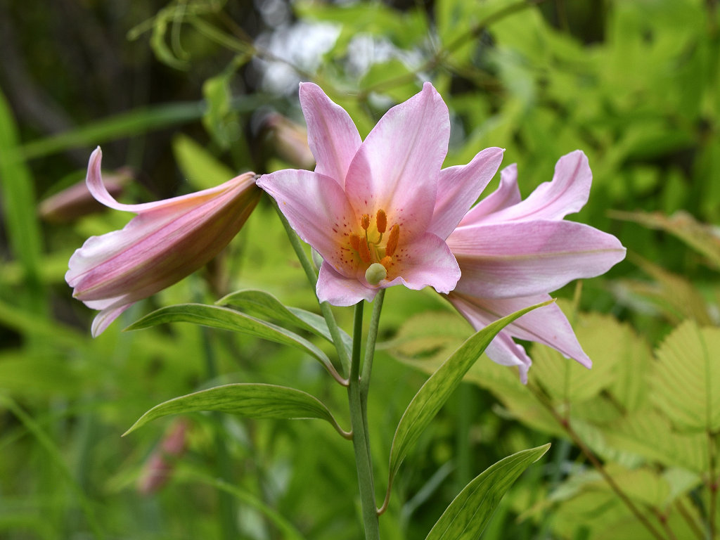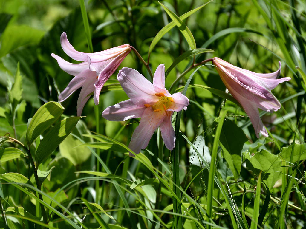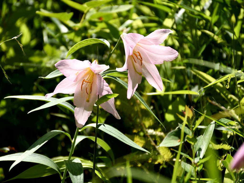 うすピンク色で 横向きに咲き、香りのよい花 ササユリに似ているが、見分けは「葯」の色 ササユリは茶色