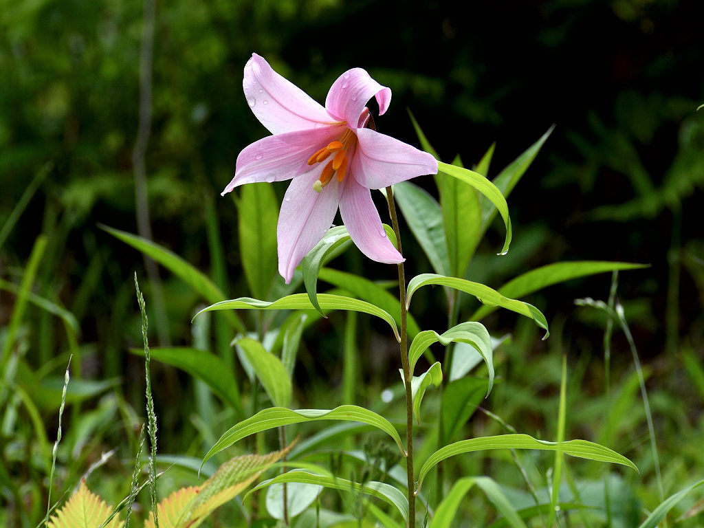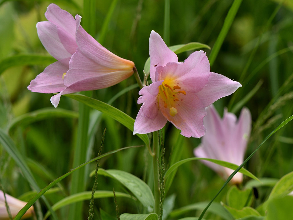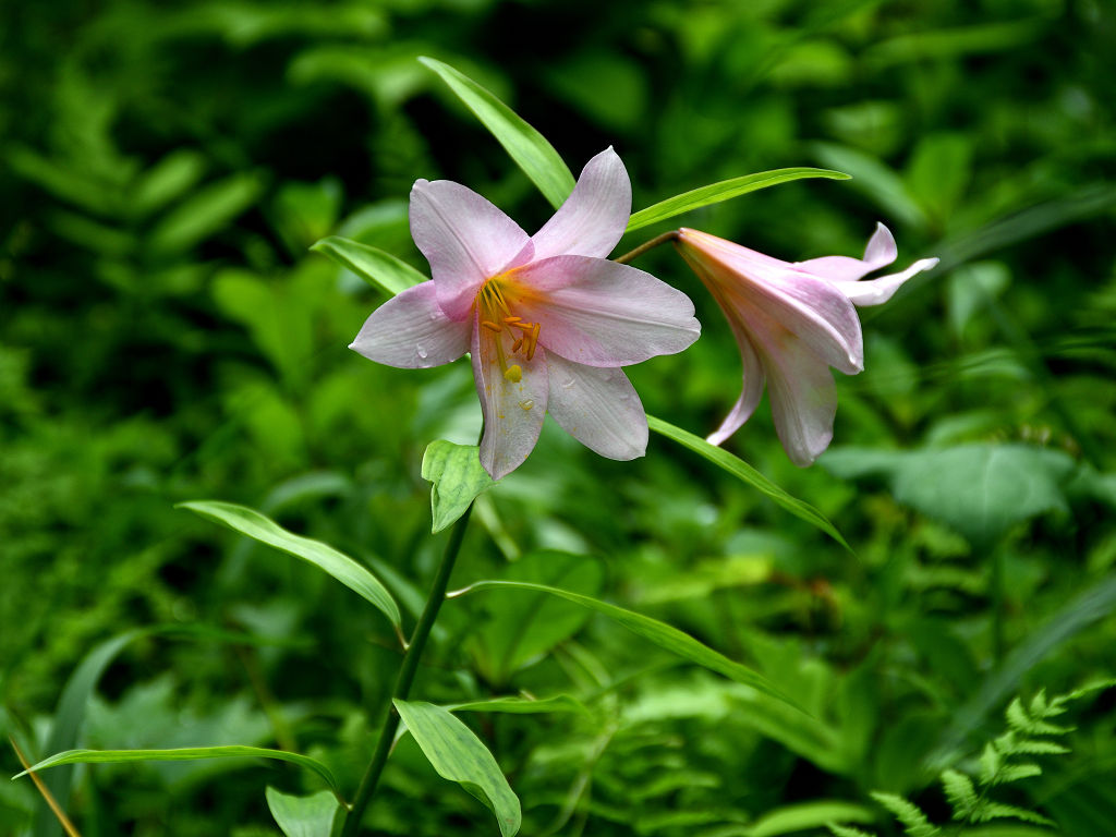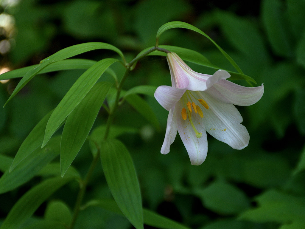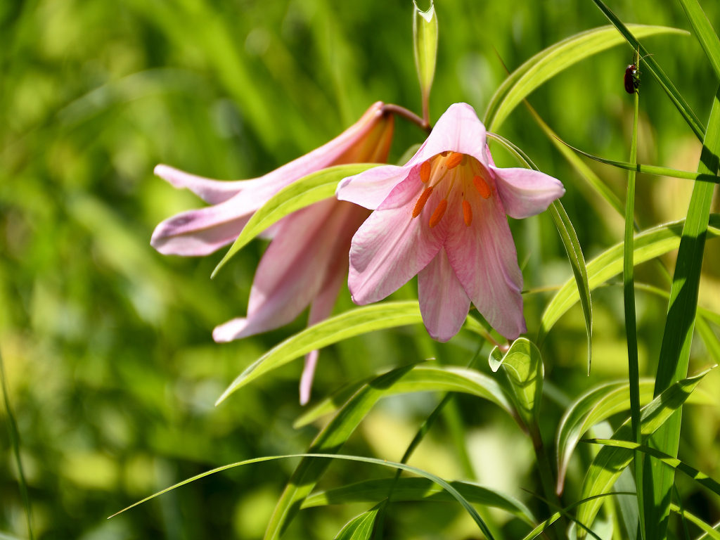 うすピンク色で 横向きに咲き、香りのよい花 ササユリに似ているが、見分けは「葯」の色 ササユリは茶色