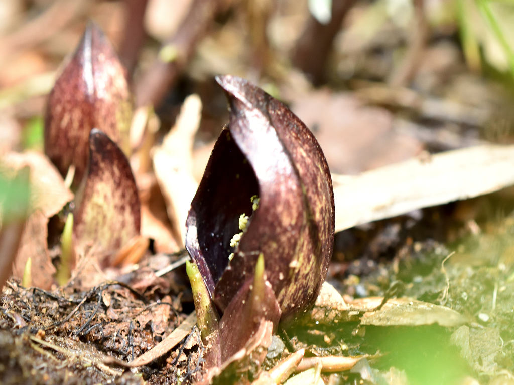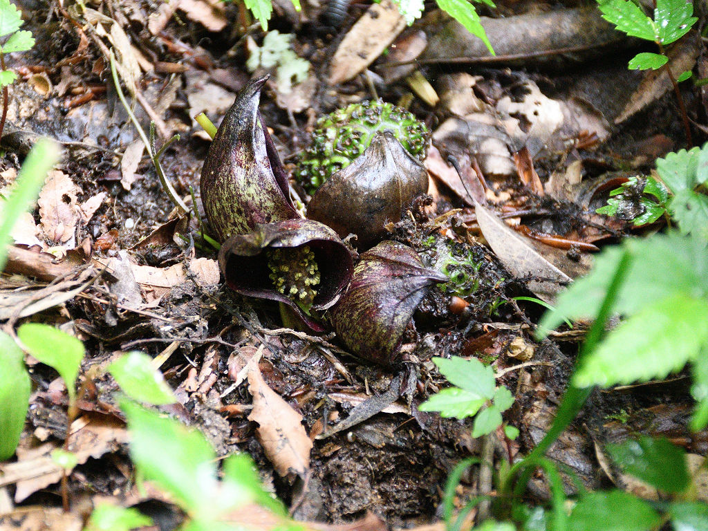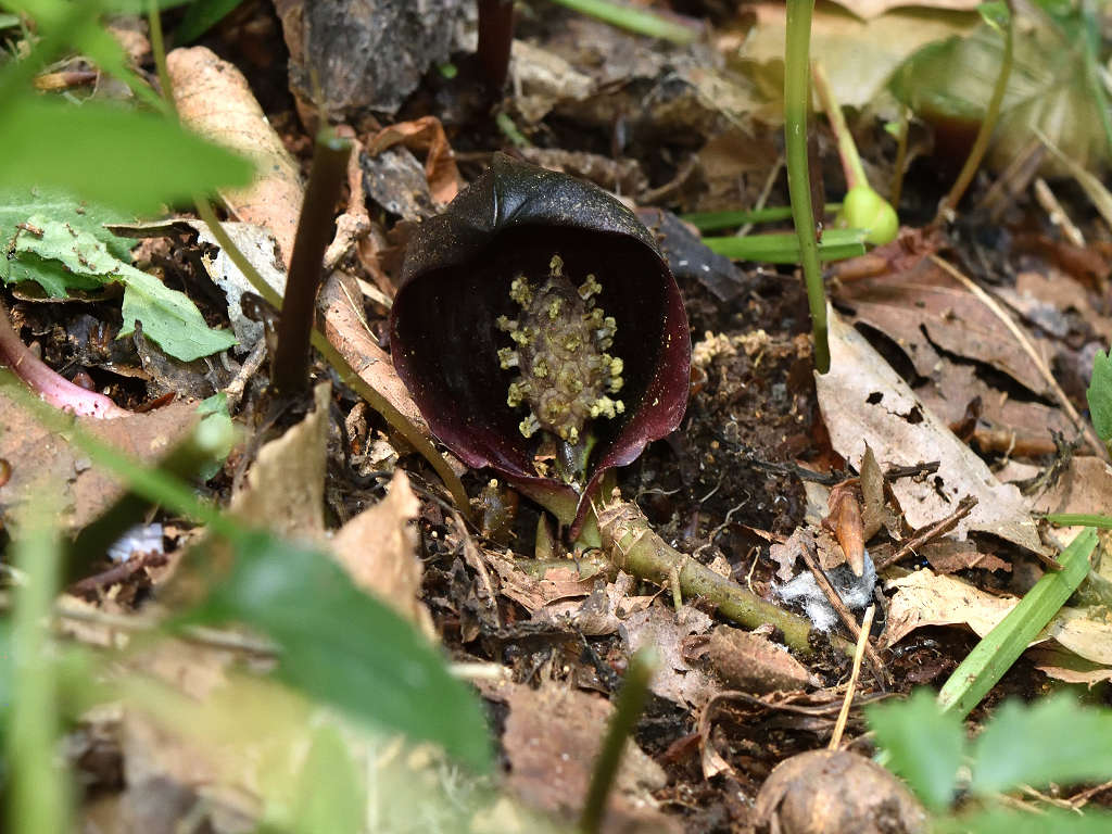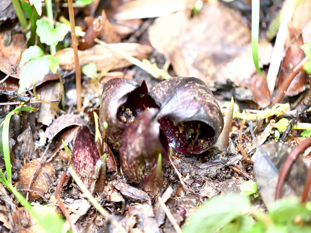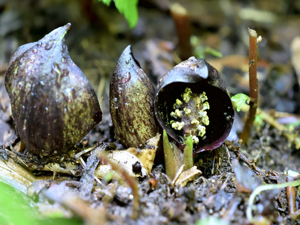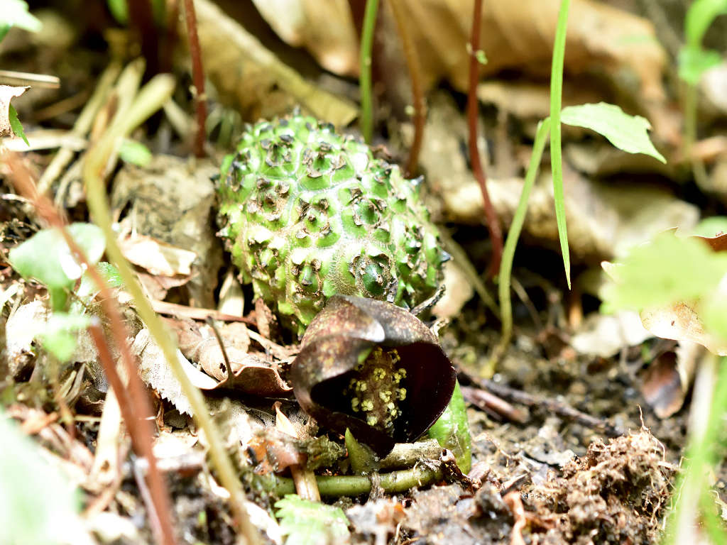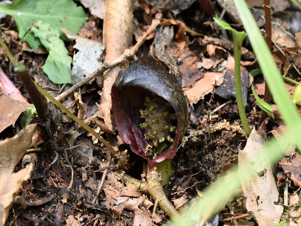花に見えるのは、仏炎苞(苞葉)、仏炎苞に包まれるように、紫褐色をした卵状の肉穂花序があり、花を密生させる
