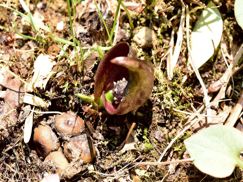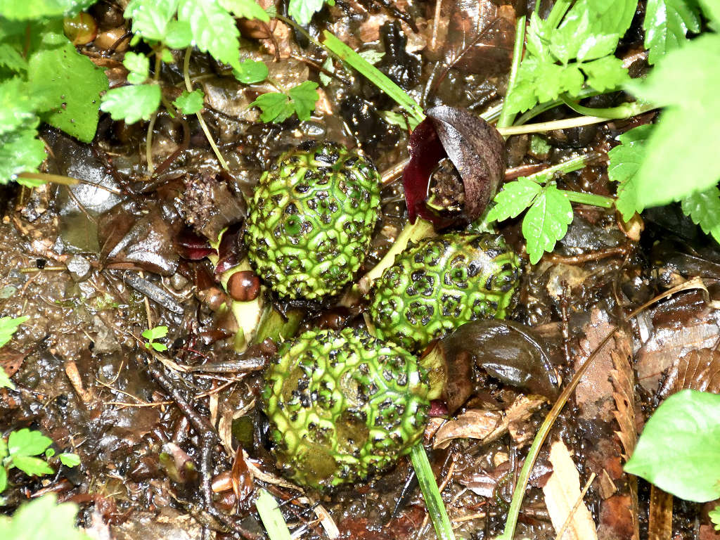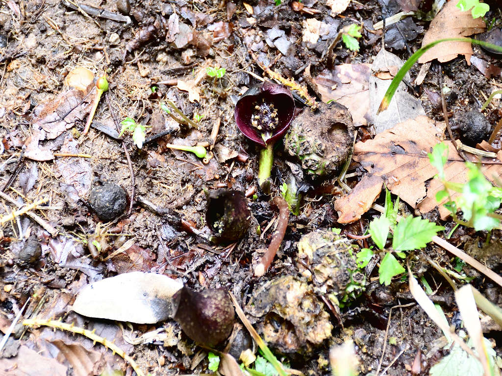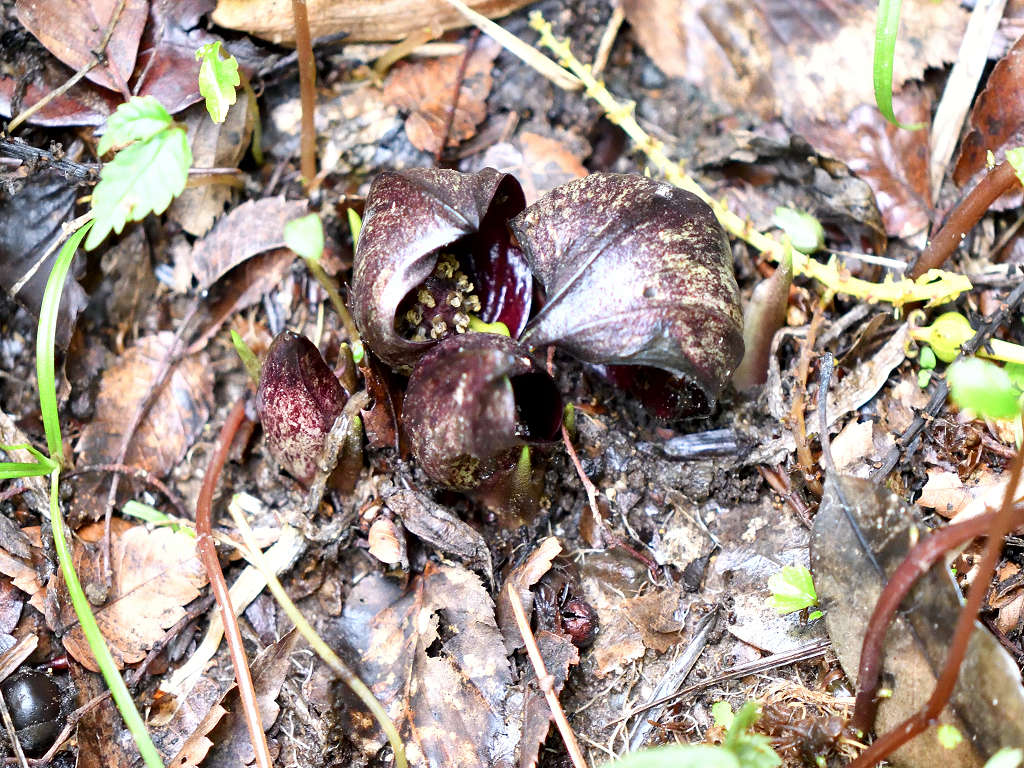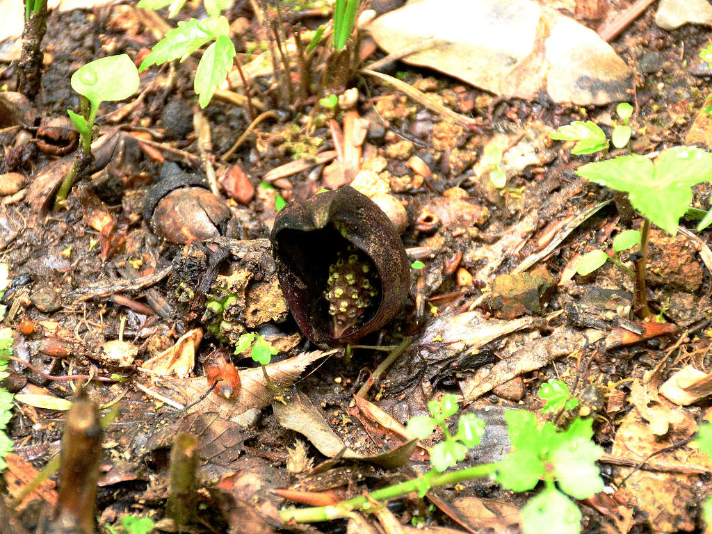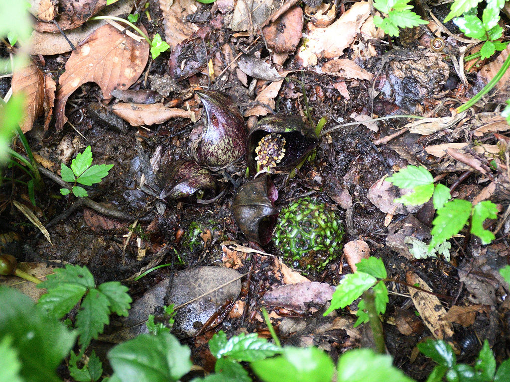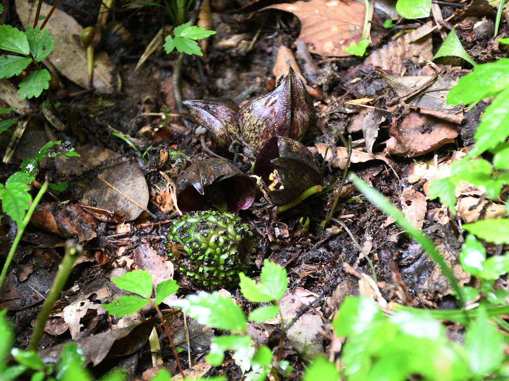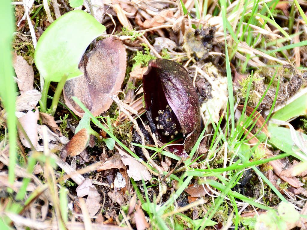 花に見えるのは、仏炎苞(苞葉)、仏炎苞に包まれるように、紫褐色をした卵状の肉穂花序があり、花を密生させる