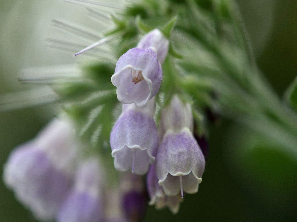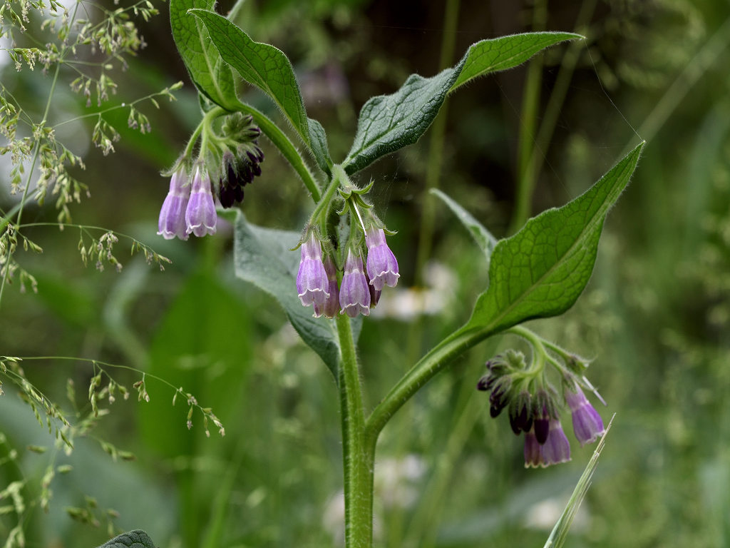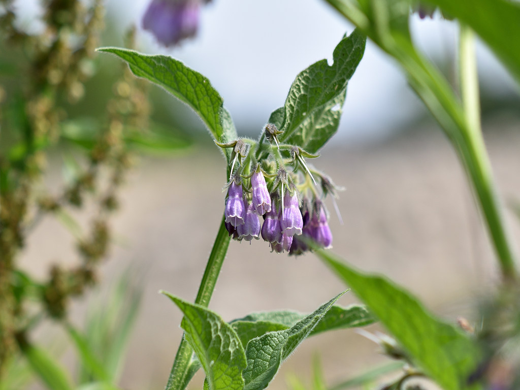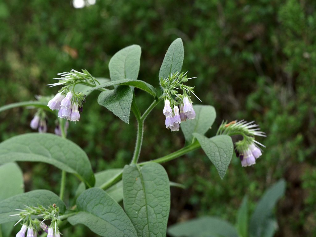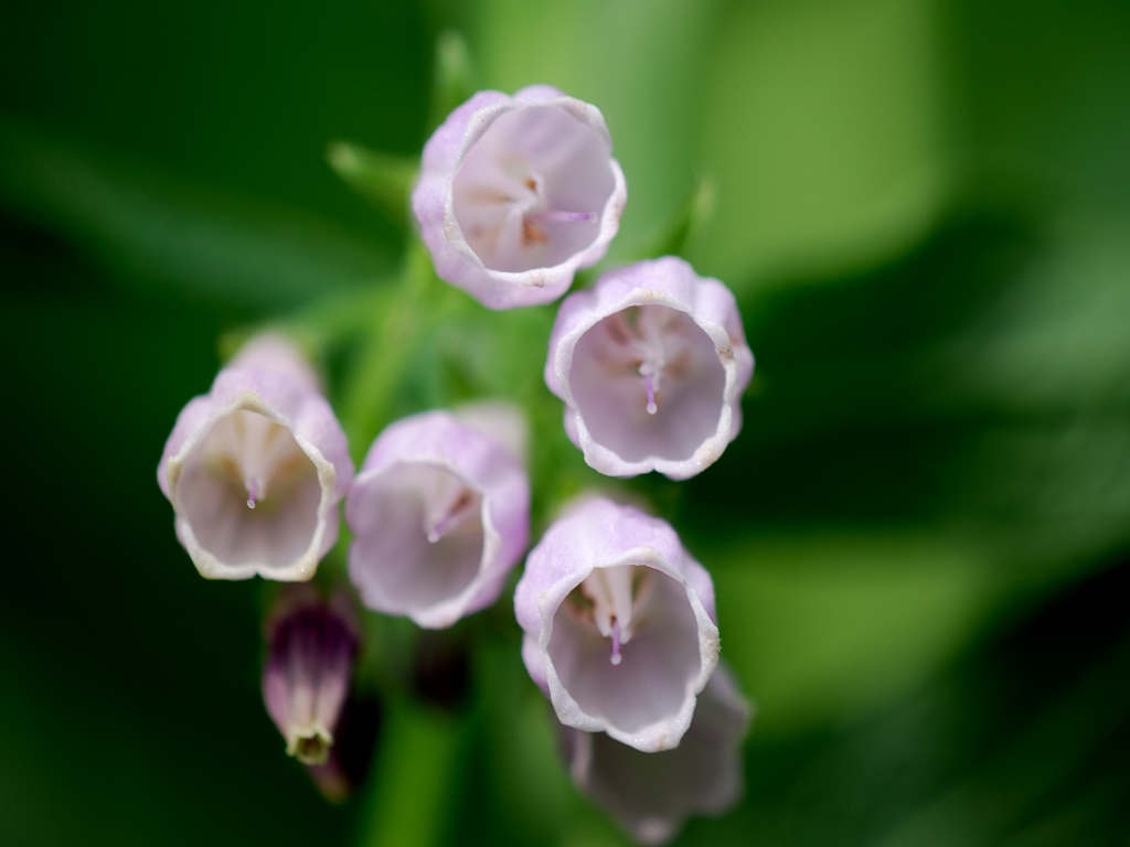 茎先が枝分かれをし、その先に淡い紅色をした釣鐘状の小さな花を垂れてつける 葉は長い楕円形で、互い違いに生える(互生) 上部の葉はつけ根の部分に翼がつく