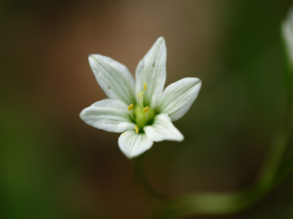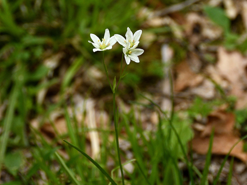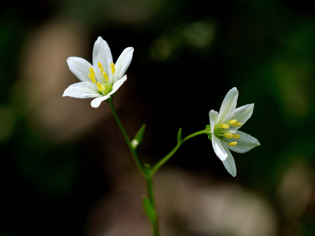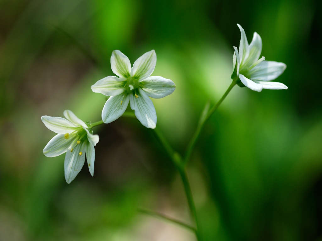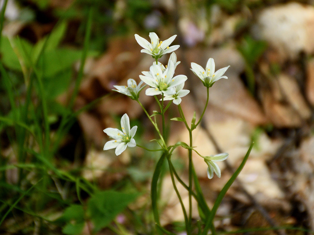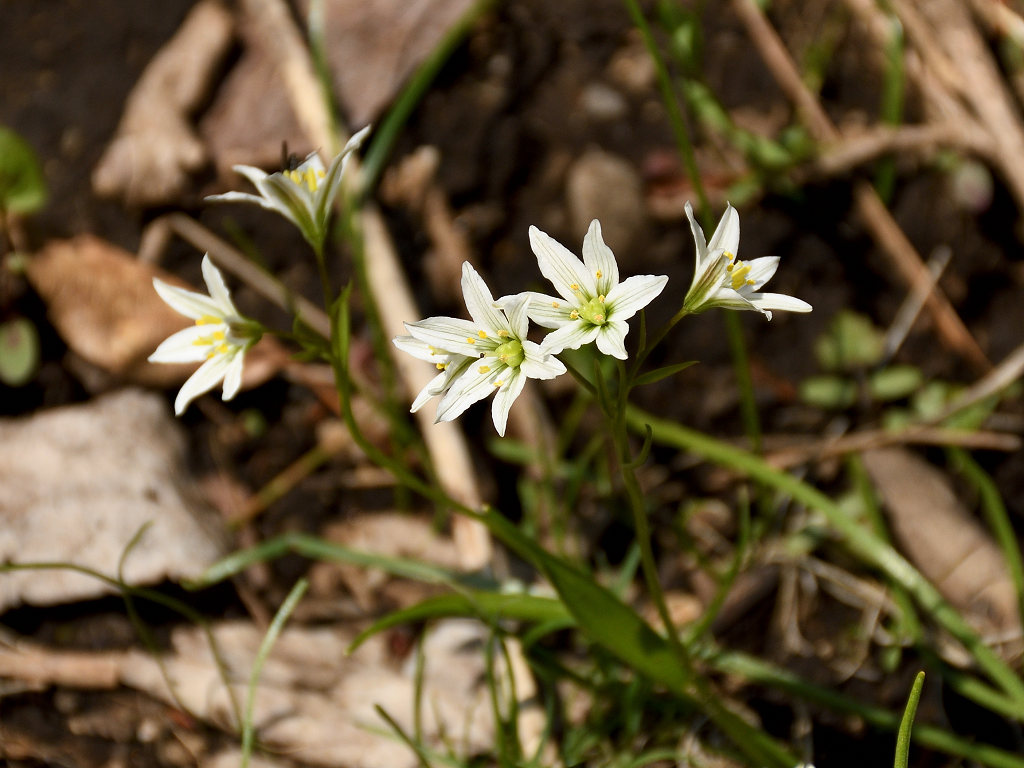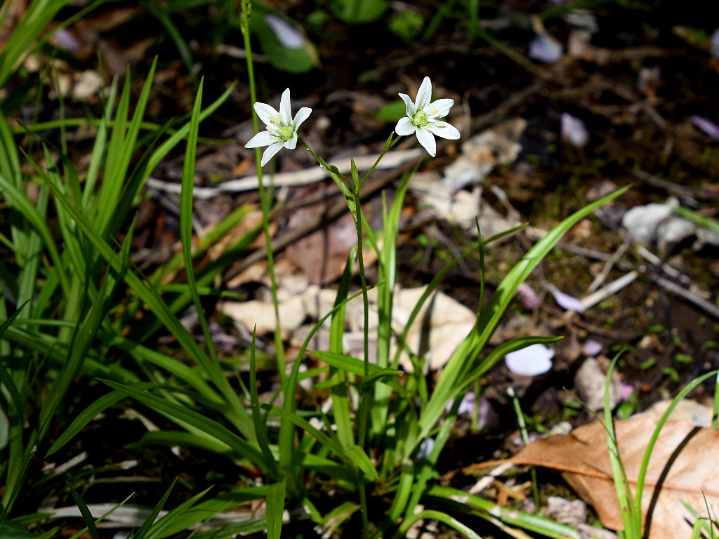 茎の先端で枝を分け、白色花を1〜6個つける。花被片は長楕円形で1〜1.5cm