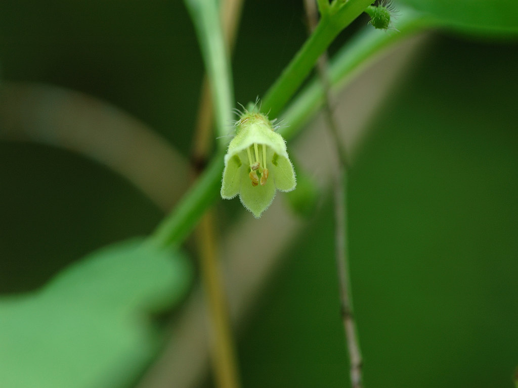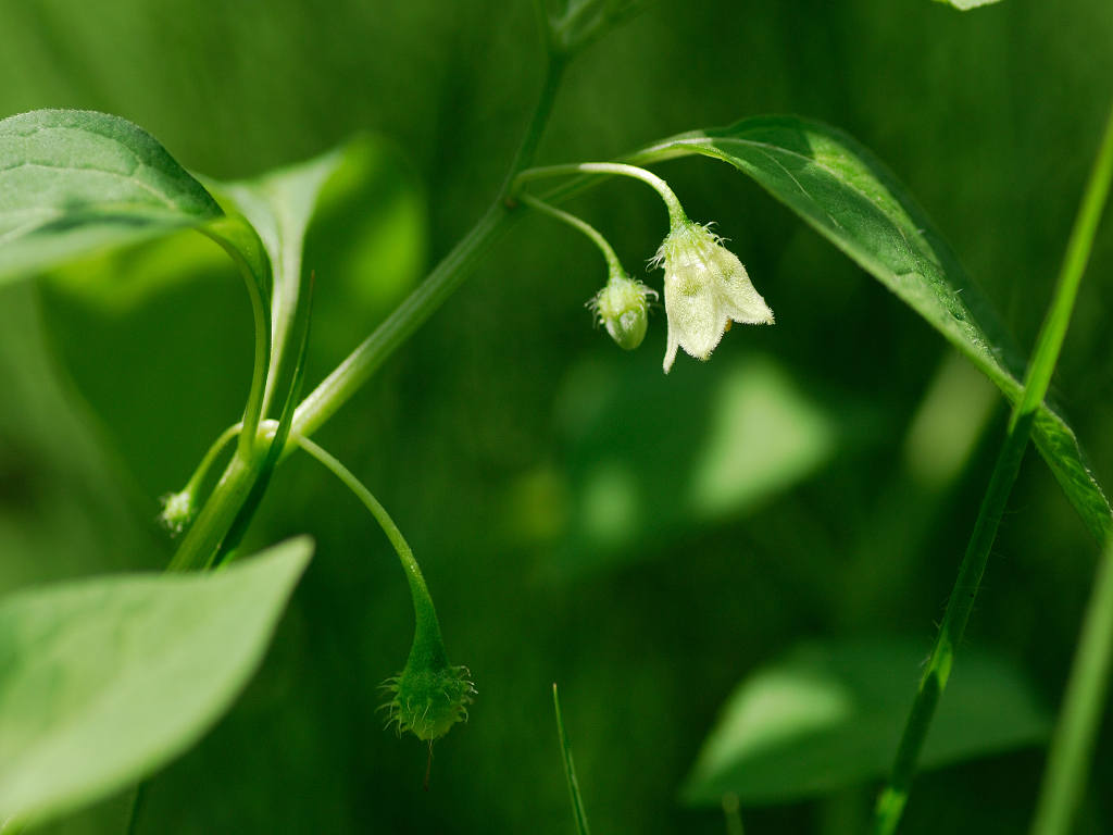 茎は柔らかく、まばらに分枝 葉は互生 花冠は直径約1センチの広鐘形、淡黄白色、先が浅く5裂する 萼は直径3〜5o、軟毛が密生する 草丈50-70センチ