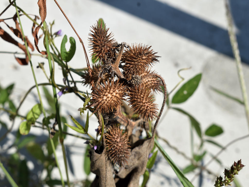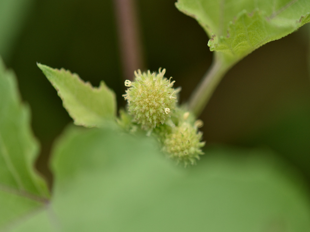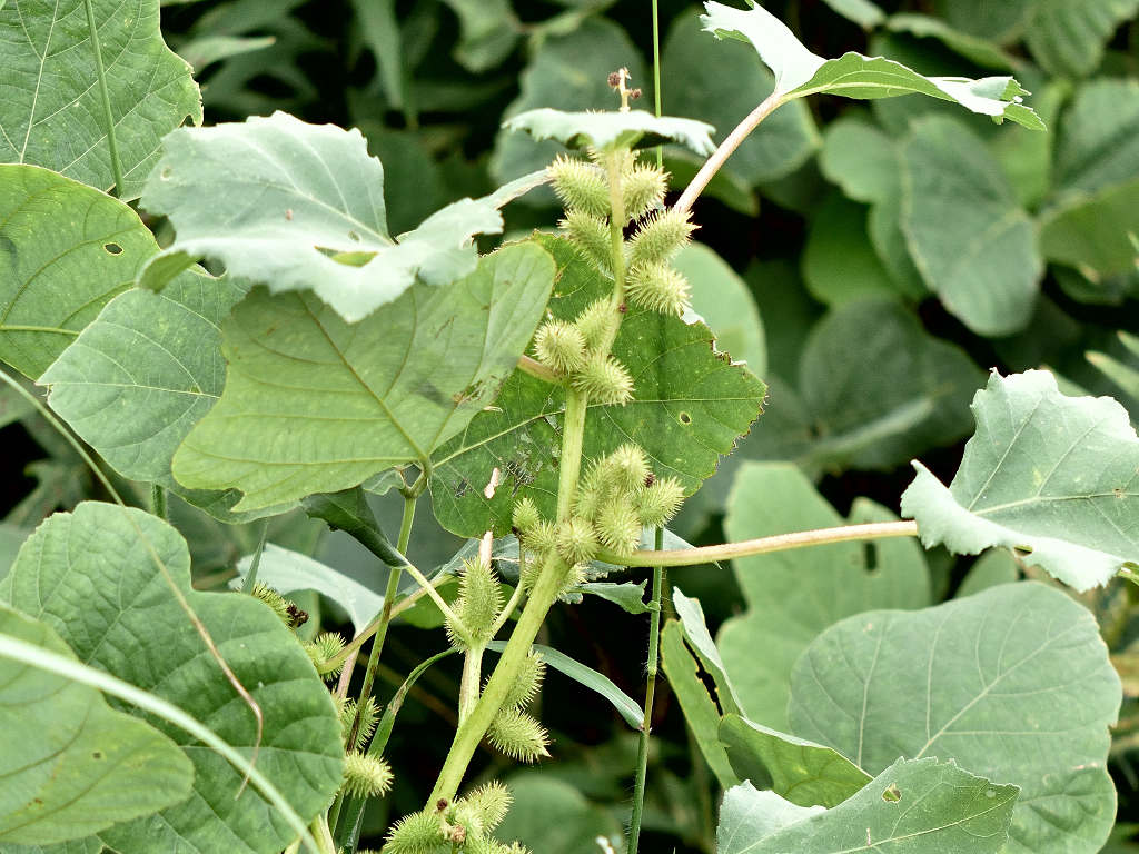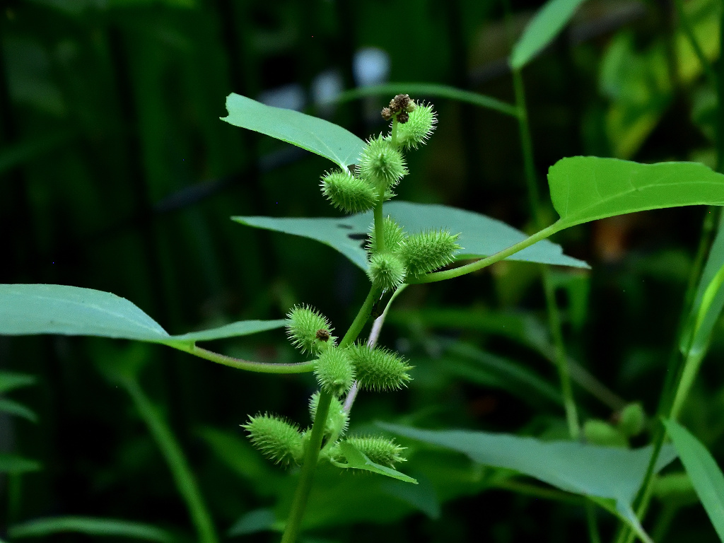 「オオオナモミ」に比し、実のトゲには毛が多く、トゲも密に生え、果実も大きい。葉の縁のキザキザが少ない。