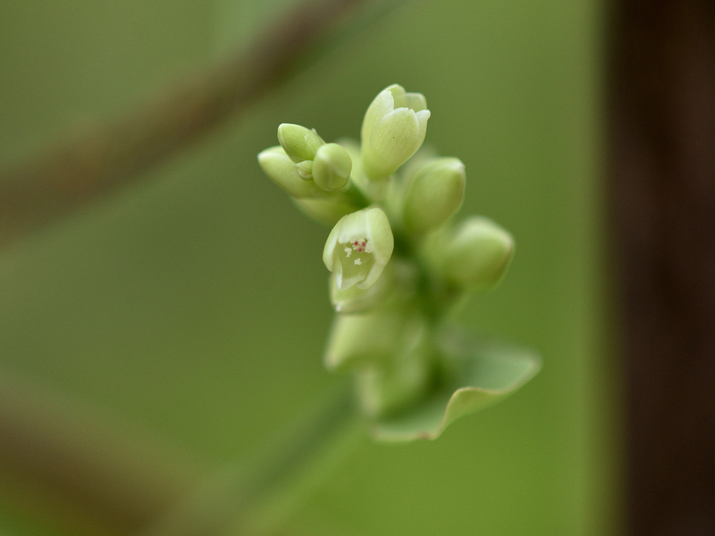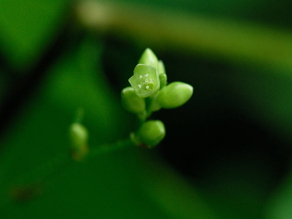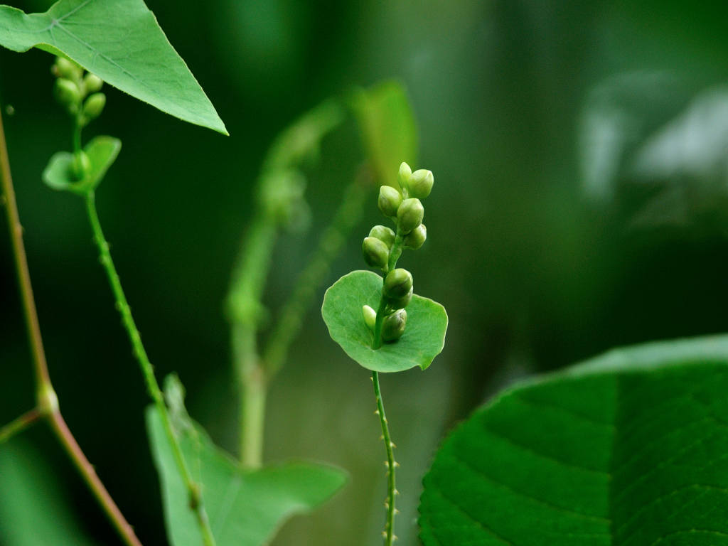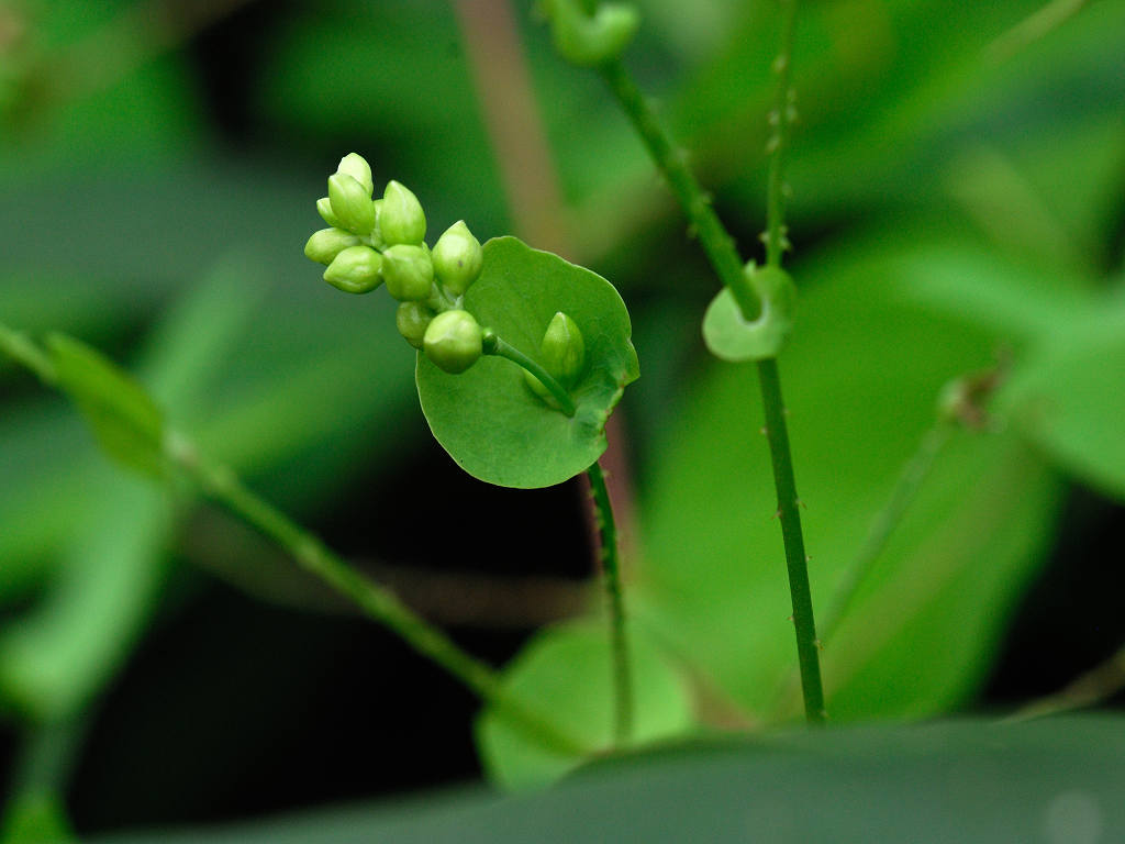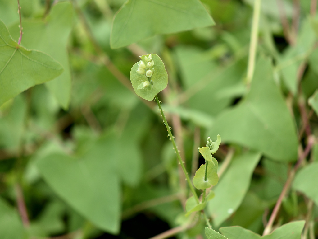 茎には下向きの鋭い刺(逆刺)がある。葉は三角形 枝先の丸い葉のような苞の上に花が10〜20個の小さな花序をつける。花は淡緑色で小さい