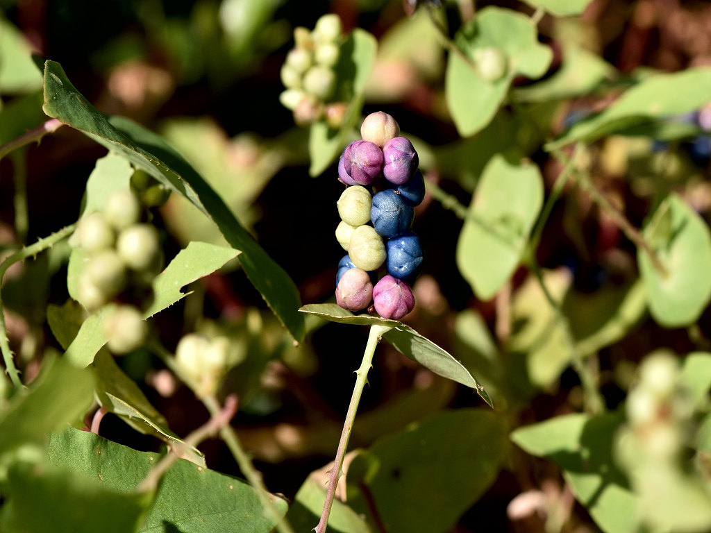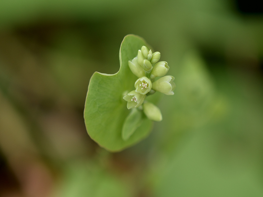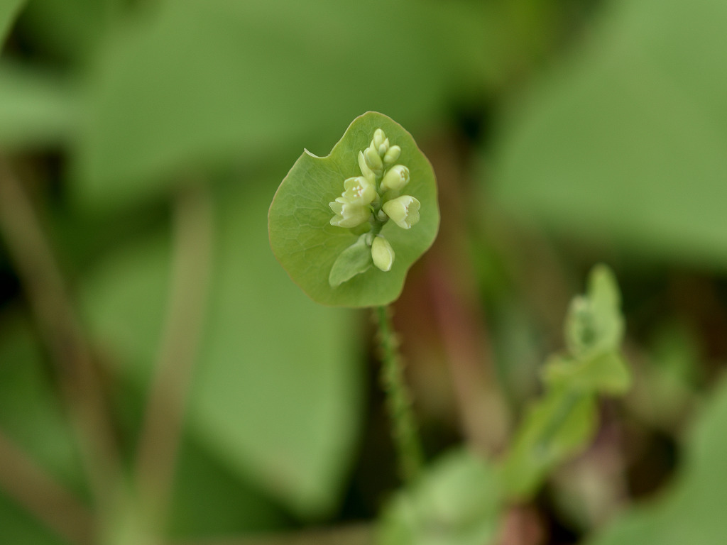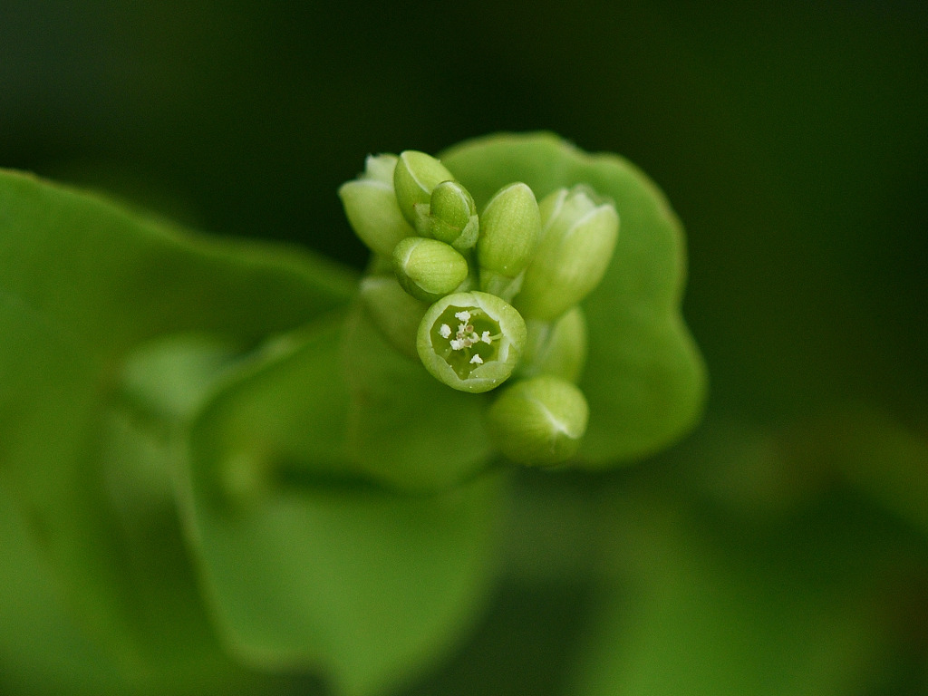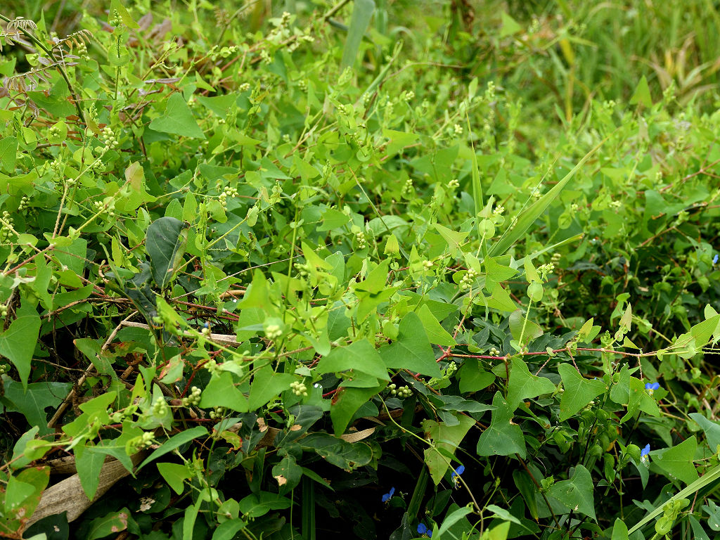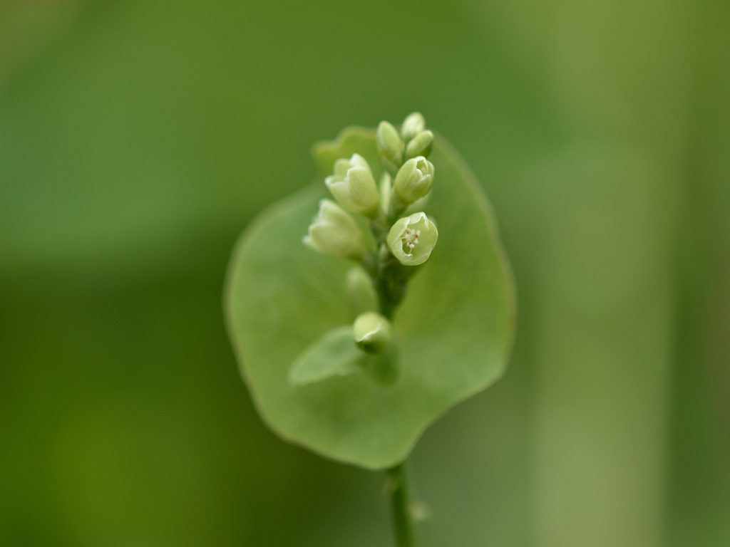 茎には下向きの鋭い刺(逆刺)がある。葉は三角形 枝先の丸い葉のような苞の上に花が10〜20個の小さな花序をつける。花は淡緑色で小さい