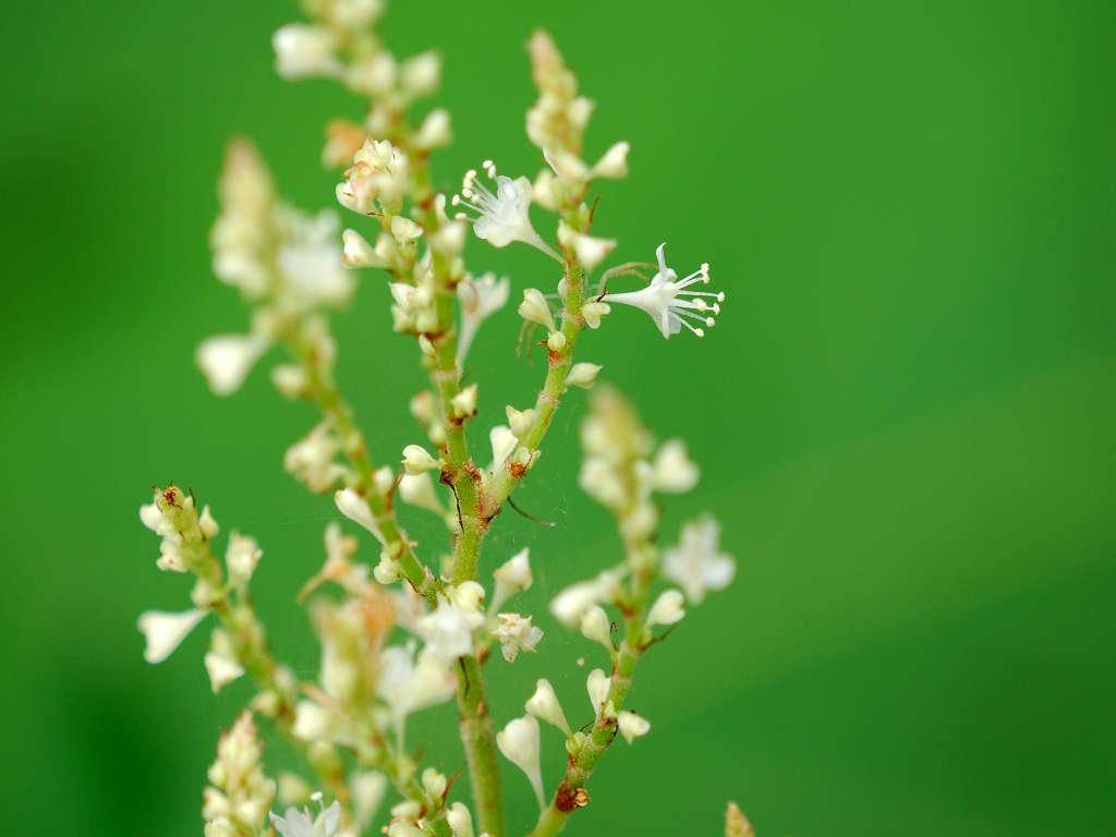 大きめの葉に白い花 葉は楕円形で、互い違いに生える(互生)。 葉のつけ根の部分は水平である (オオイタドリは心形)