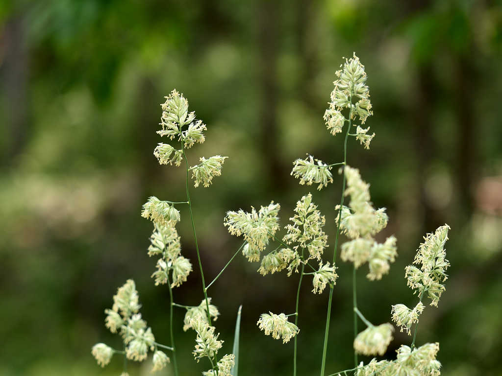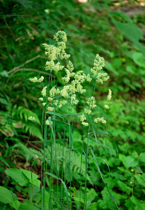 花序は広い円錐形をして長さ10〜20cm。小穂は楕円形、扁平、長さ7〜10mm、毛と短い芒があり、3〜6小花からなる