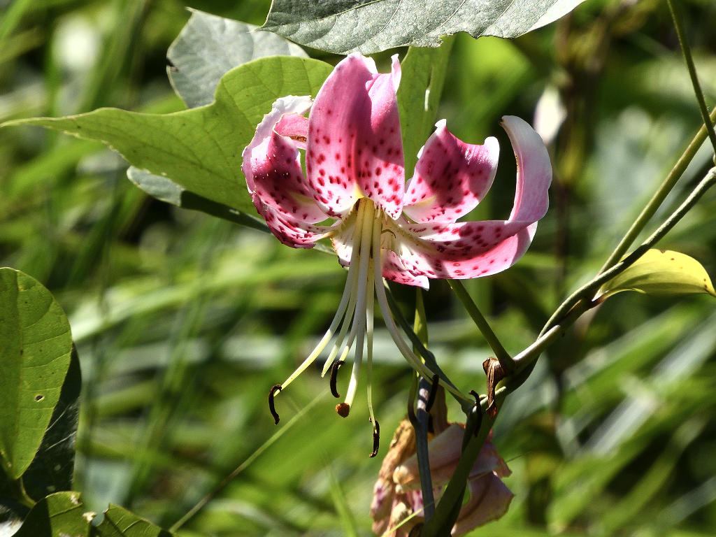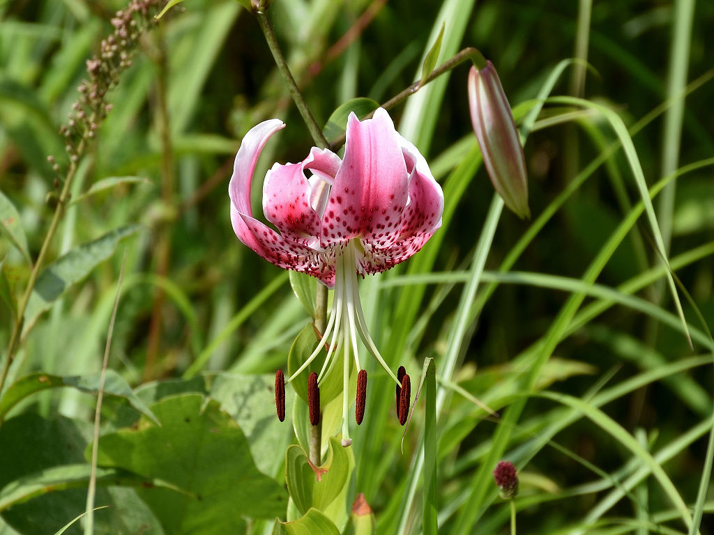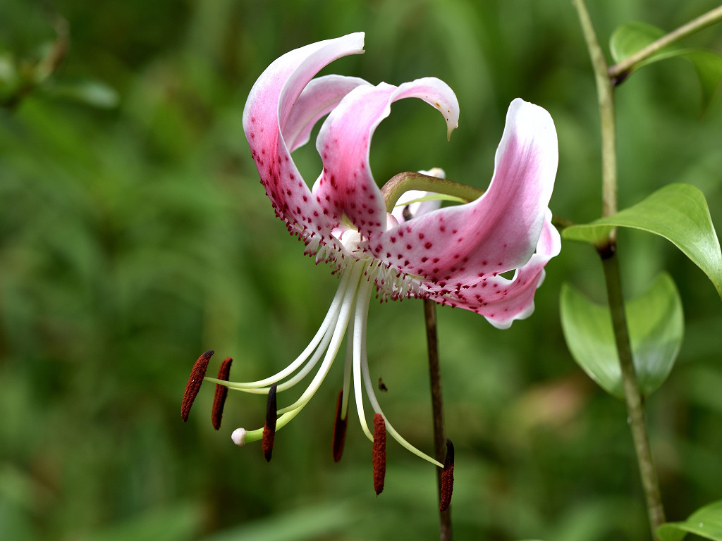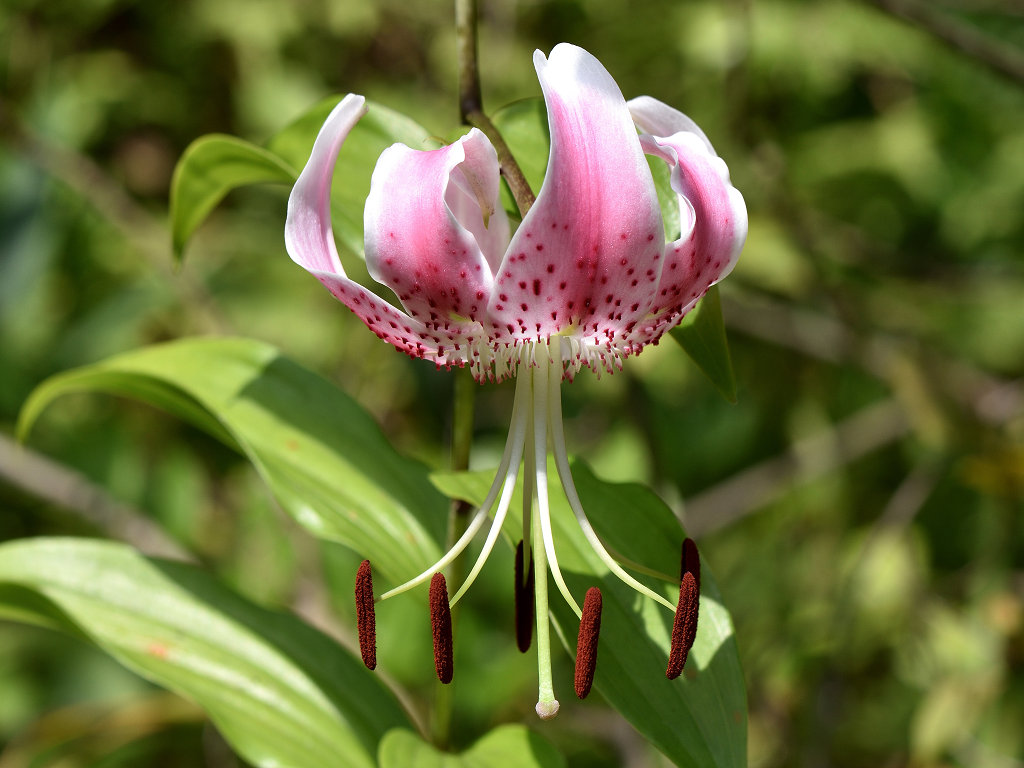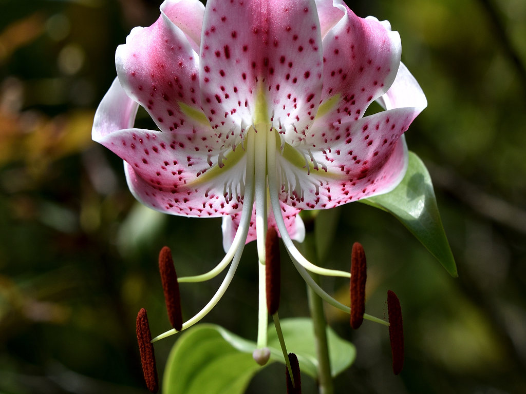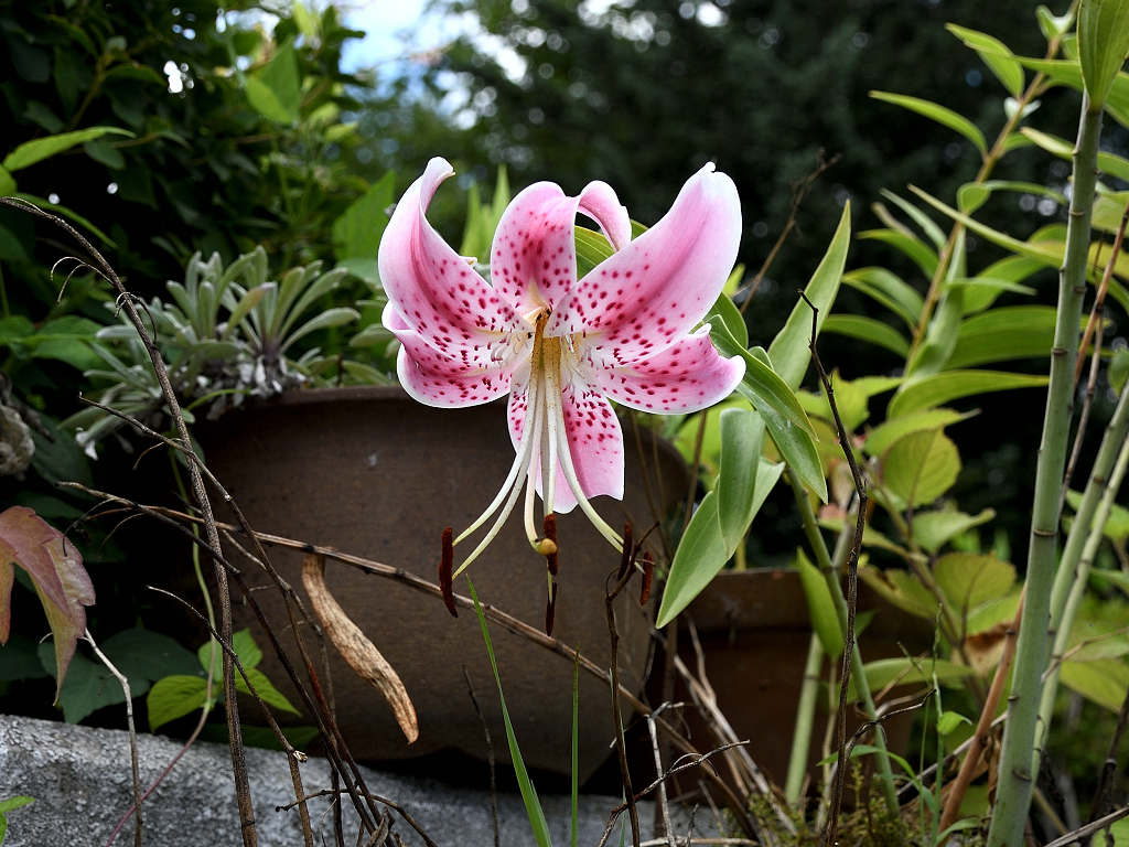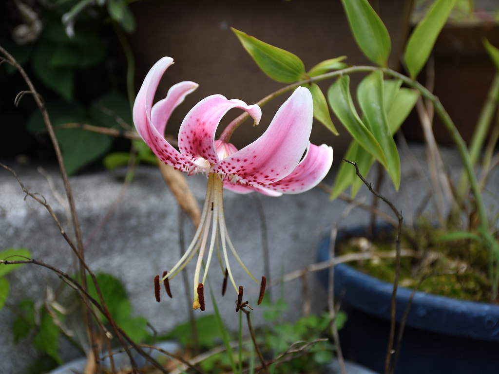 花弁が著しく反転し、鹿子模様、ピンクのブツブツが特徴