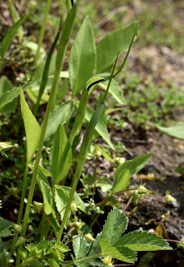 鼻の中から紐状の物が出てくる これを付属体と言っている 葉は根元から葉柄を伸ばしその先に3枚付く