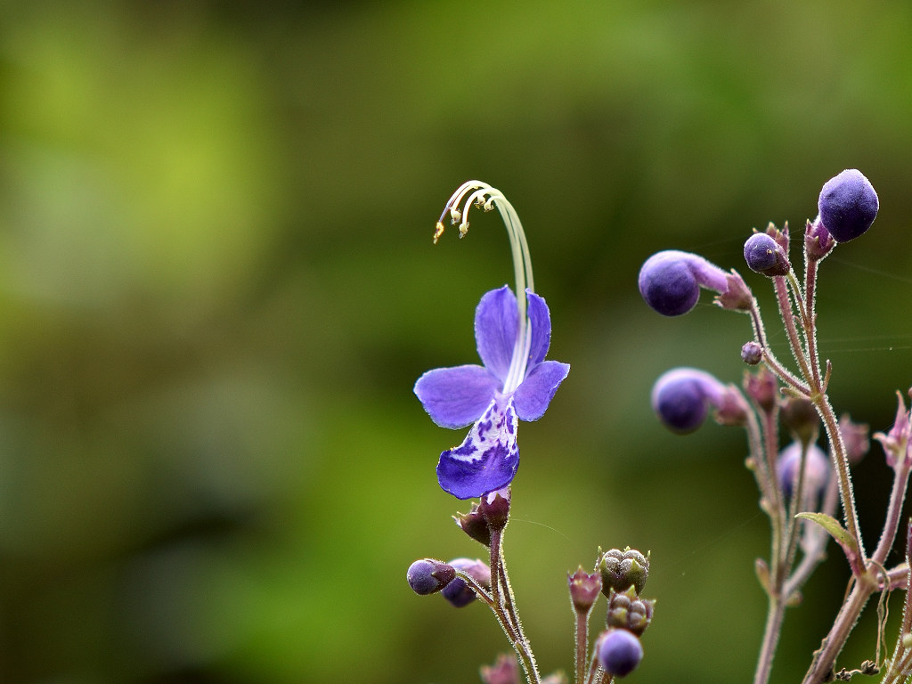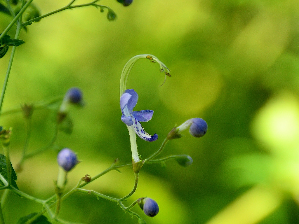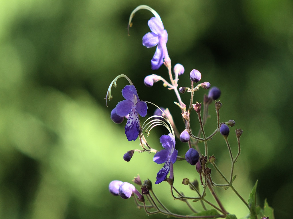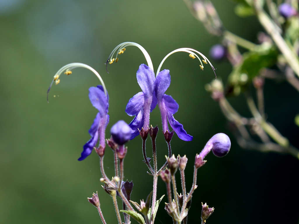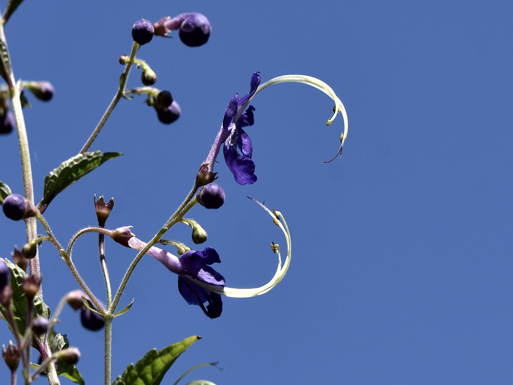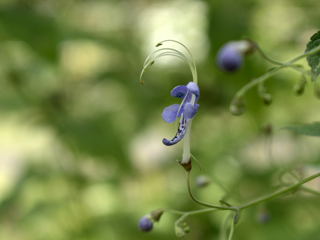 花のつけ根は筒形で、先が5つに裂けている。そのうちの下につく1つの裂片が舌状に長く伸びて上側に曲がり、濃い斑点が入る。雄しべ4本と雌しべは大きく飛び出して弓形に下側へ曲がる