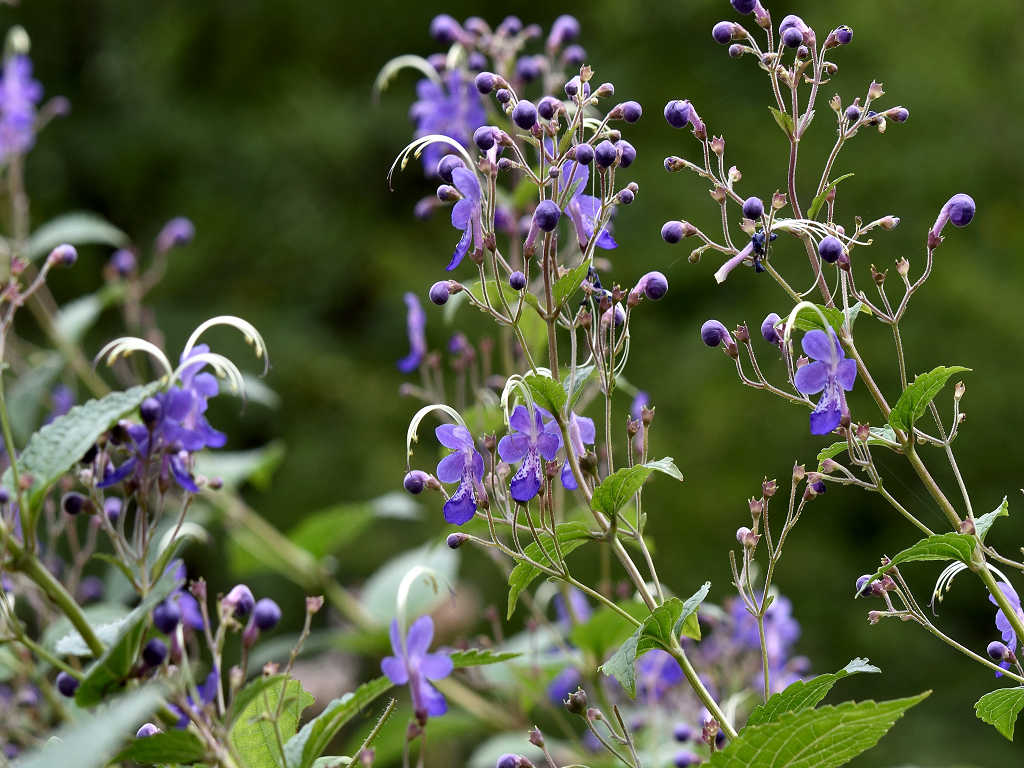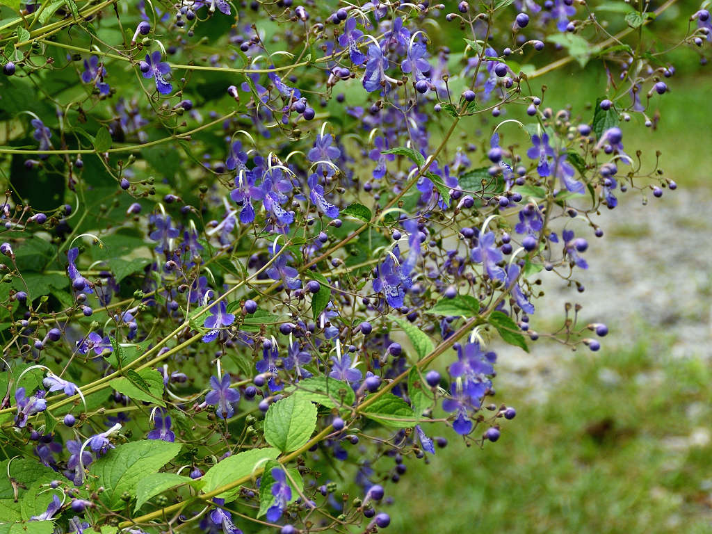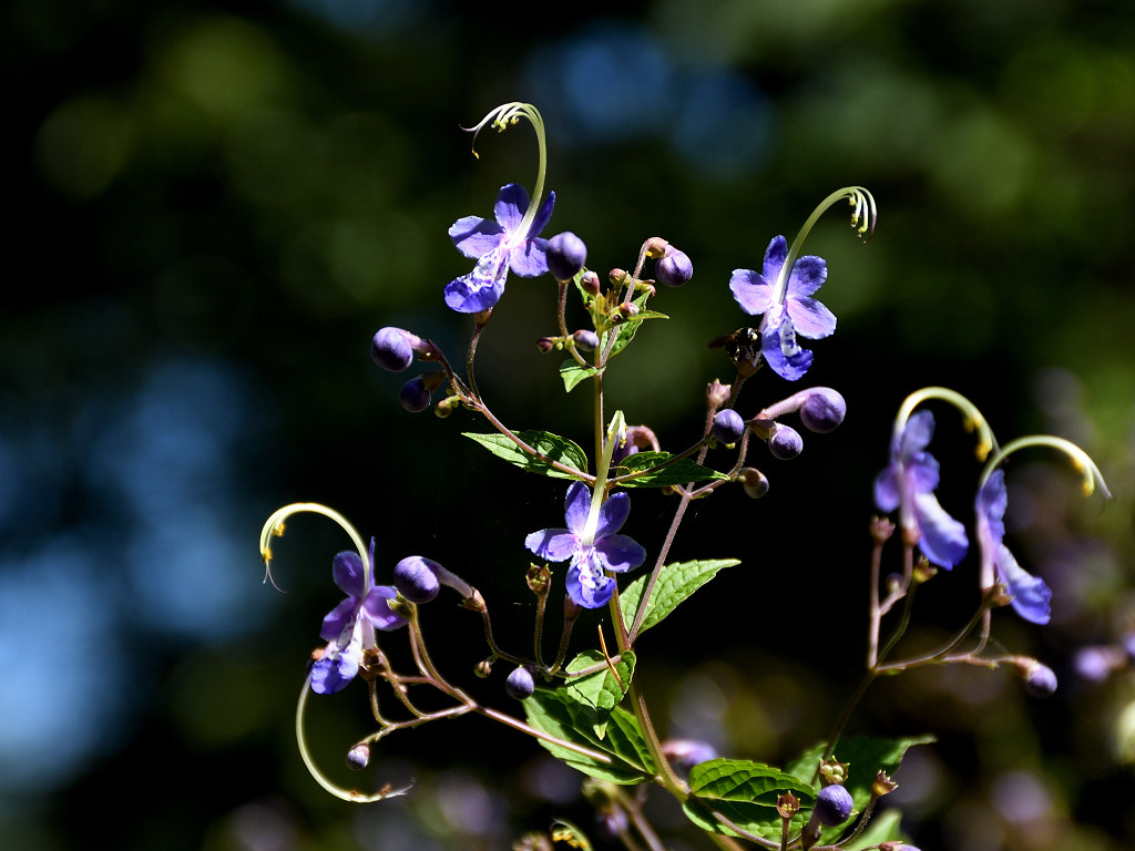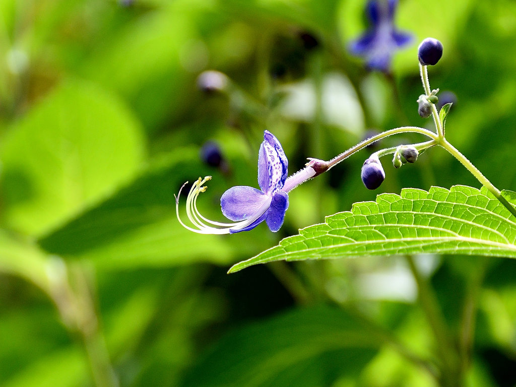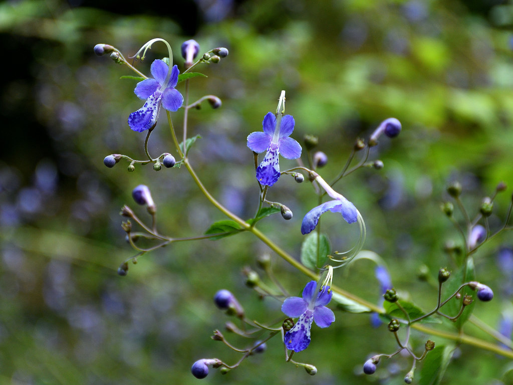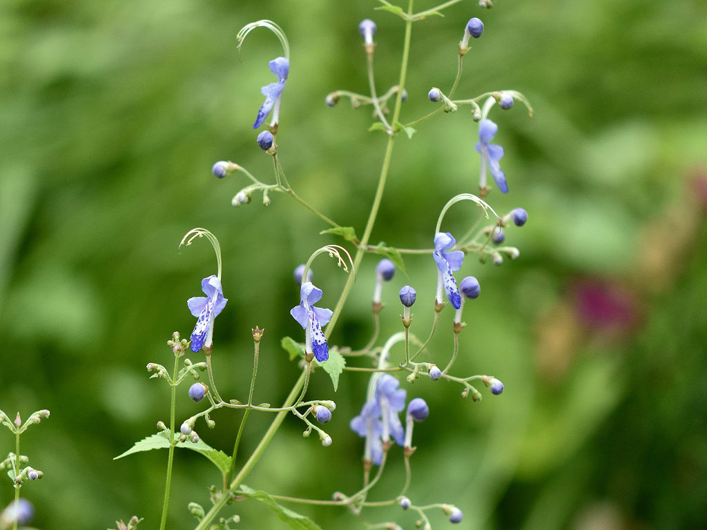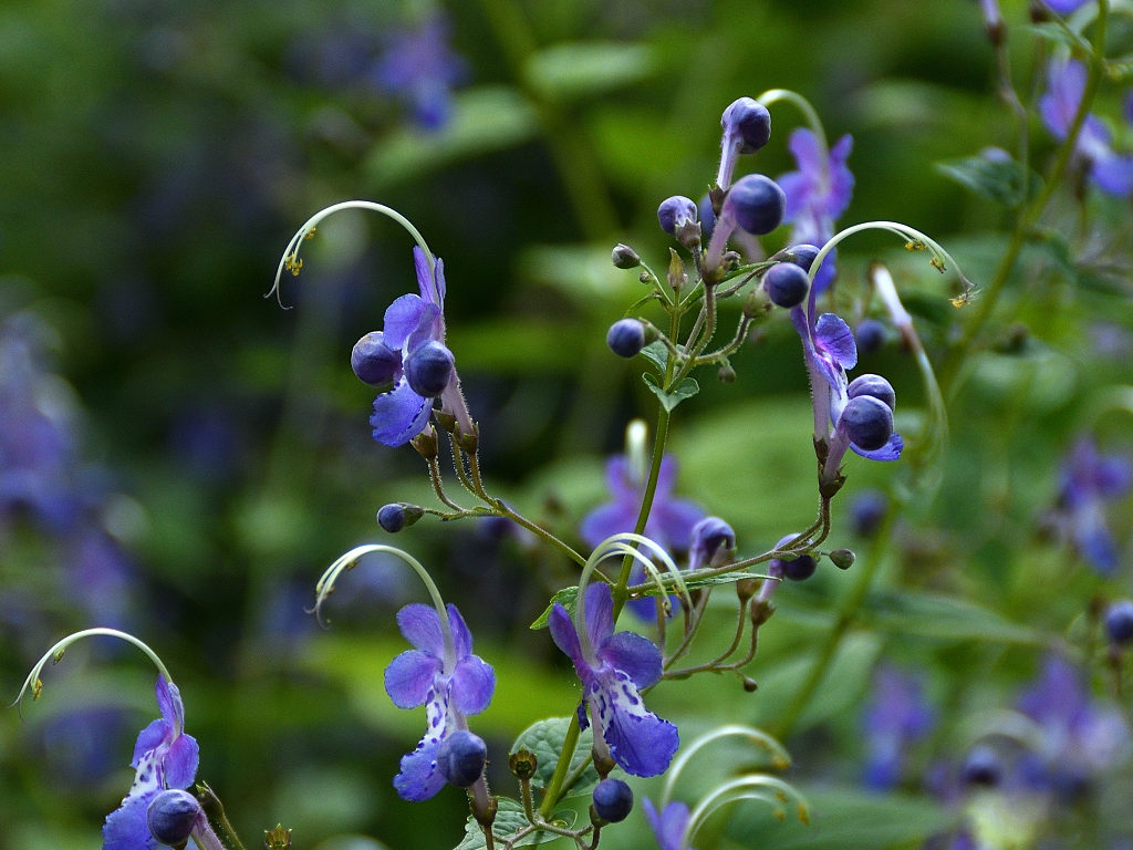 花のつけ根は筒形で、先が5つに裂けている。そのうちの下につく1つの裂片が舌状に長く伸びて上側に曲がり、濃い斑点が入る。雄しべ4本と雌しべは大きく飛び出して弓形に下側へ曲がる