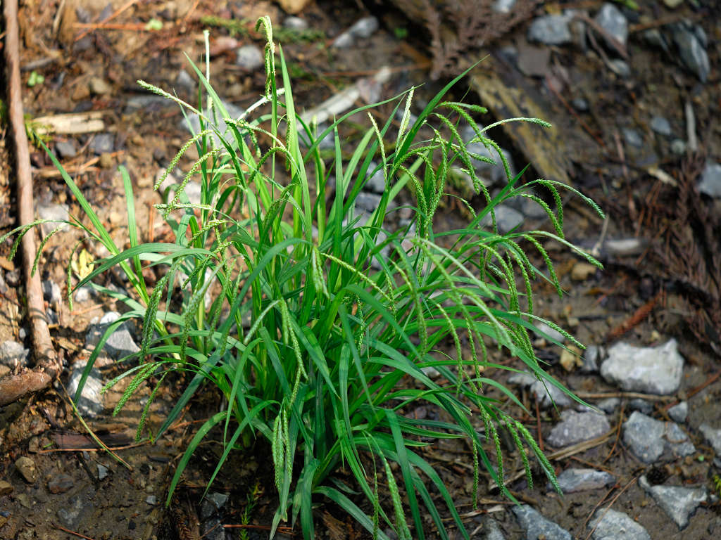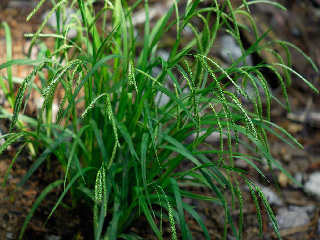 花期には葉と花茎とほぼ同長、その後、花茎が伸びる。小穂は4〜6個、やや近接してつき、細くて長い柄がつき、稔るほど垂れ下がる