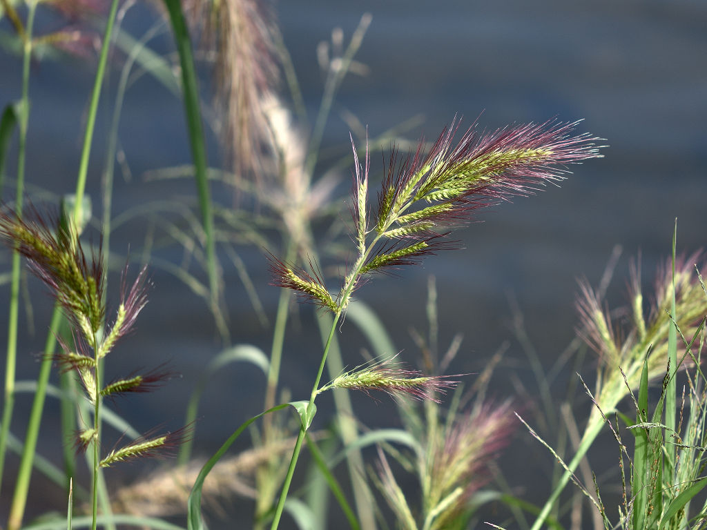 茎から多数分枝して緑色〜紫褐色の小穂を密につける。花穂は円錐状で小穂は長さ3〜4ミリの卵形、先は鋭くとがり2〜4センチの長い紫褐色の芒がある