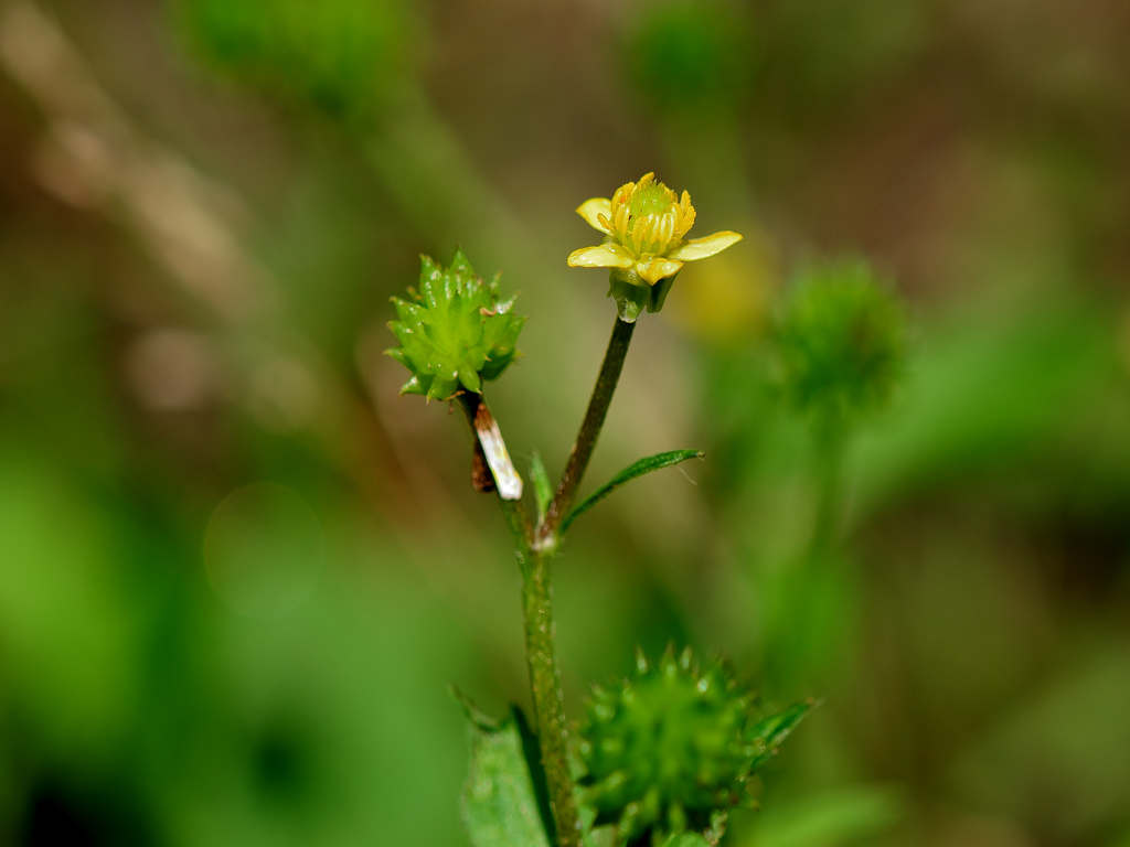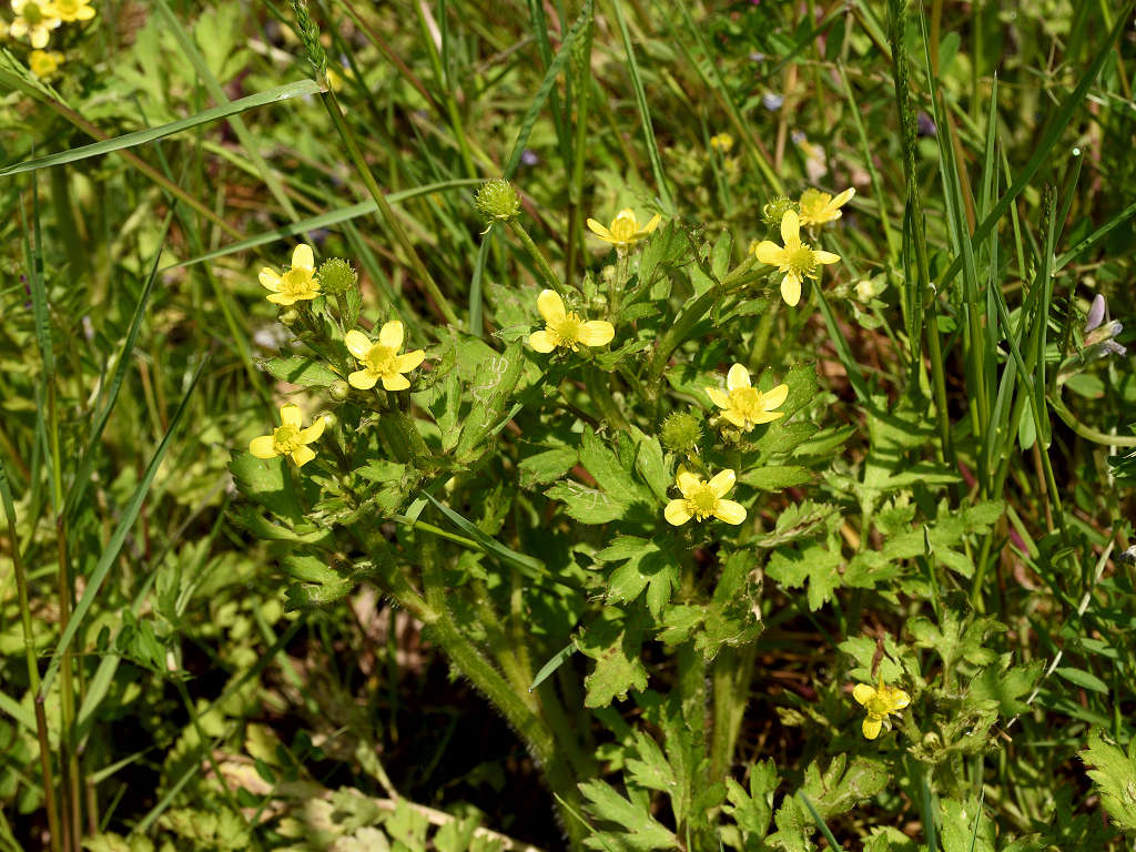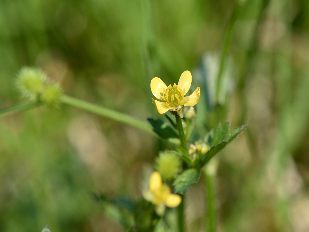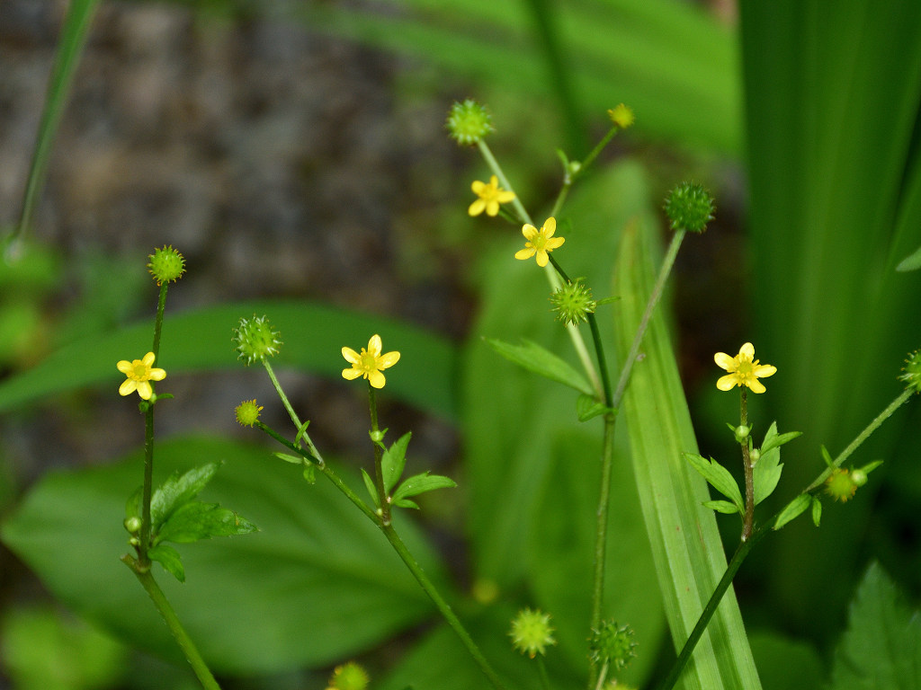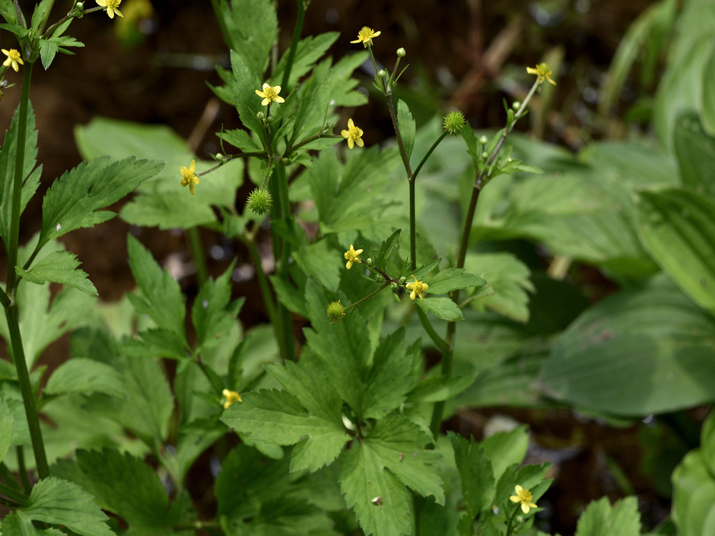 「キツネノボタン」に似ているが そう果の先は強く反転しない。小葉の裂片は重ならない。茎には開出毛がある