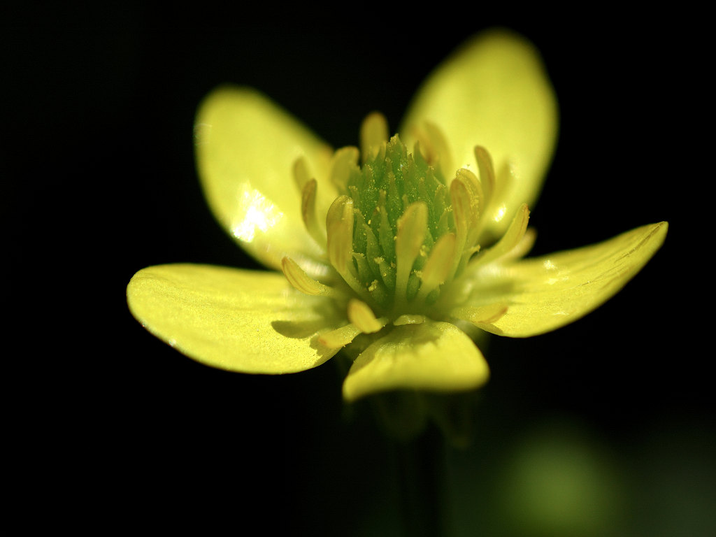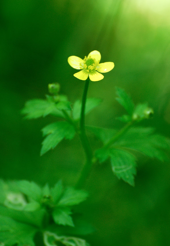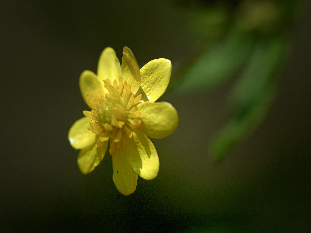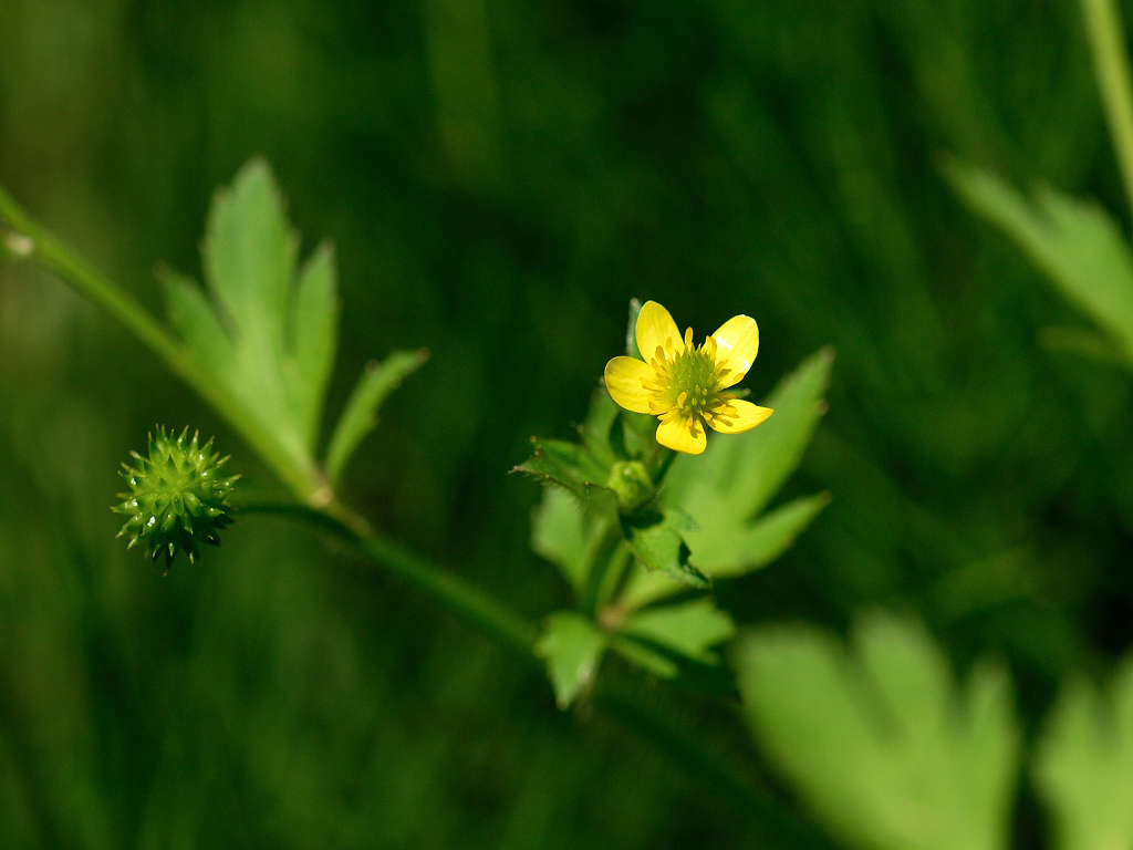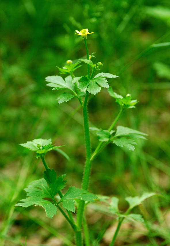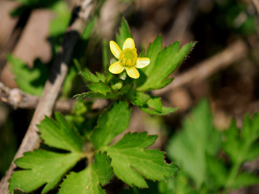 「キツネノボタン」に似ているが そう果の先は強く反転しない。小葉の裂片は重ならない。茎には開出毛がある